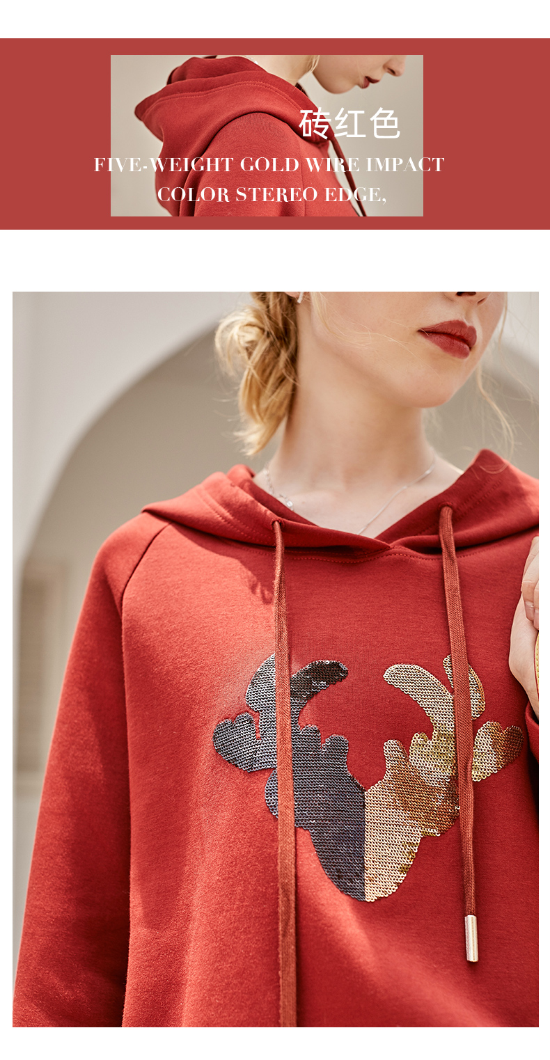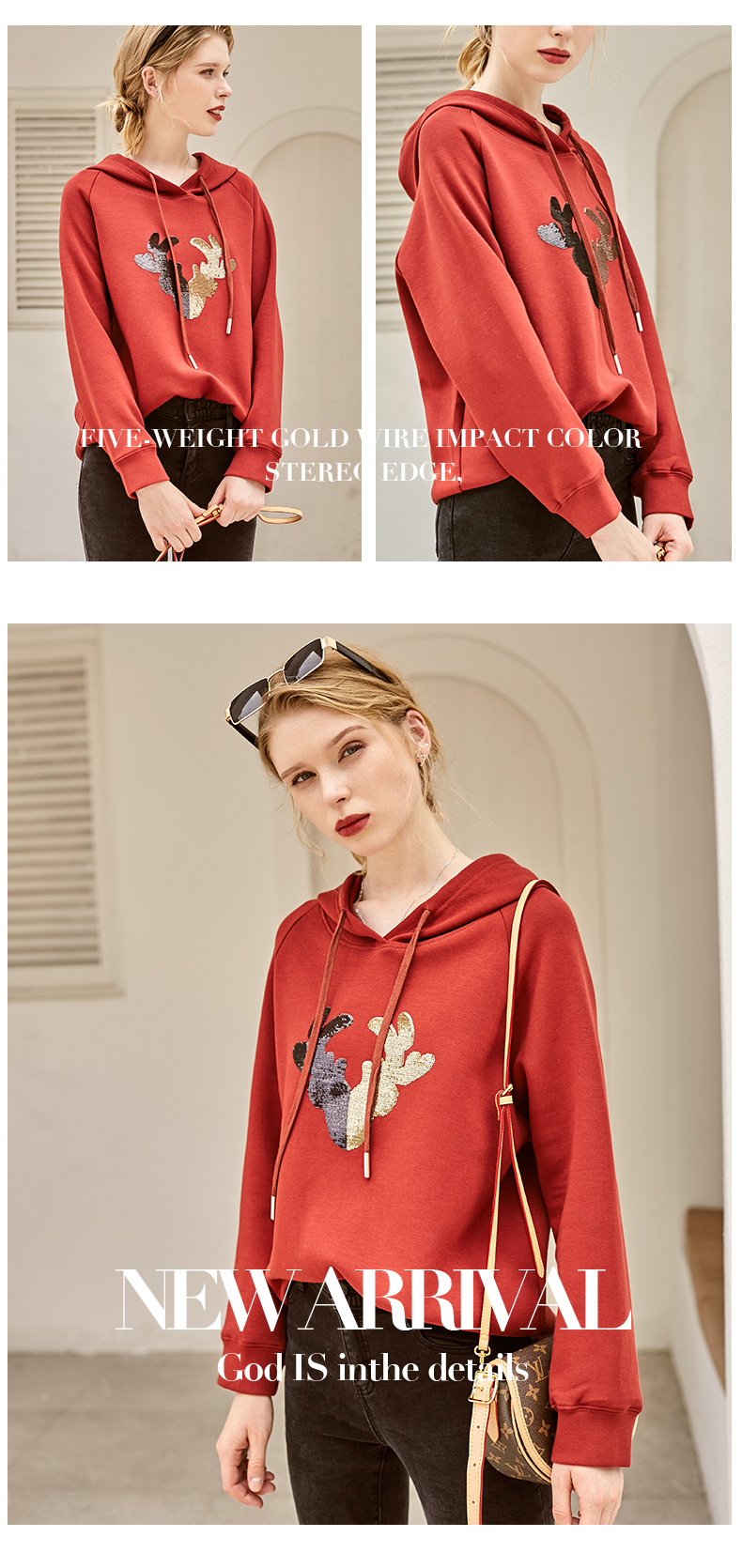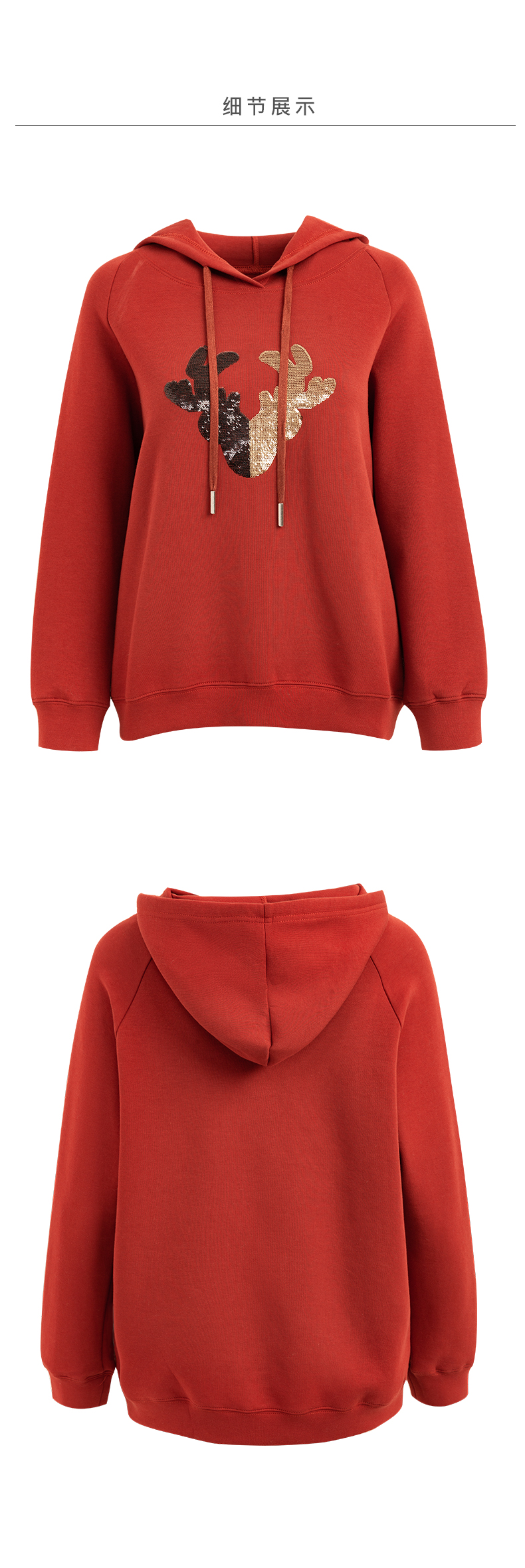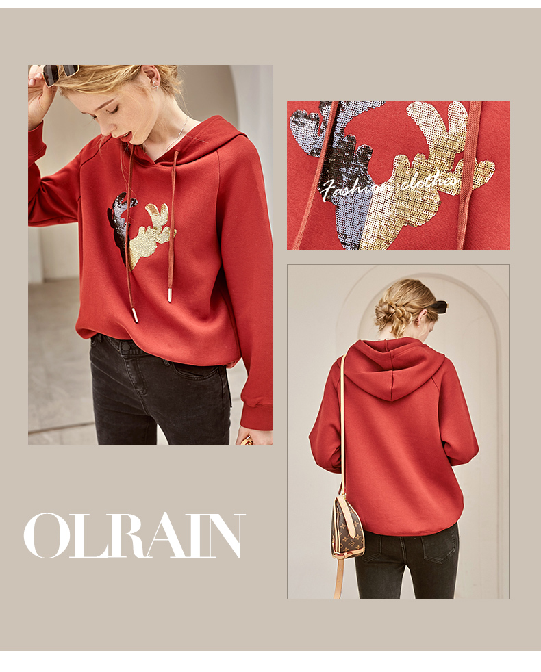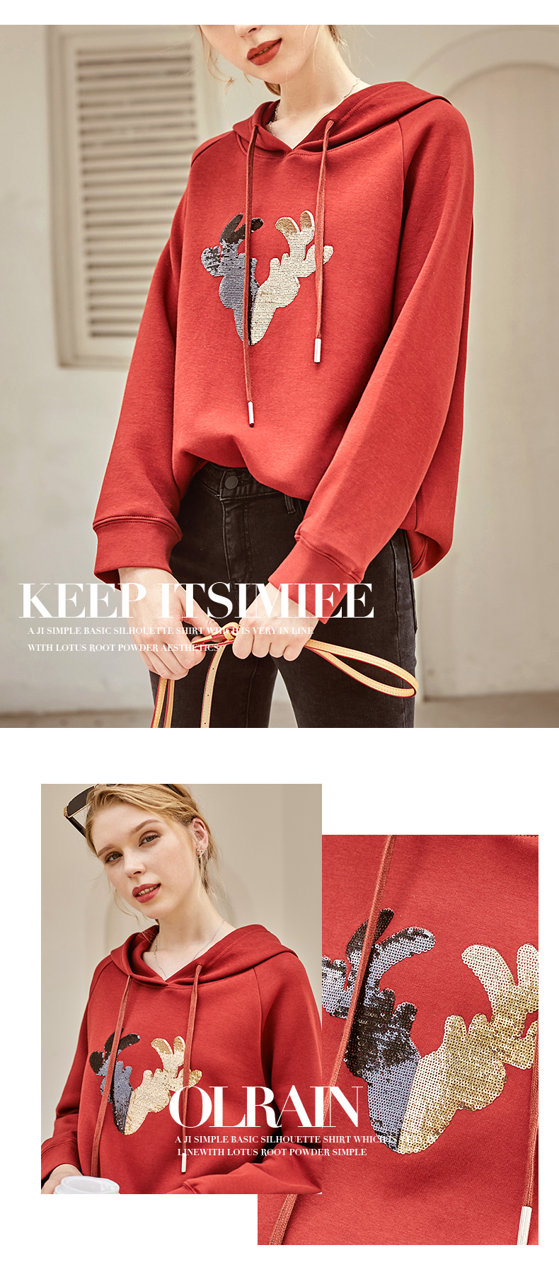 OLrain欧芮儿法式太空棉连帽卫衣女早春2023新款宽松鹿角刺绣上衣
