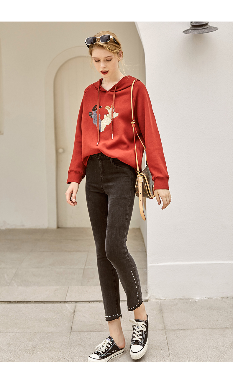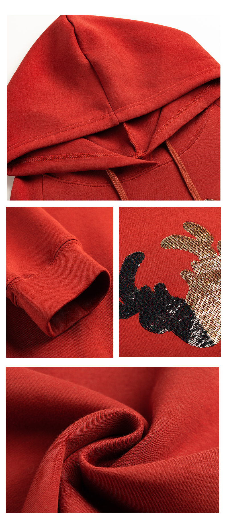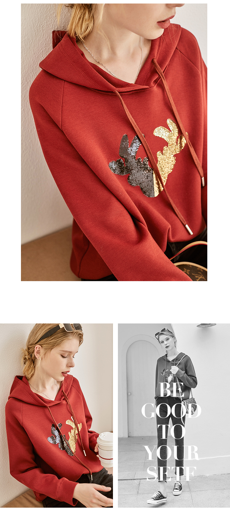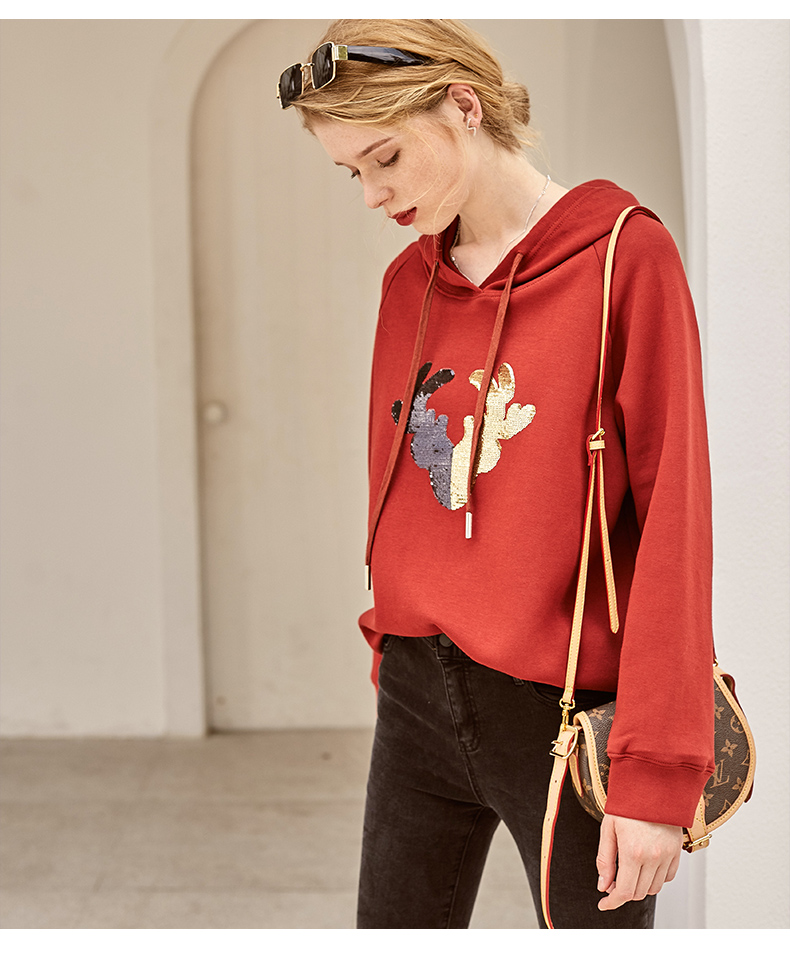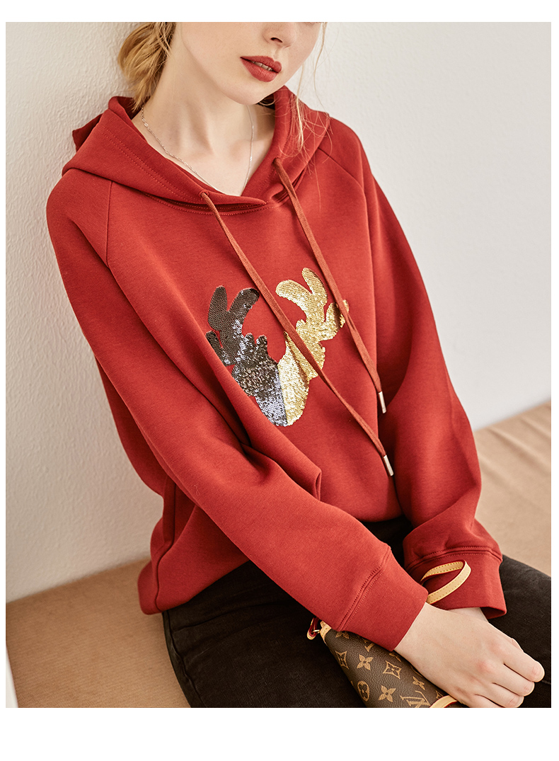 OLrain欧芮儿法式太空棉连帽卫衣女早春2023新款宽松鹿角刺绣上衣