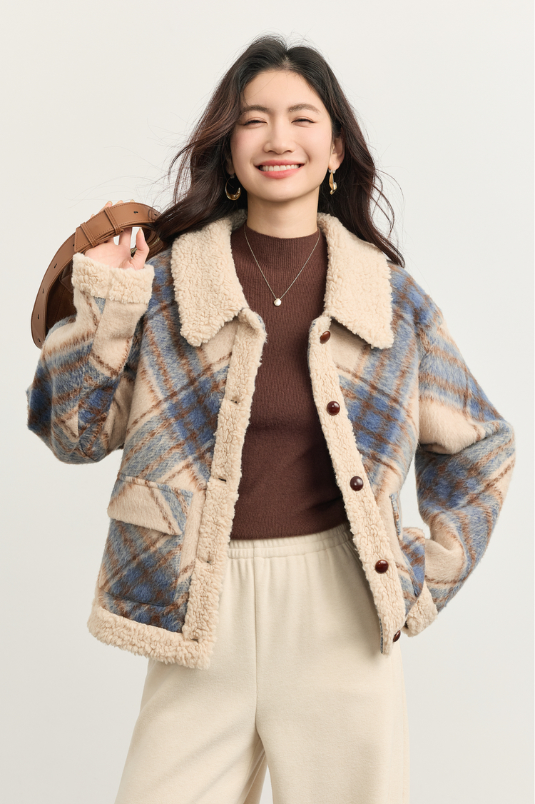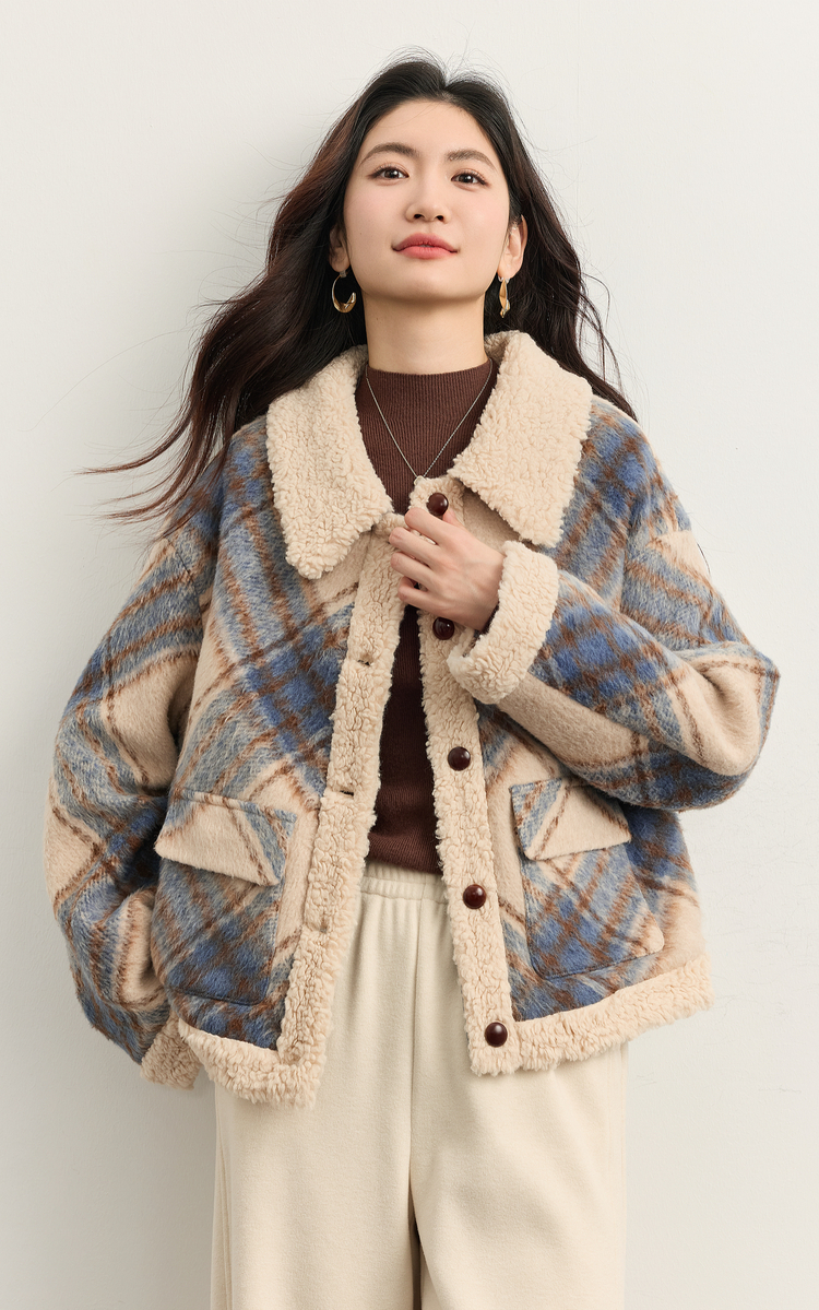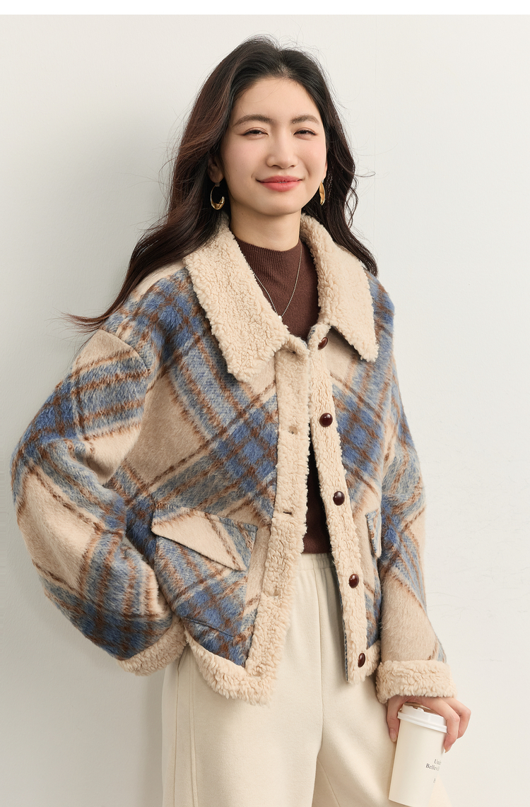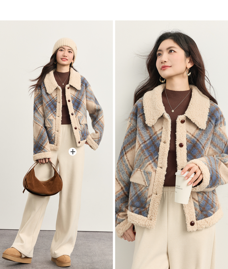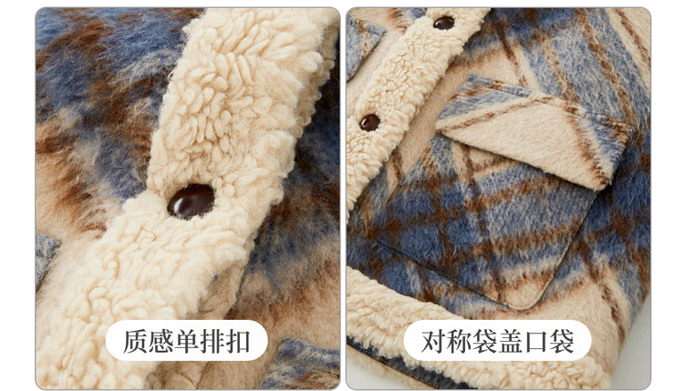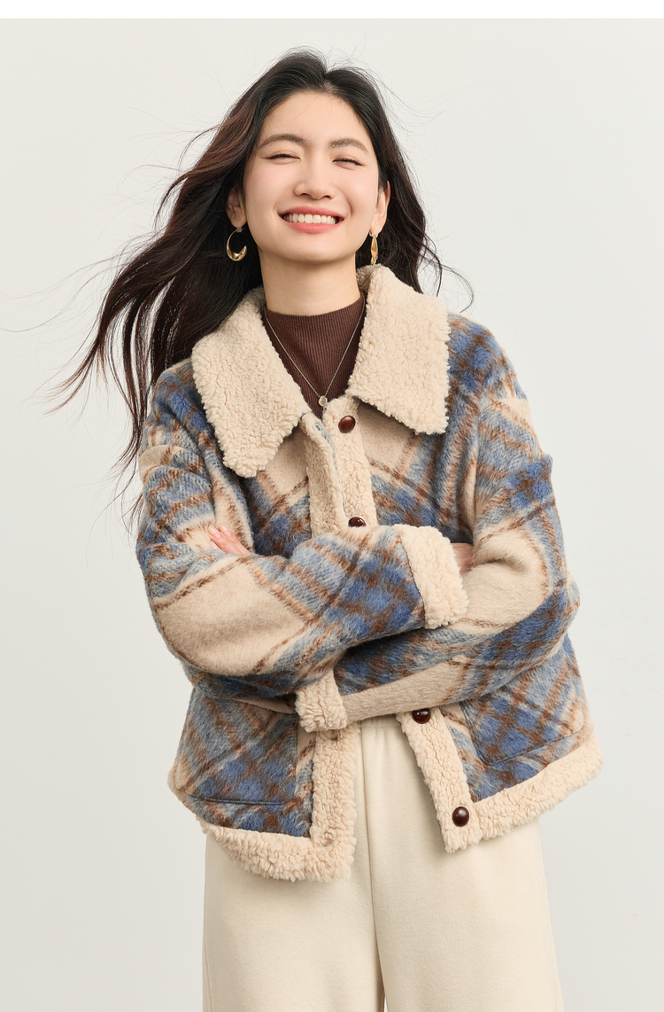 【11/26新品】熙世界小香风仿羊羔毛绒翻领格纹短外套女装冬季复古夹棉毛呢大衣