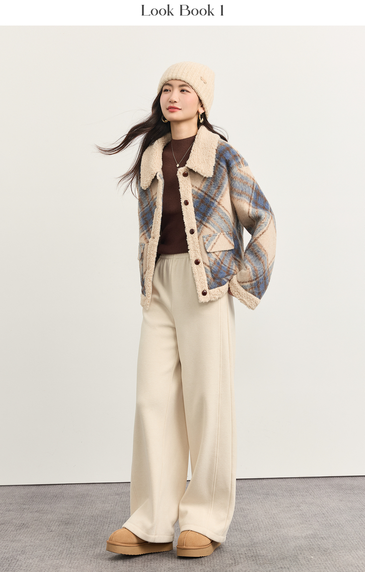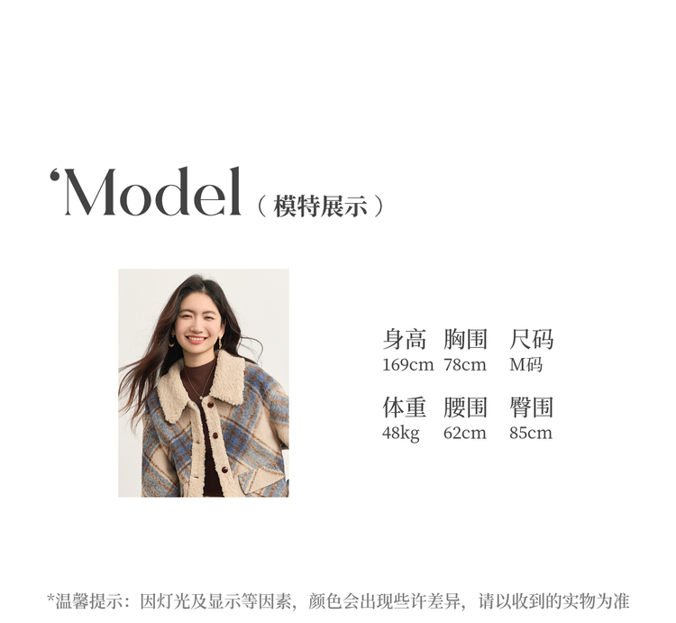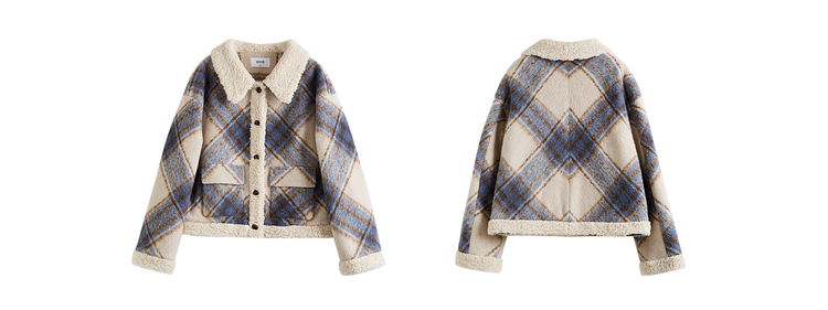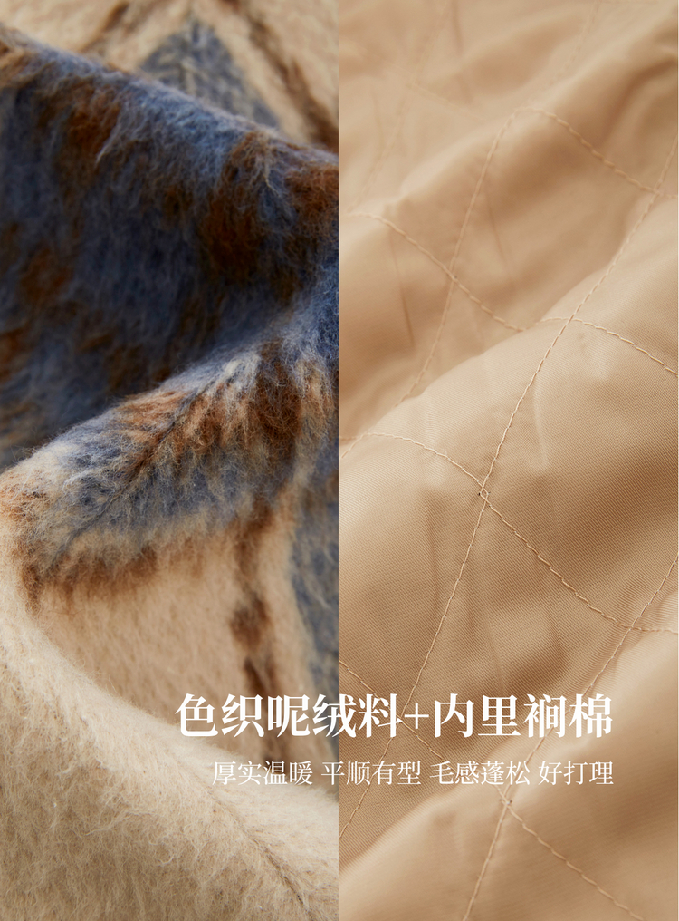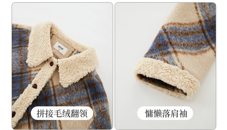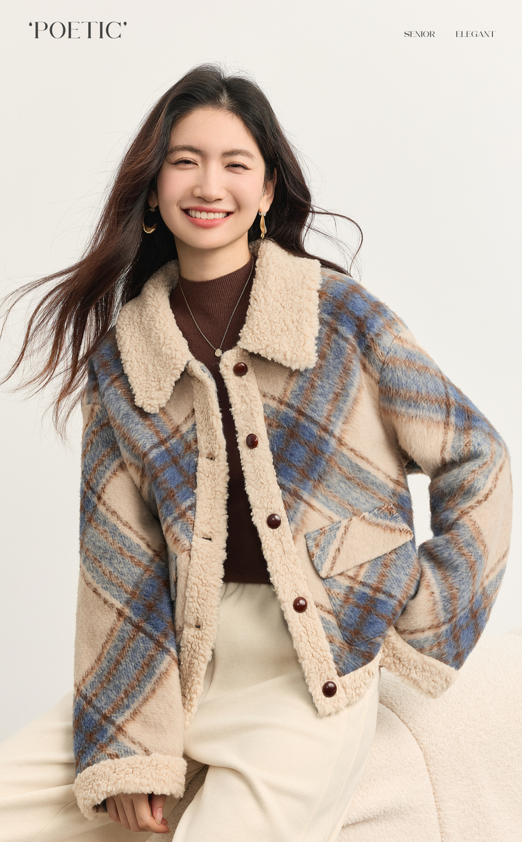 【11/26新品】熙世界小香风仿羊羔毛绒翻领格纹短外套女装冬季复古夹棉毛呢大衣
