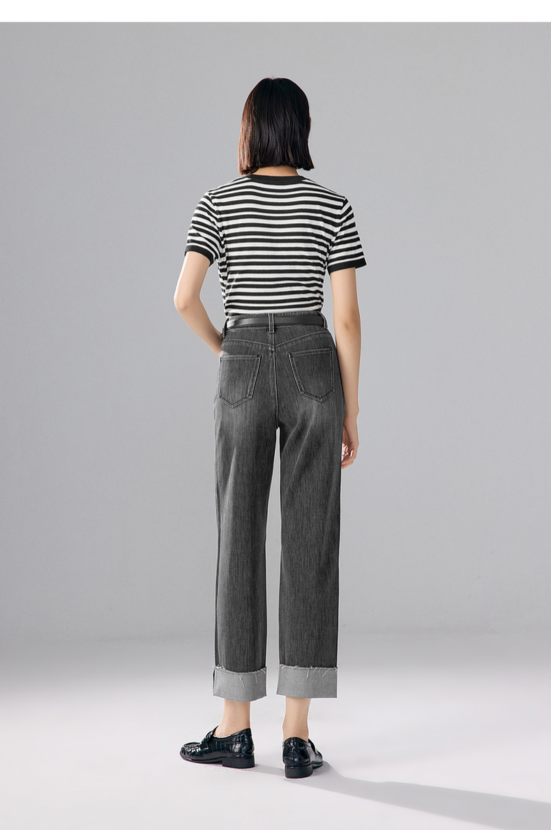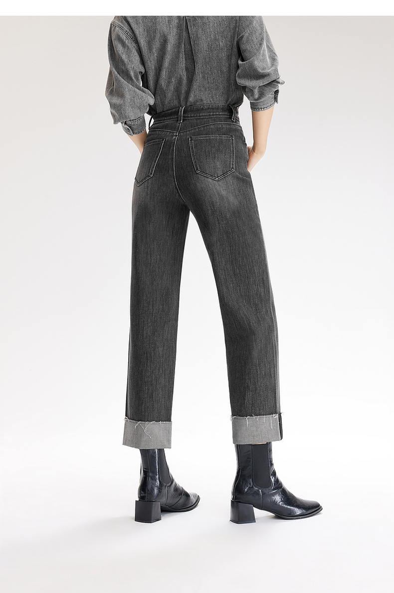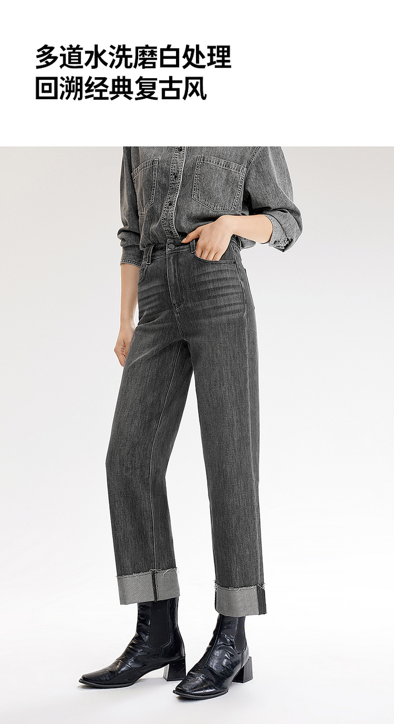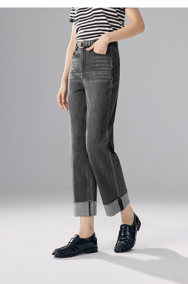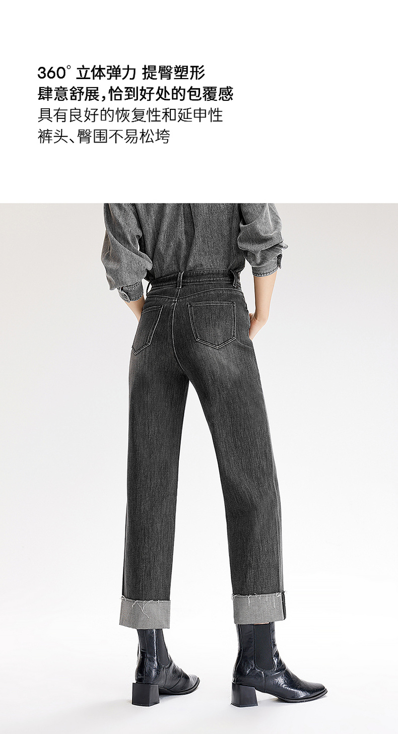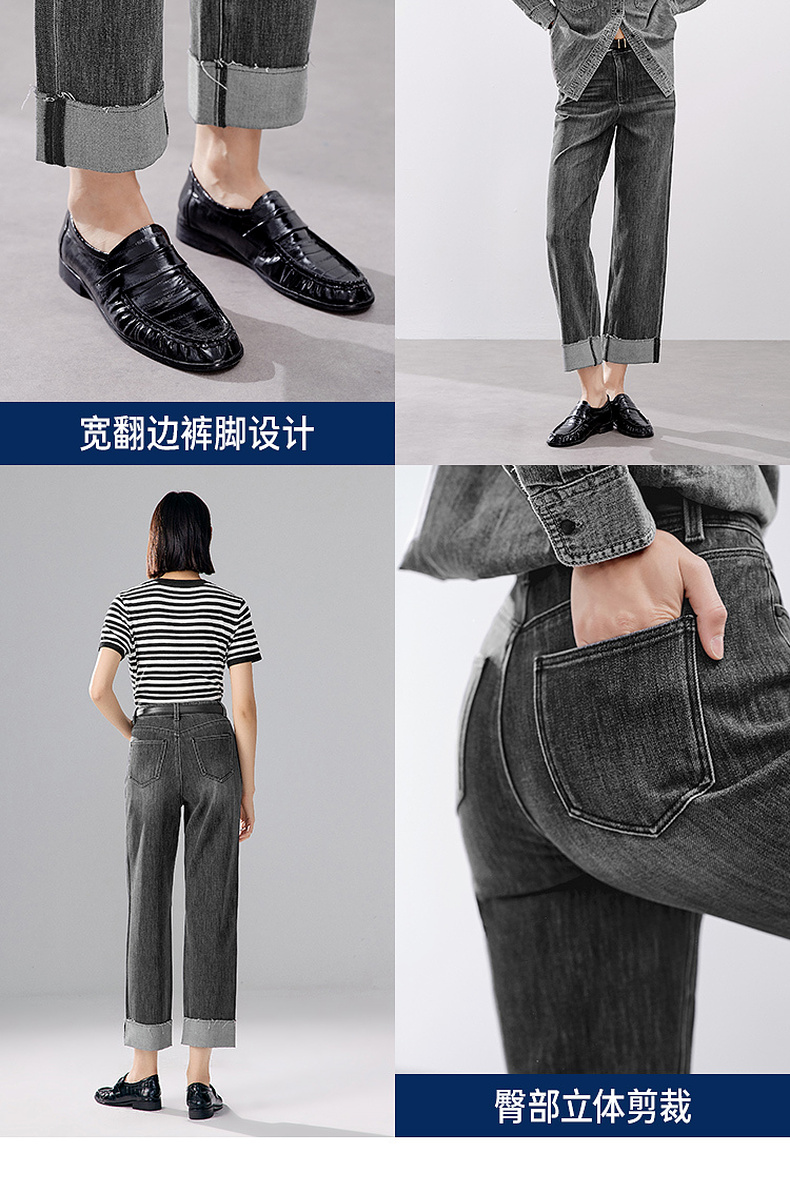 【严选】伊芙丽高弹力翻脚口显瘦百搭复古牛仔裤女2024秋装新款通勤裤子1F7951291