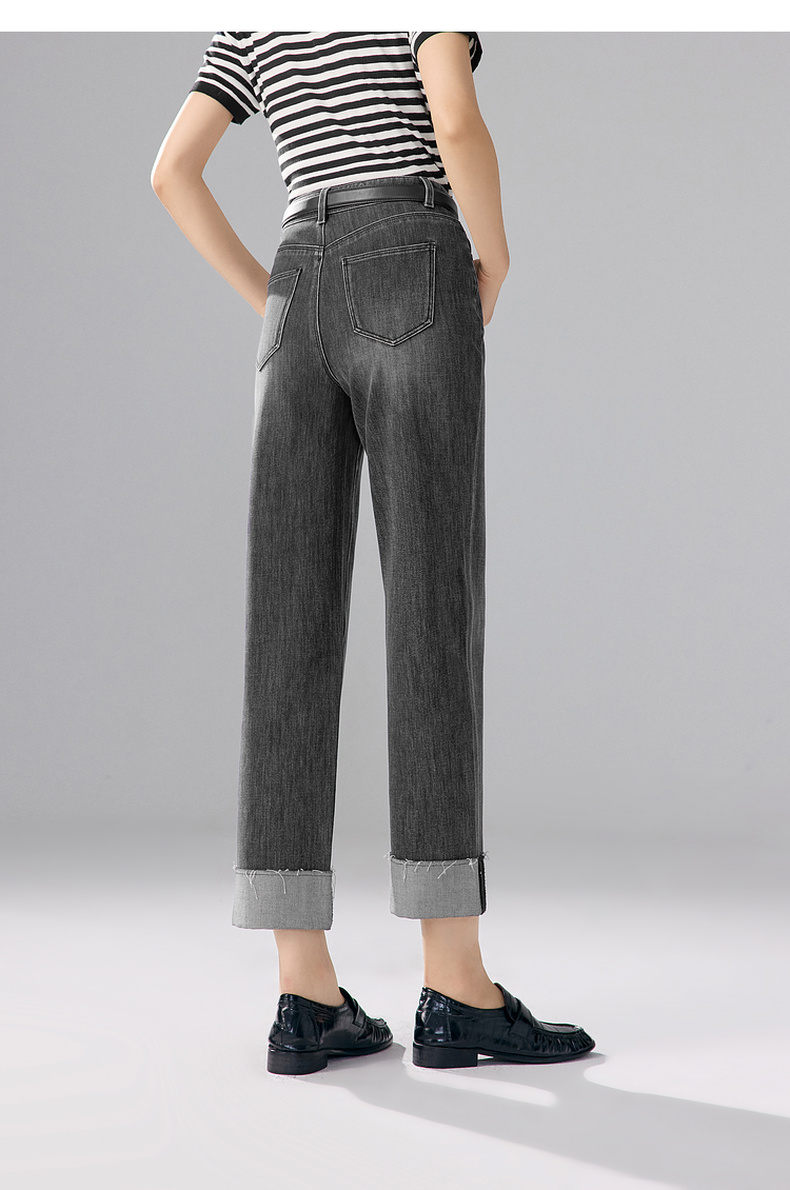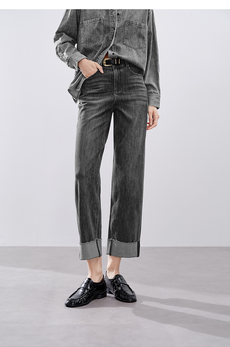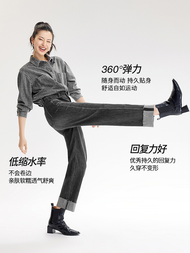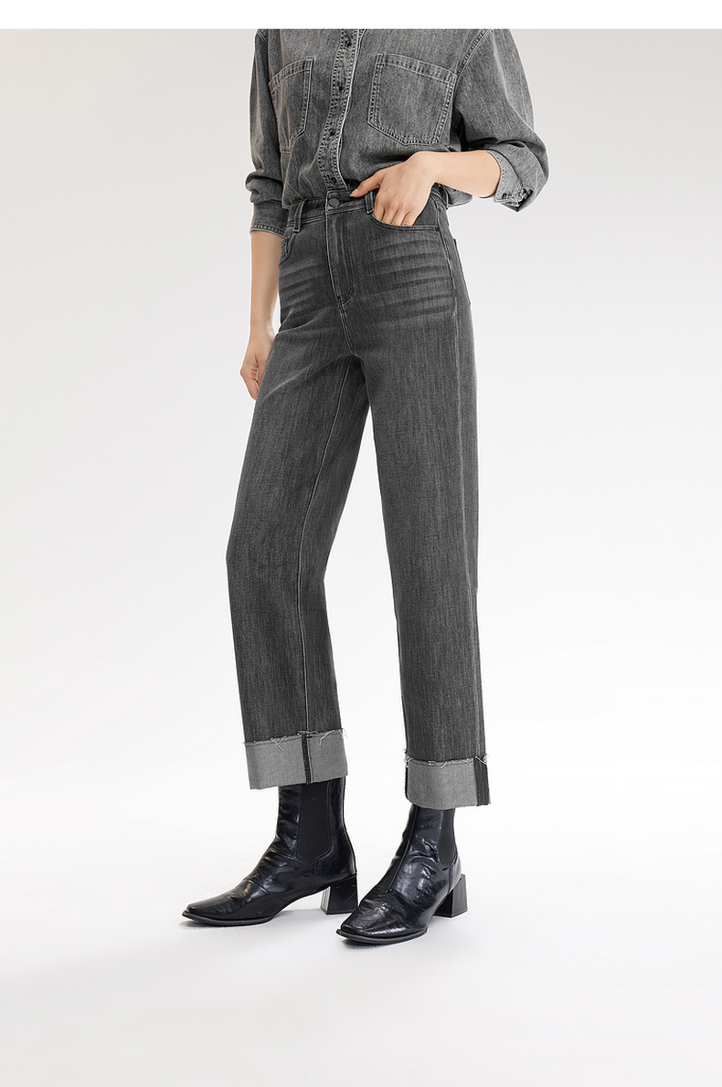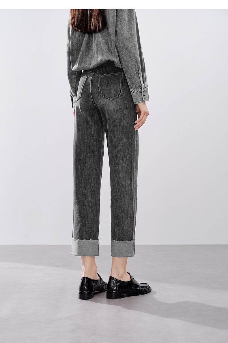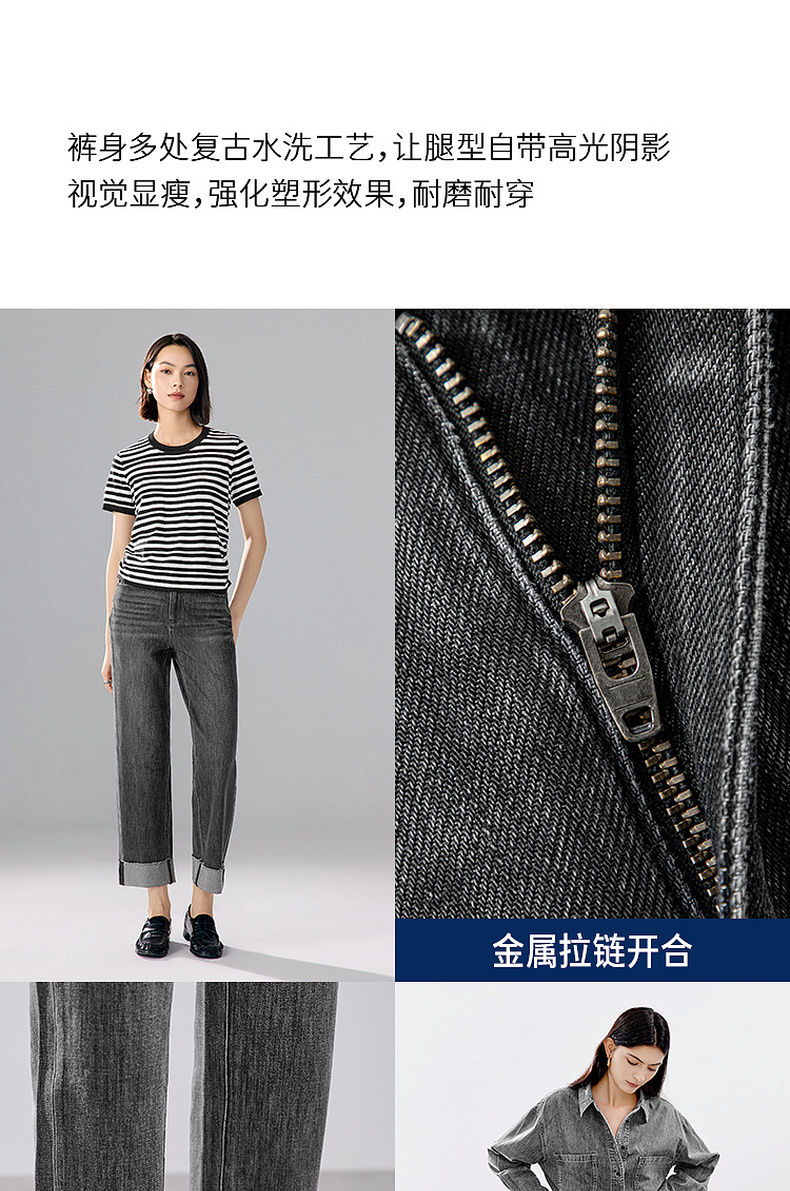 【严选】伊芙丽高弹力翻脚口显瘦百搭复古牛仔裤女2024秋装新款通勤裤子1F7951291