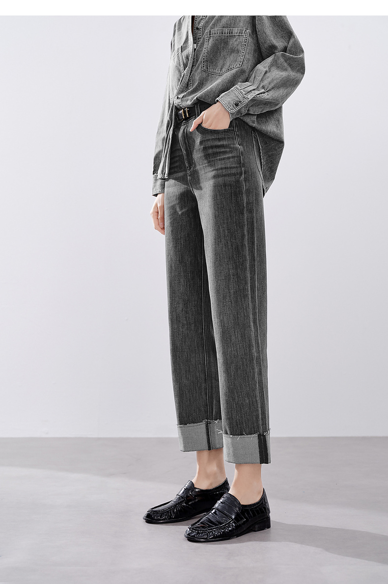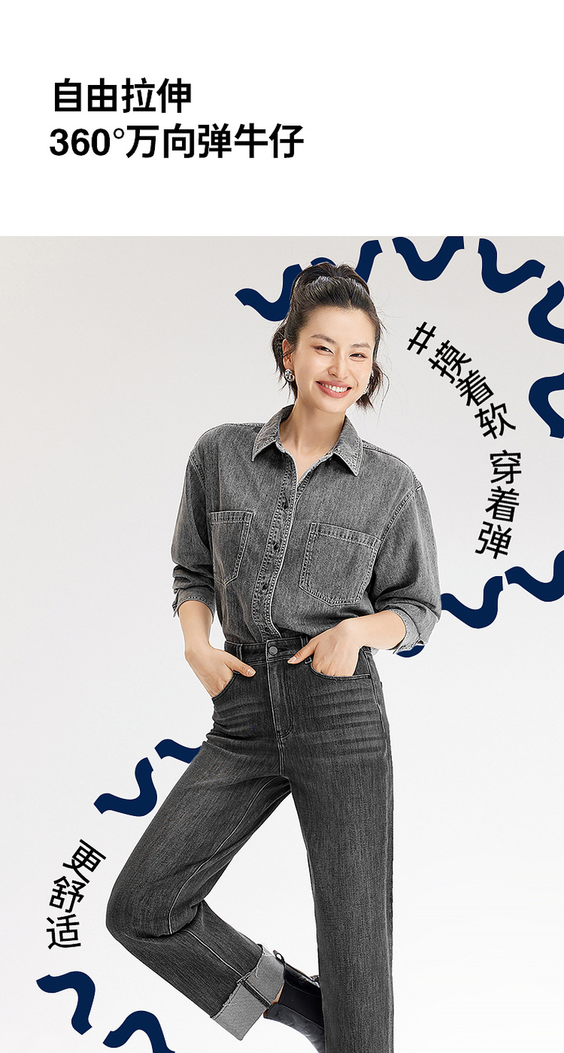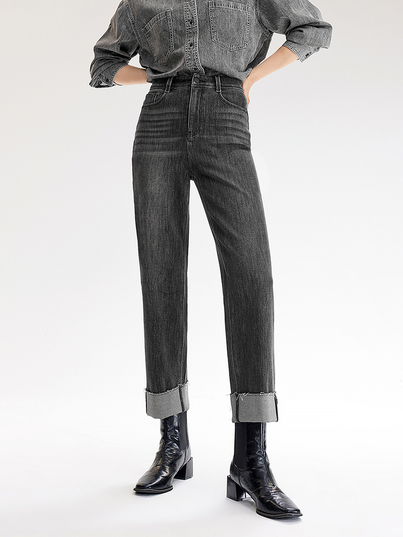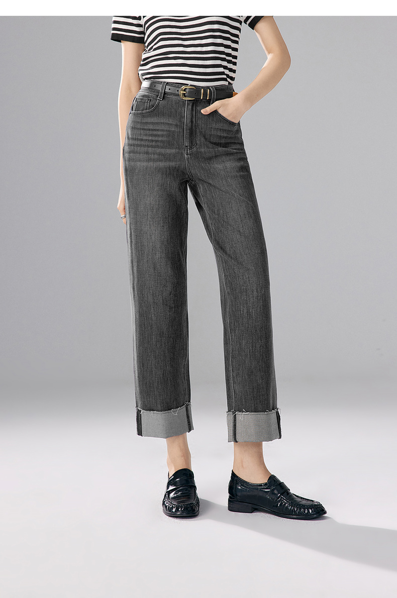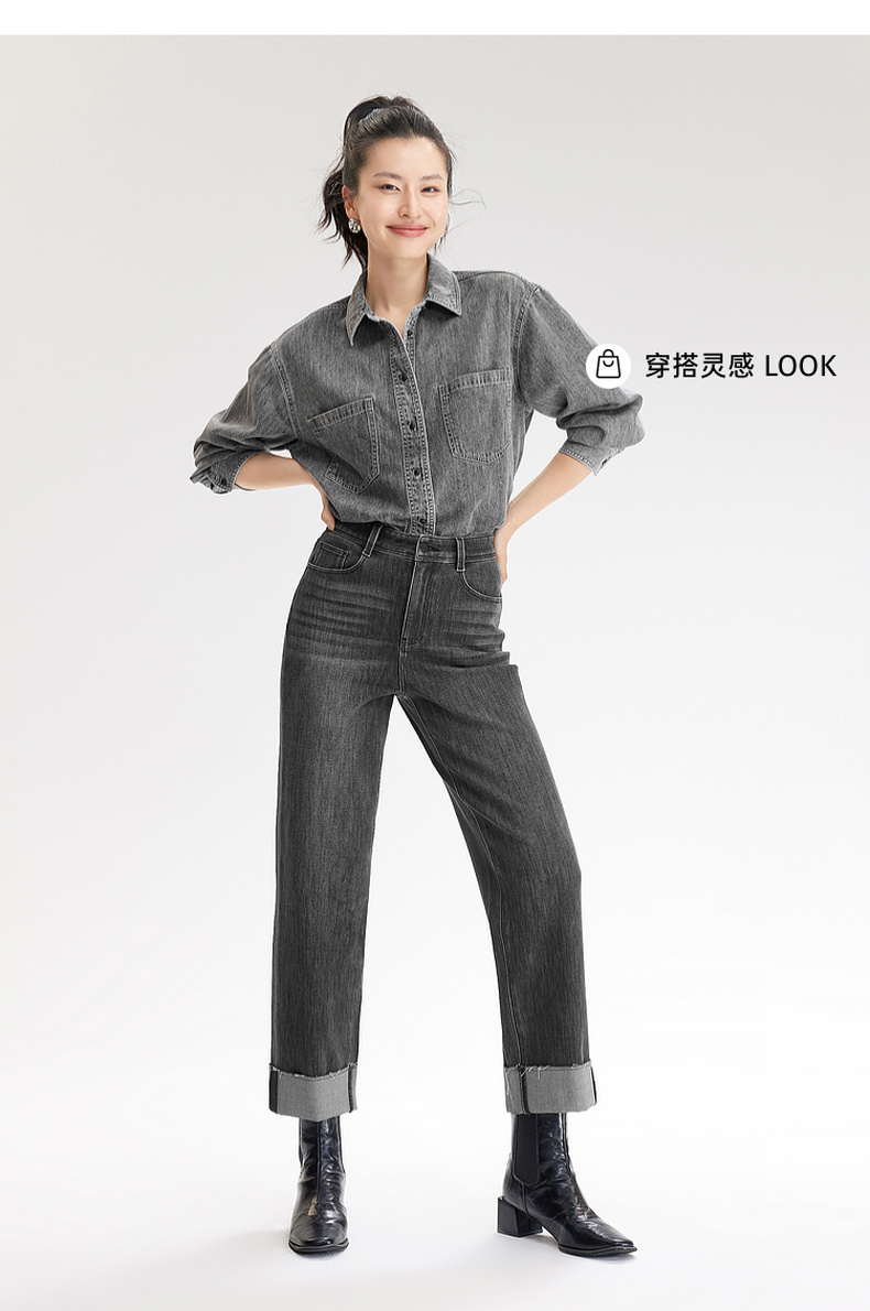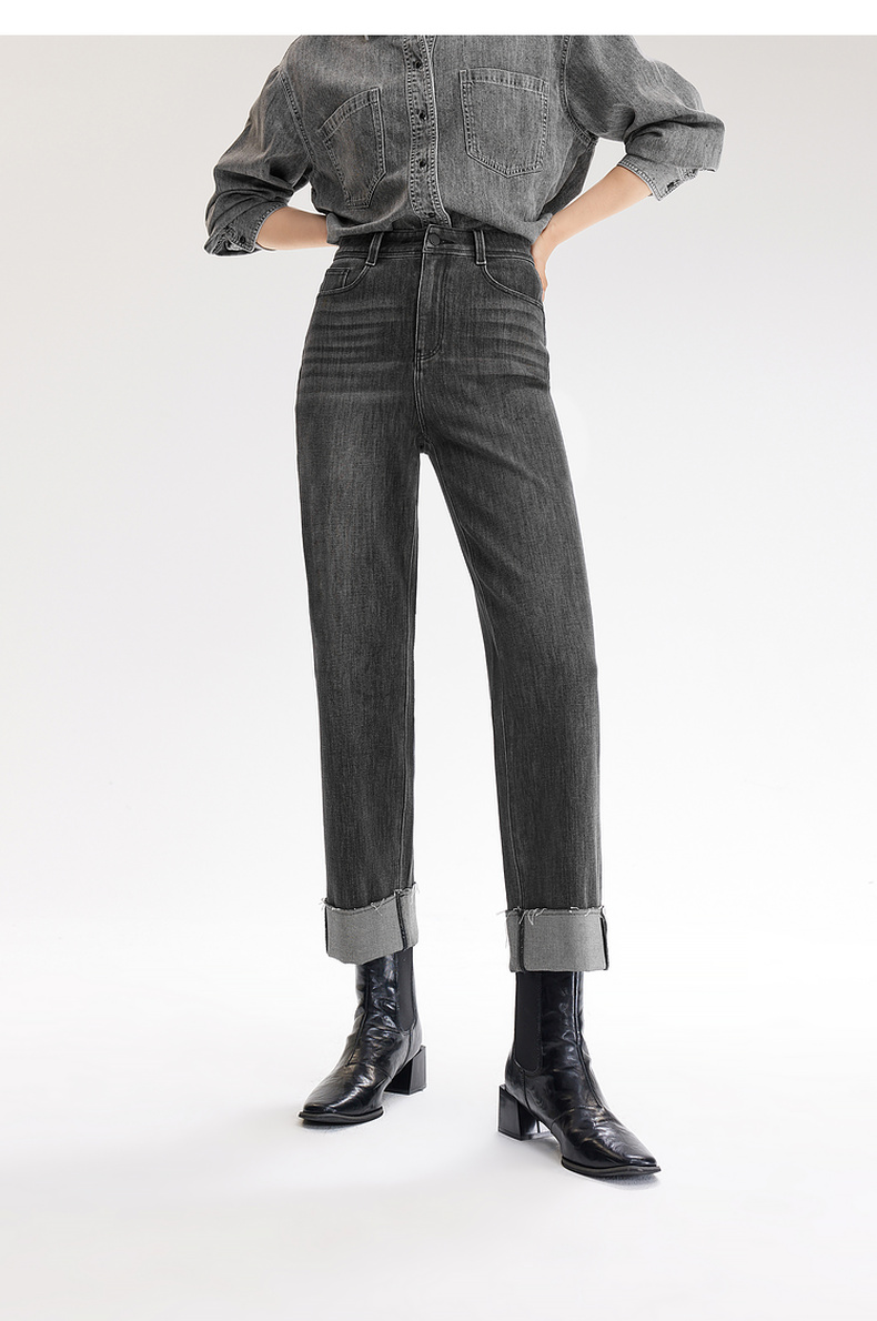 【严选】伊芙丽高弹力翻脚口显瘦百搭复古牛仔裤女2024秋装新款通勤裤子1F7951291