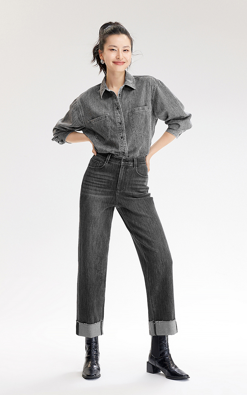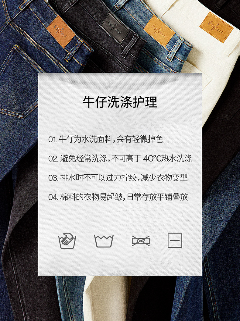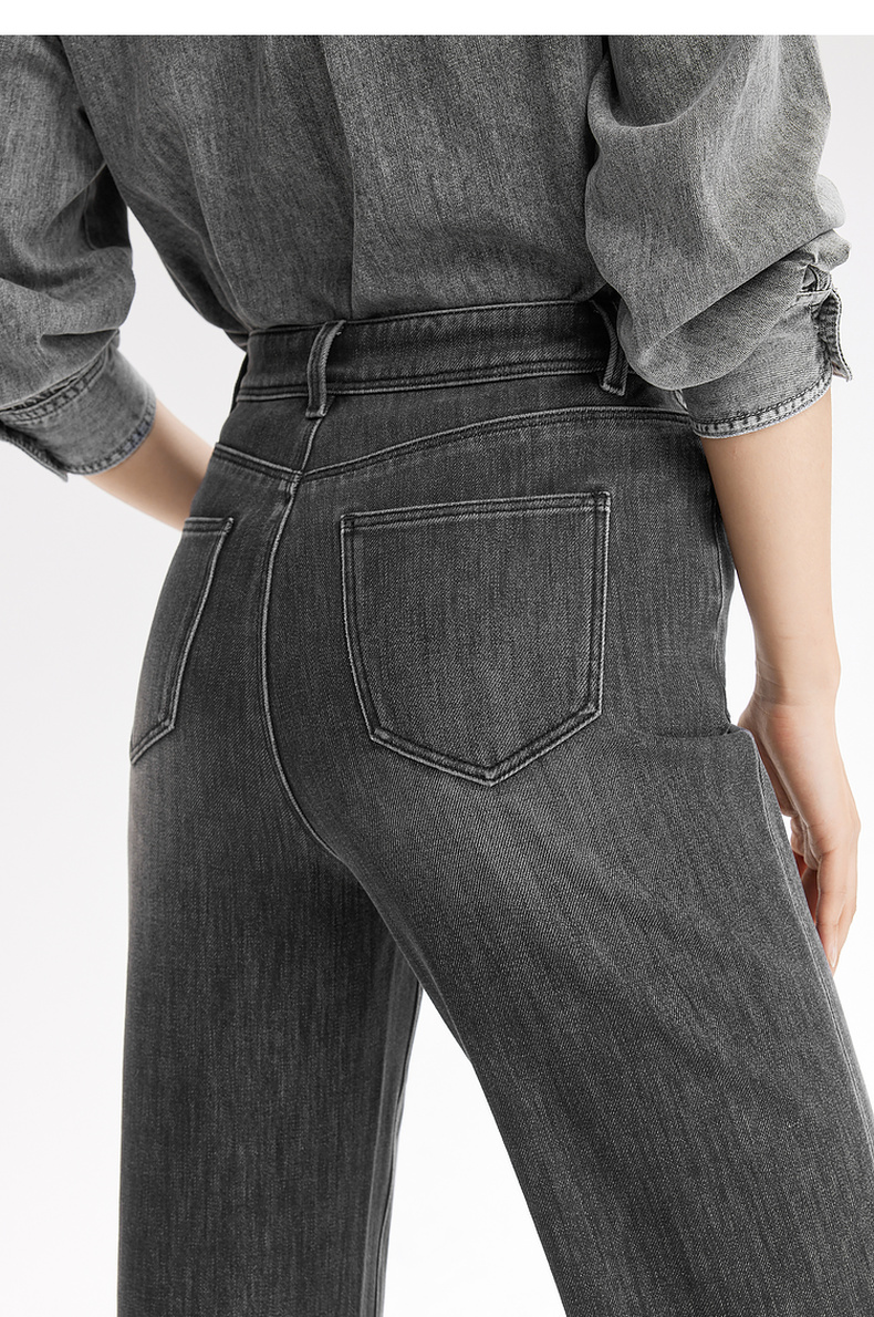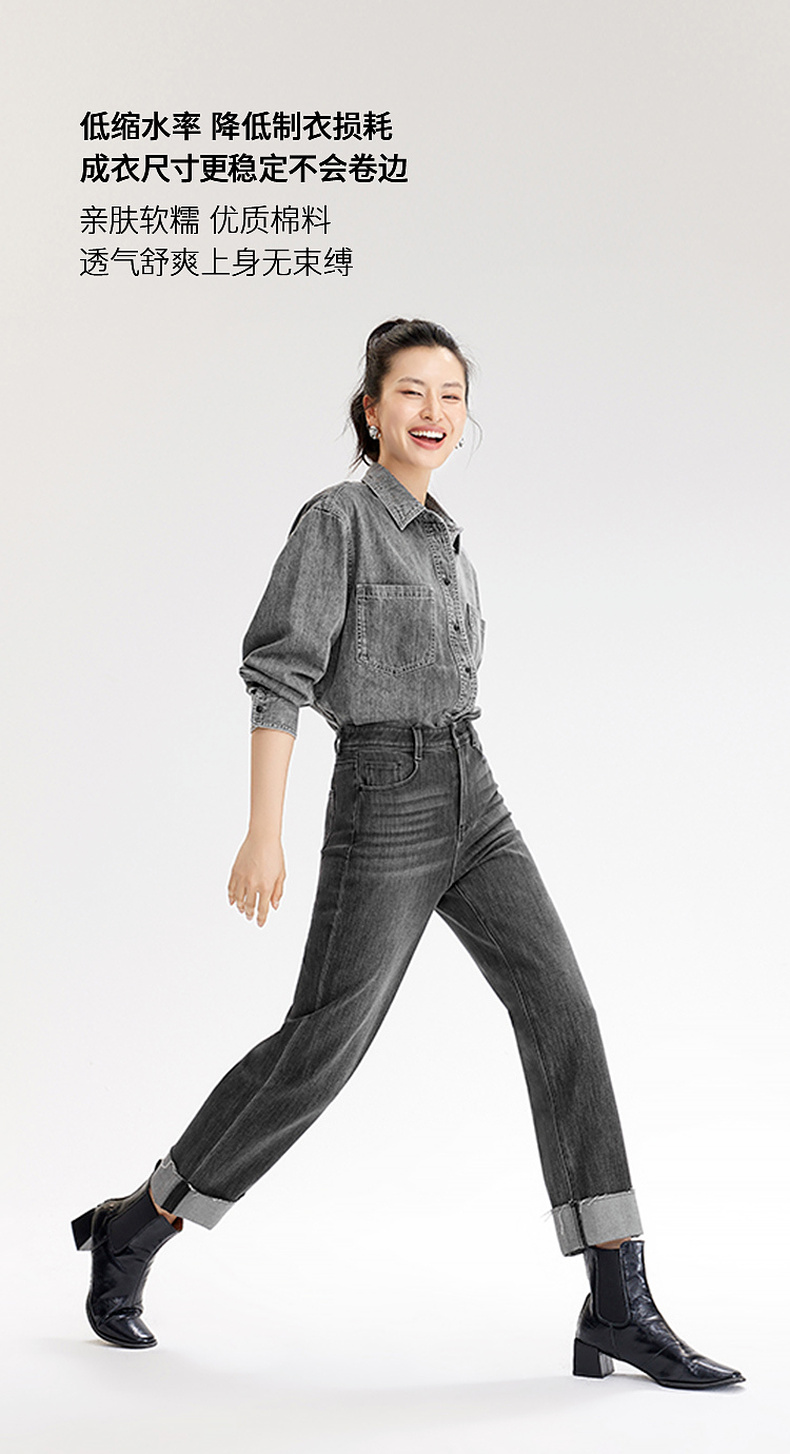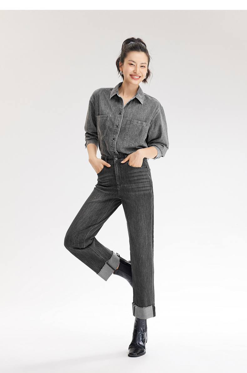 【严选】伊芙丽高弹力翻脚口显瘦百搭复古牛仔裤女2024秋装新款通勤裤子1F7951291