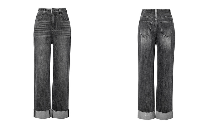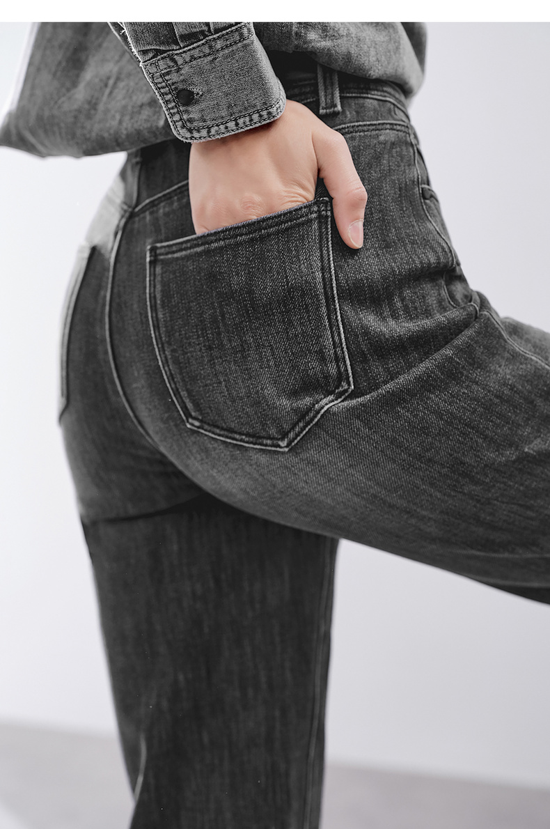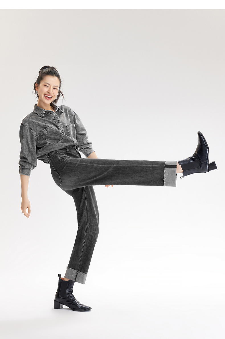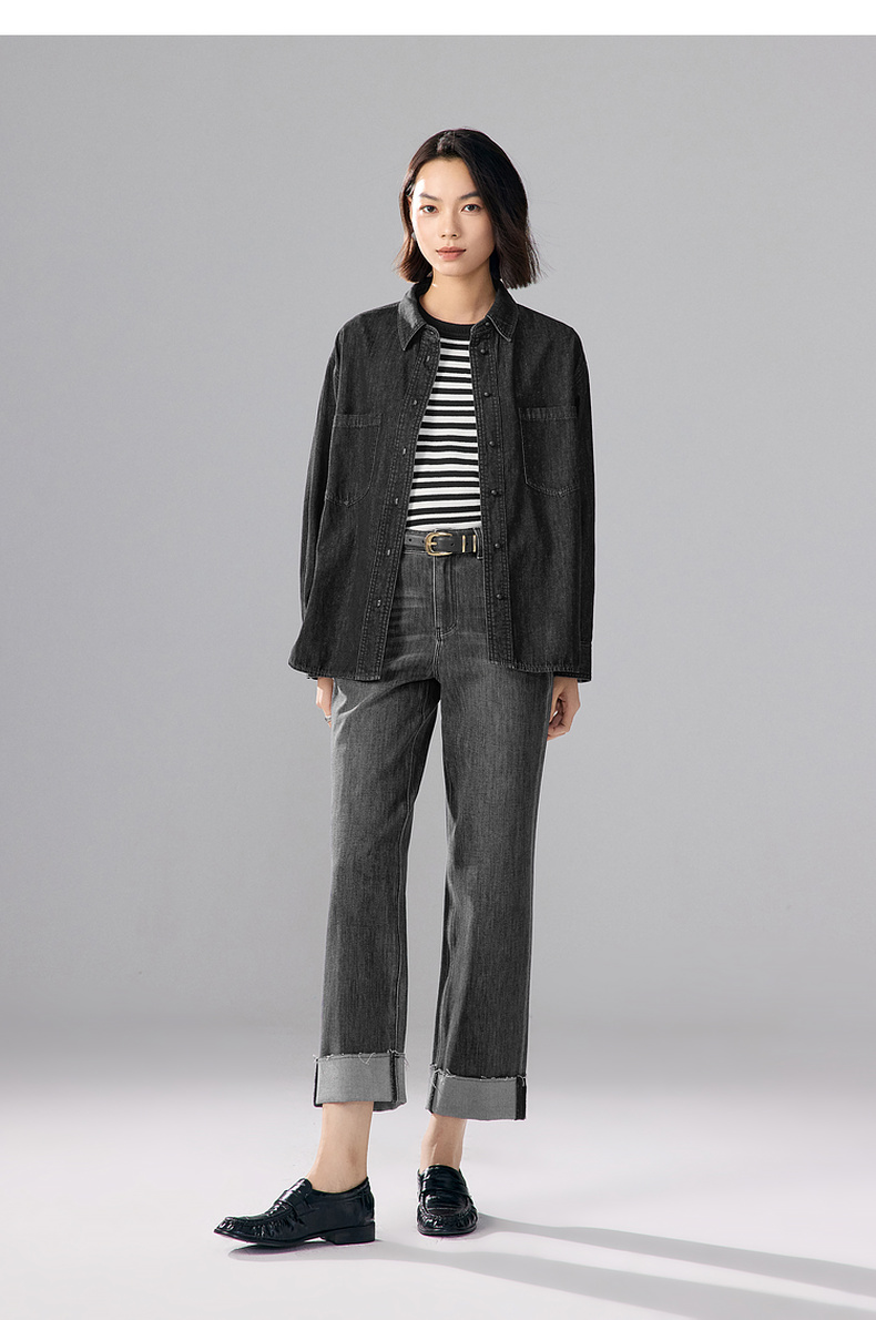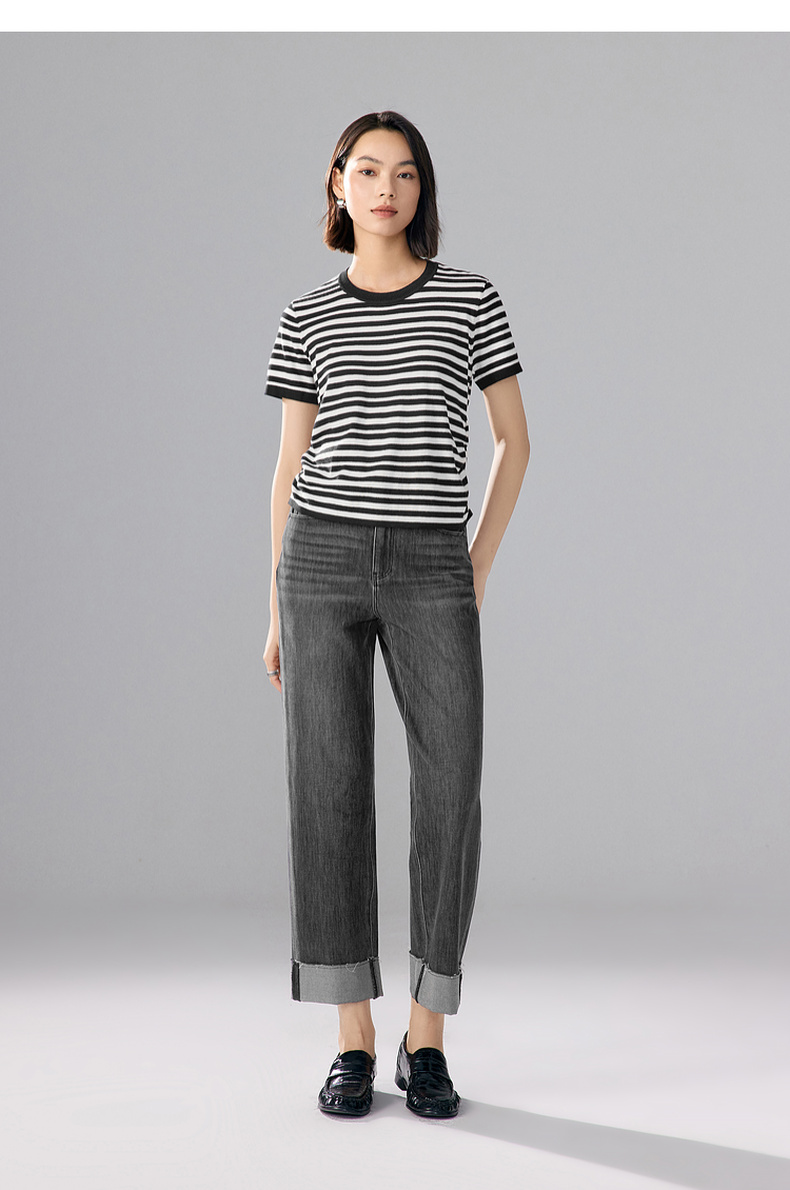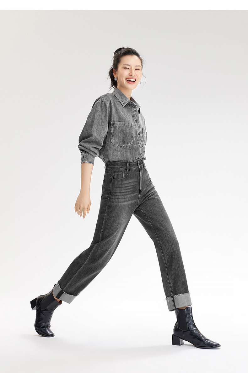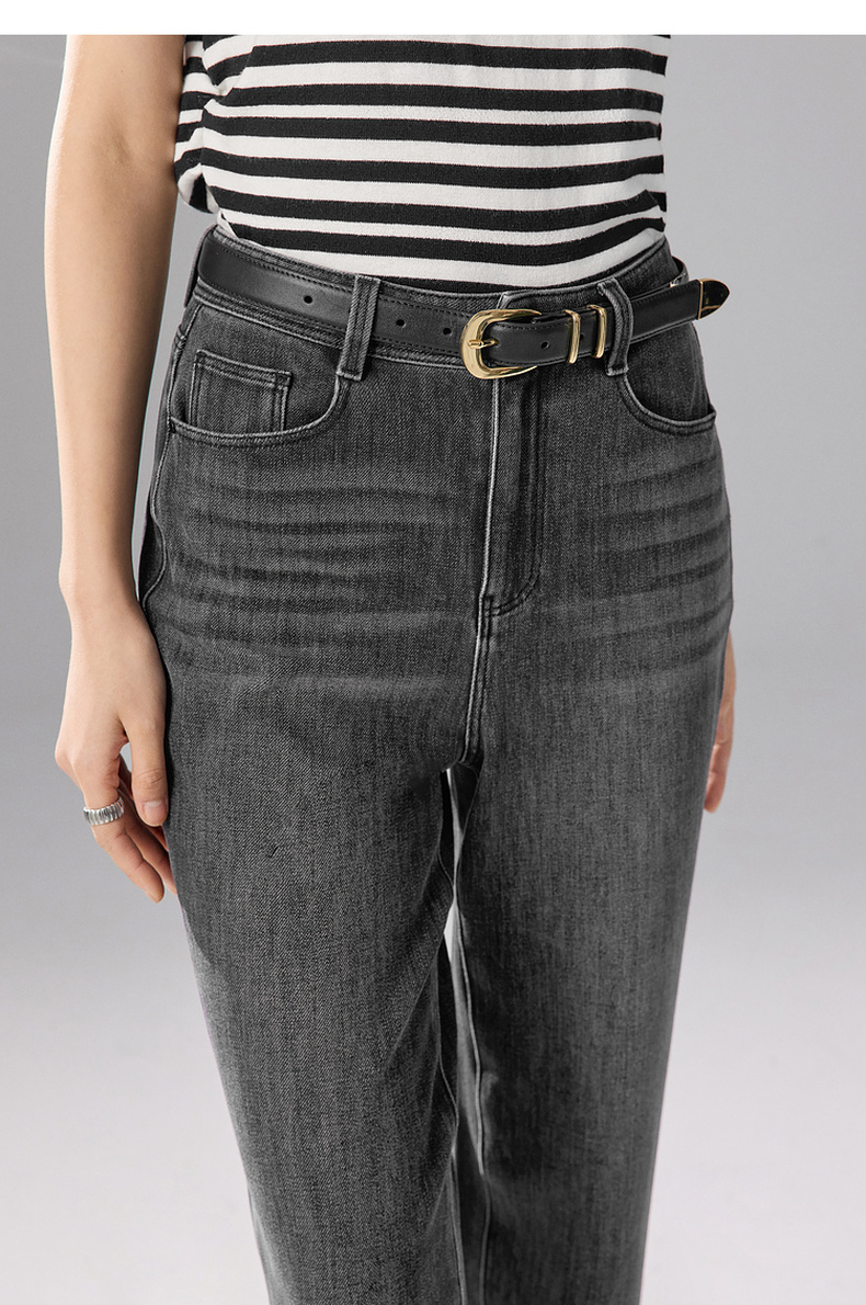 【严选】伊芙丽高弹力翻脚口显瘦百搭复古牛仔裤女2024秋装新款通勤裤子1F7951291