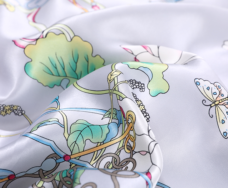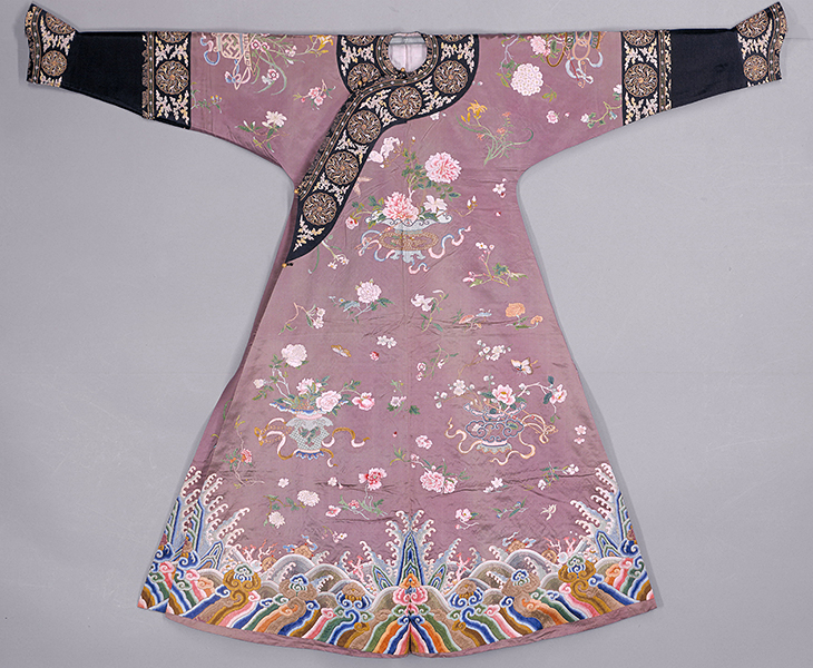 图案灵感来源于清代乾隆时期妃子刺绣棉袍 ,图案由牡丹、月季、 海棠、菊花、梅花、茶花、红蓼等插入或放入各式博古花瓶或花篮中构成装饰,间饰蝴蝶和折枝散花。绣法丰富生动,惟妙惟肖。每种花卉有其不同的寓意。如牡丹寓意富贵;月季为长春花,寓意长春不老与牡丹一起为富贵长春;海棠与牡丹寓意玉堂富贵; 菊花寓意吉祥长寿;梅花寓意坚韧高雅、梅开五福;茶花寓意可爱谦逊;红蓼寓意健康长寿。