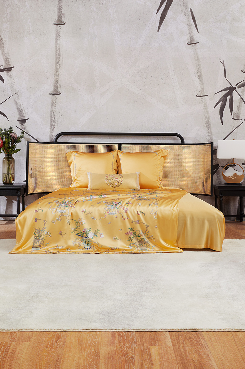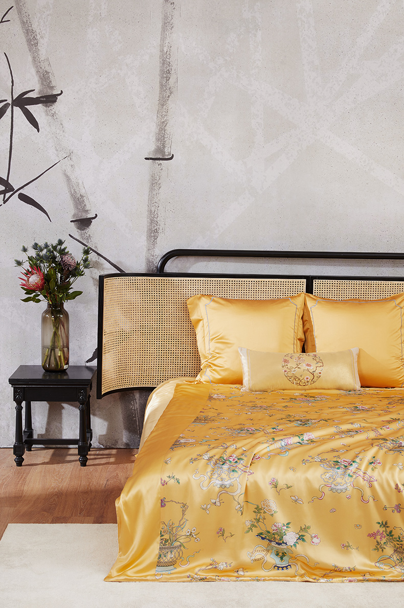 被面采用中心印花面料,两侧素色面料拼接的工艺,美观大方,触感柔软顺滑。