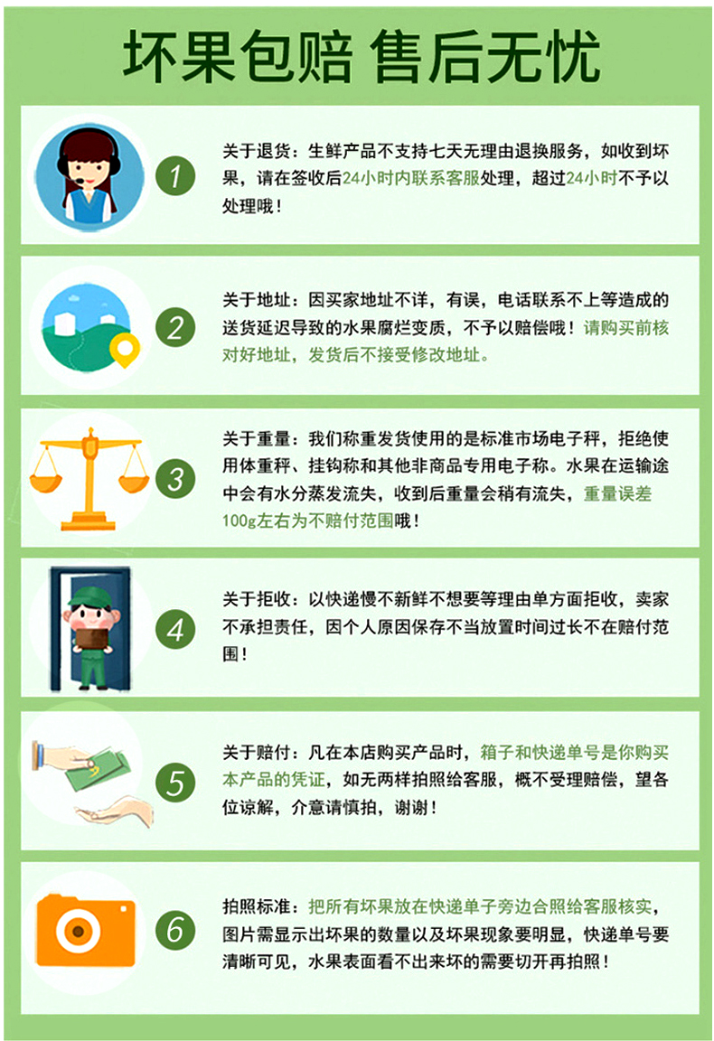 【售后标准】生鲜果蔬必须在实际物流到货24小时内签收查看,有坏包赔!超时、拒收、收货地址不详、联系不上收货人不售后!请买主一定要注意查看下物流哦(文末赔付需知必看)。