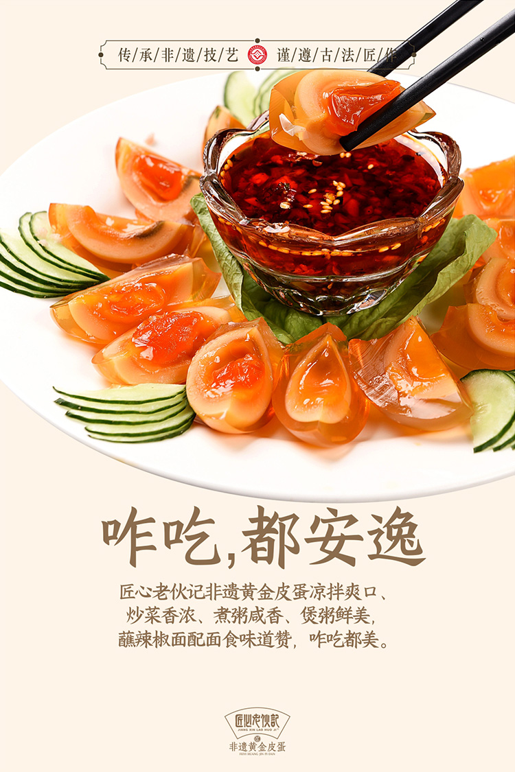 老伙记黄金皮蛋非遗手工匠作,获得“非物质文化遗产”,“无铅技艺”,“无重金属品质”,“特许出口食品”等荣誉。为什么小小的皮蛋能够有如此殊荣,因为一颗老伙记皮蛋从包制到上市至少需要约80天的时间(20天自然入味,60天自然风干),慢工细活,传统手工产品从来都是时间的馈赠,老伙记不逆天时,不使用化学品,只求风味的完美。