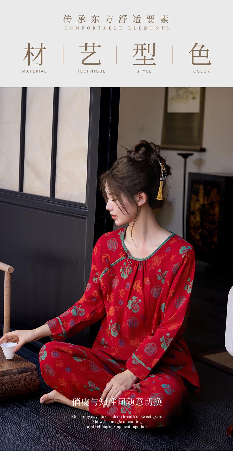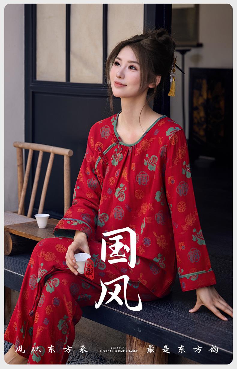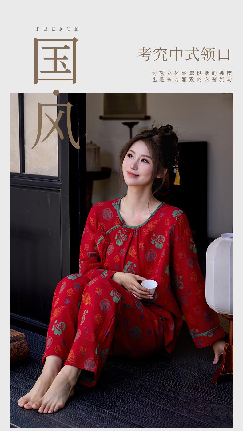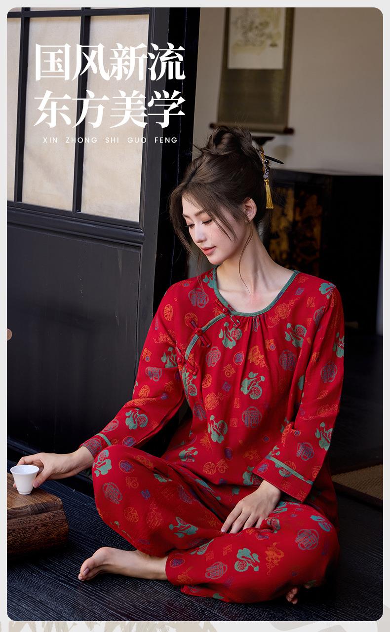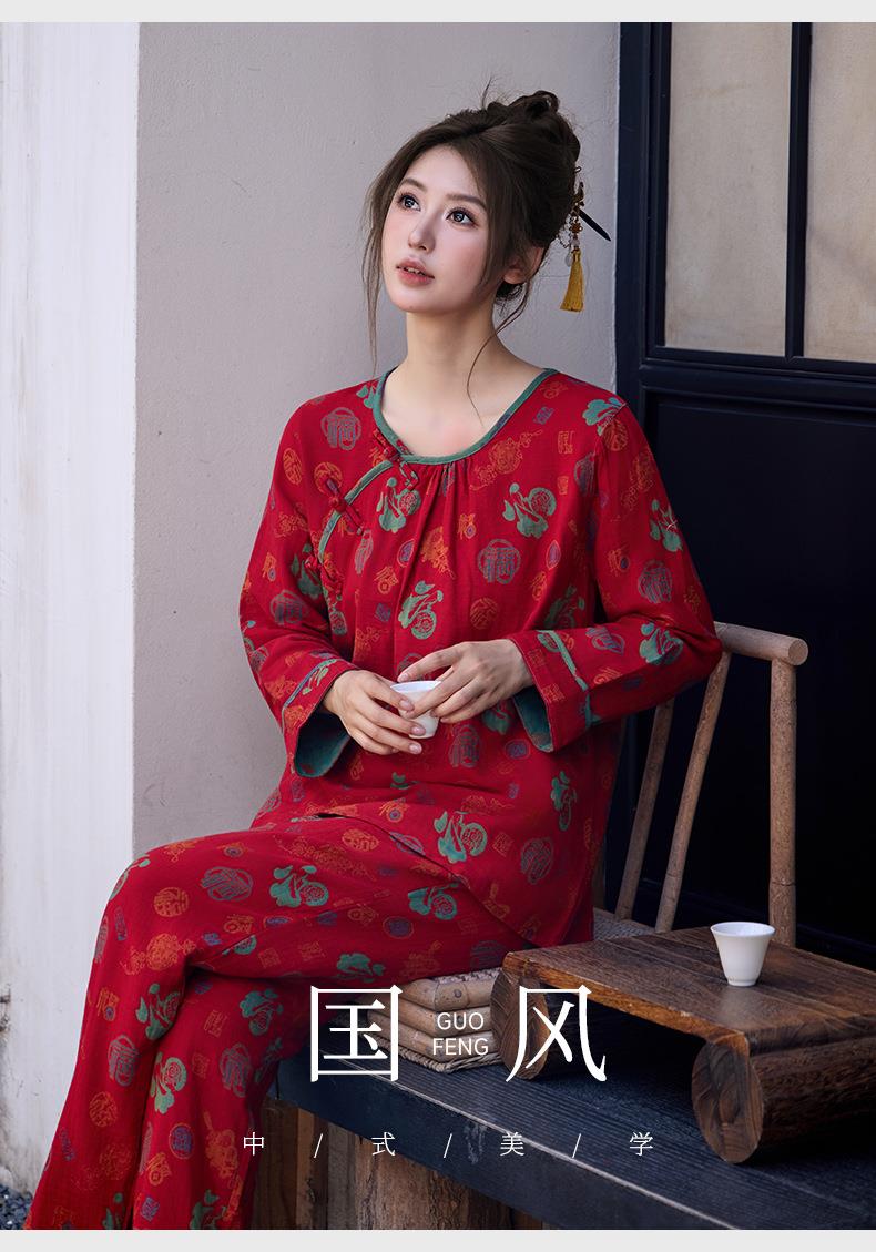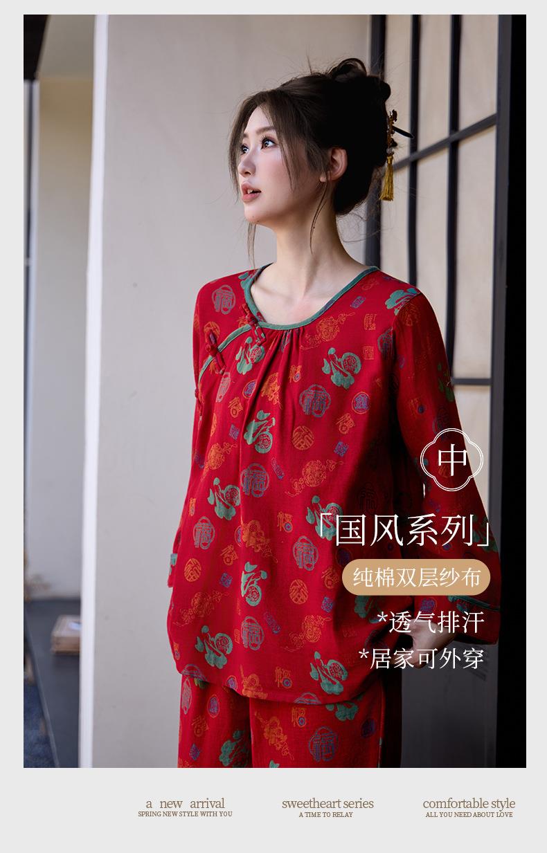 新中式国风红色家居服女纯棉睡衣春秋夏季中国红福字可外穿家居服