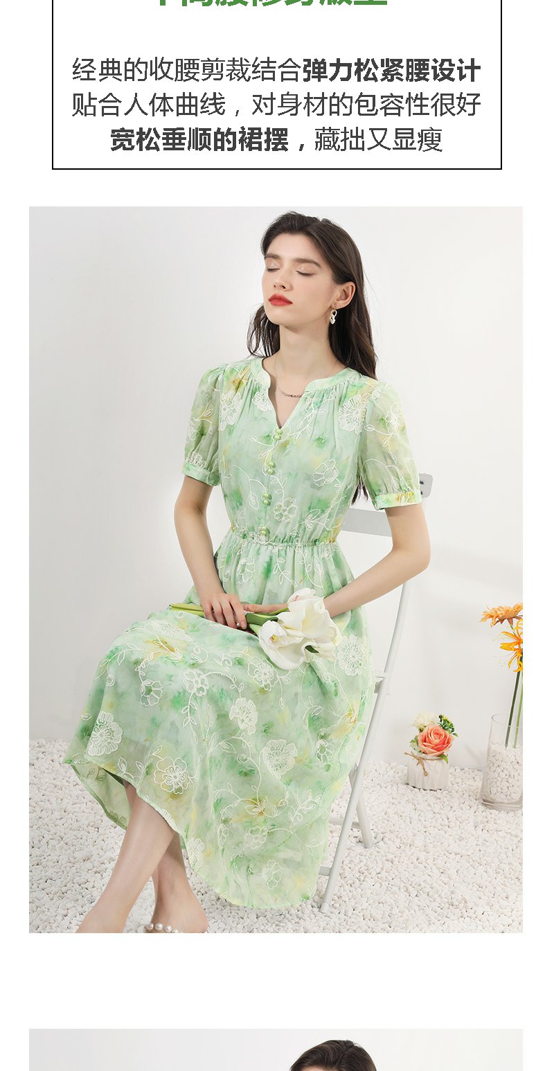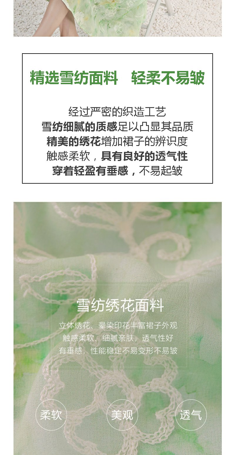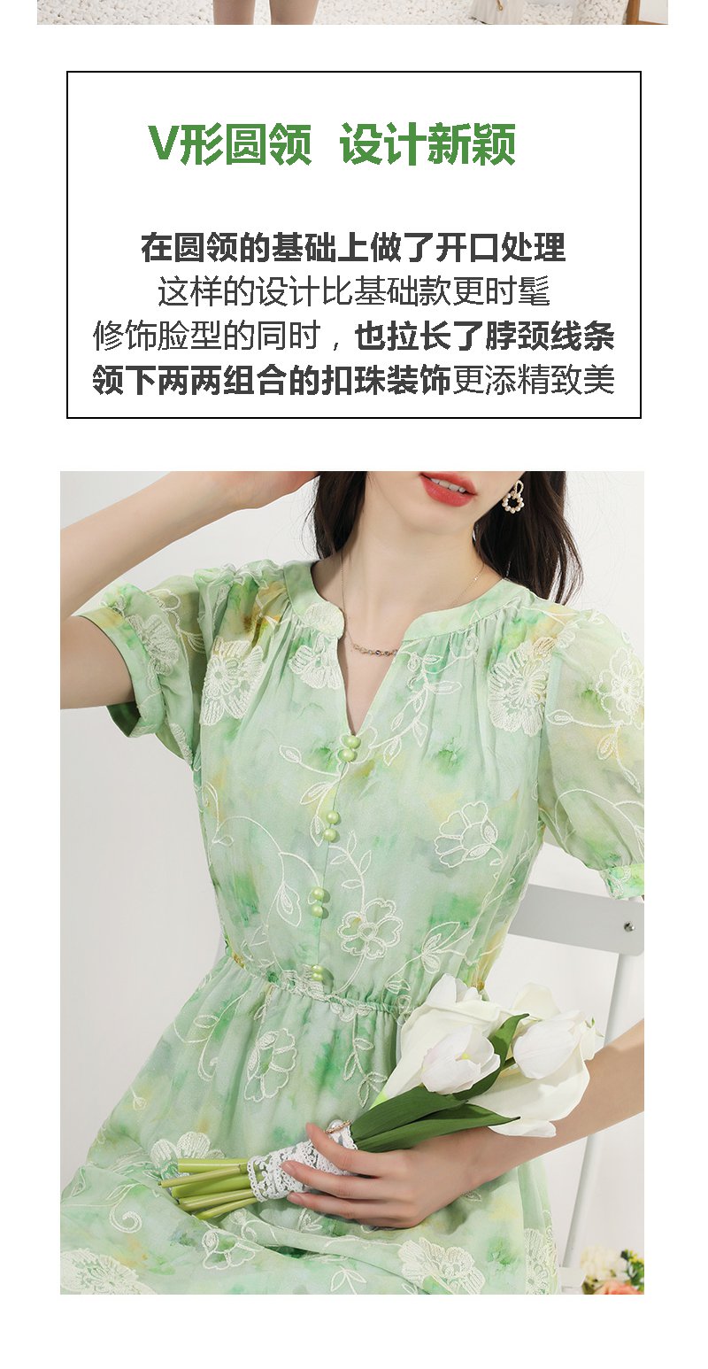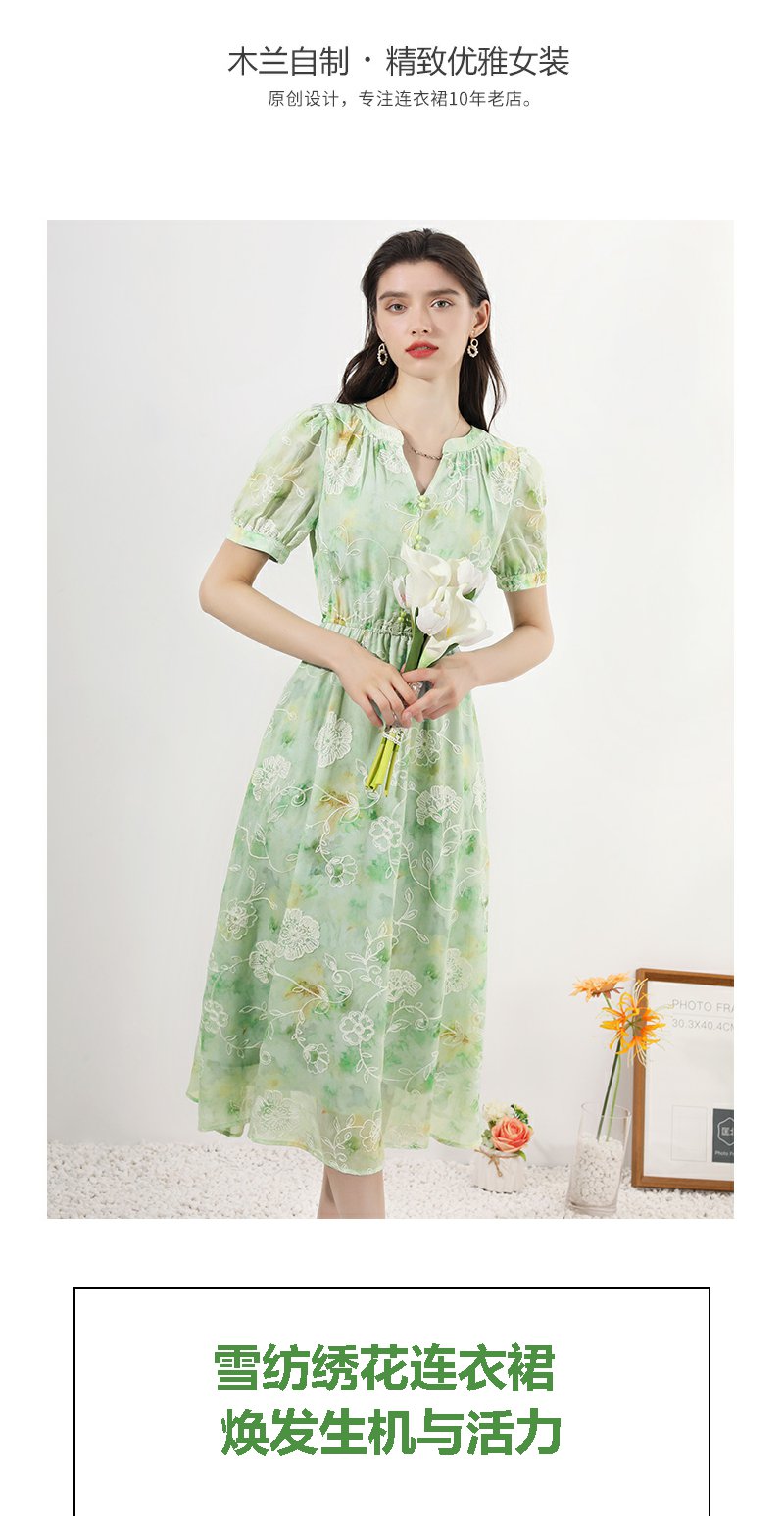 未风绿色雪纺绣花连衣裙女夏2024夏季新款气质泡泡袖遮肉显瘦裙子