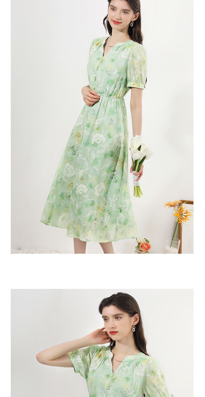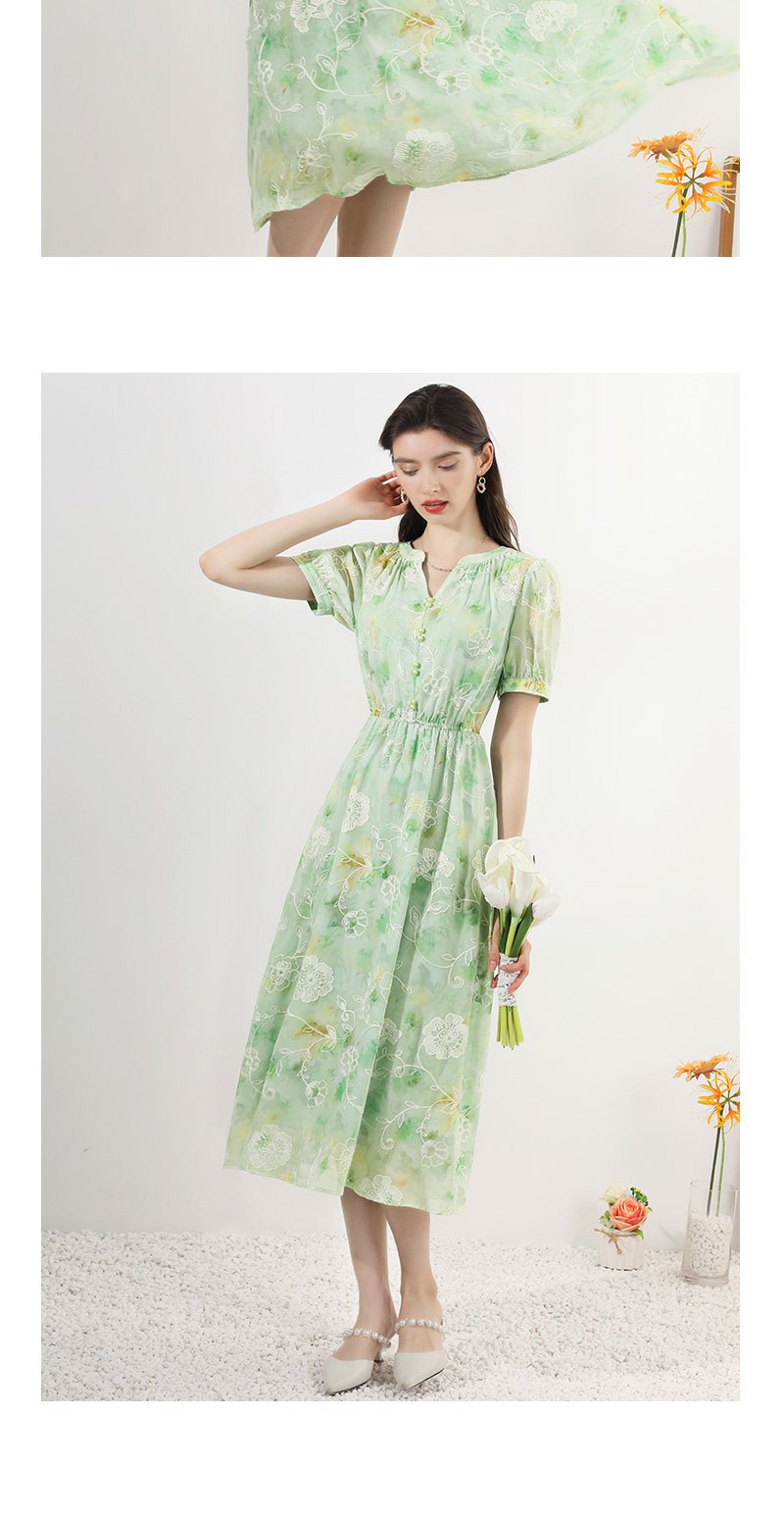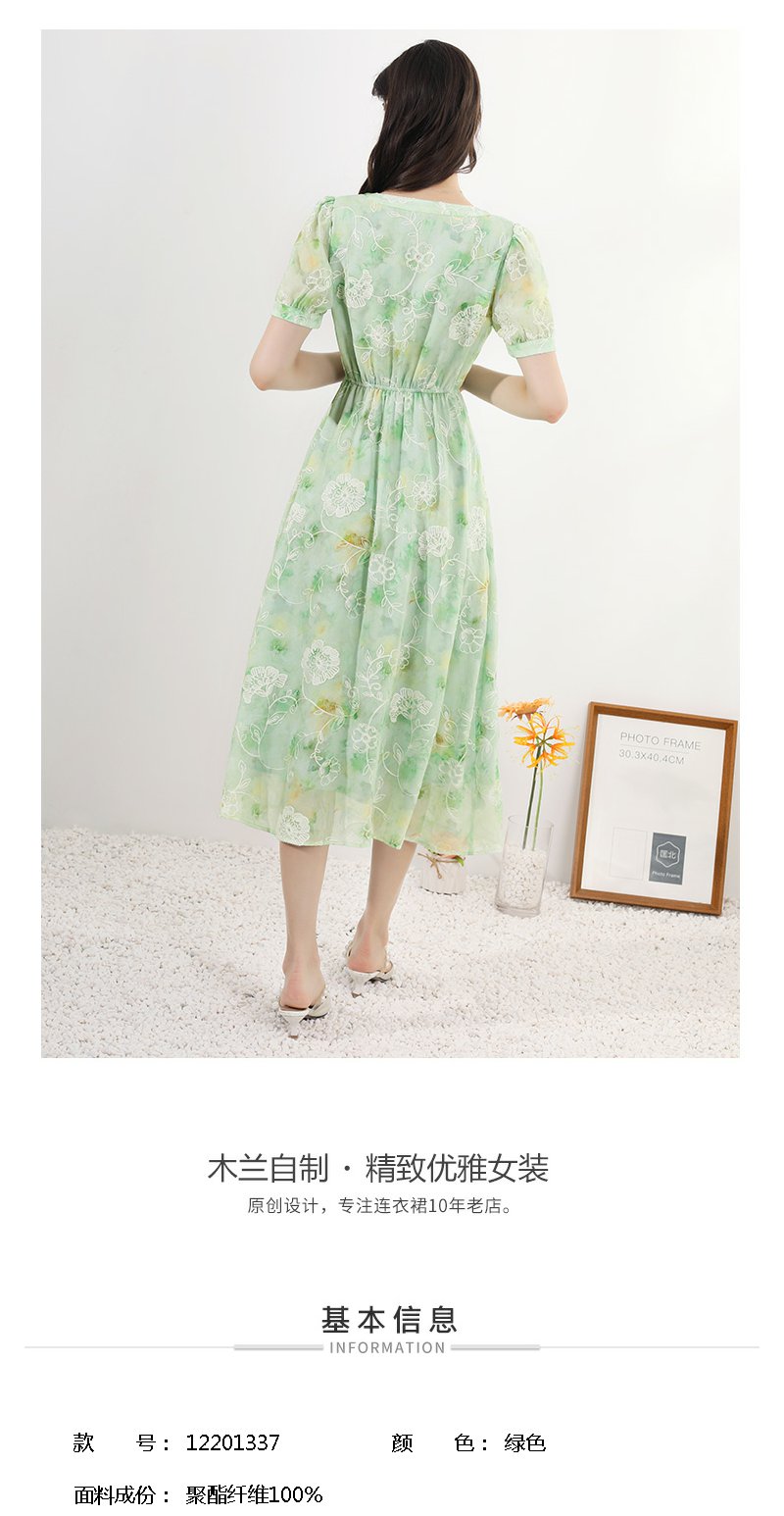 未风绿色雪纺绣花连衣裙女夏2024夏季新款气质泡泡袖遮肉显瘦裙子