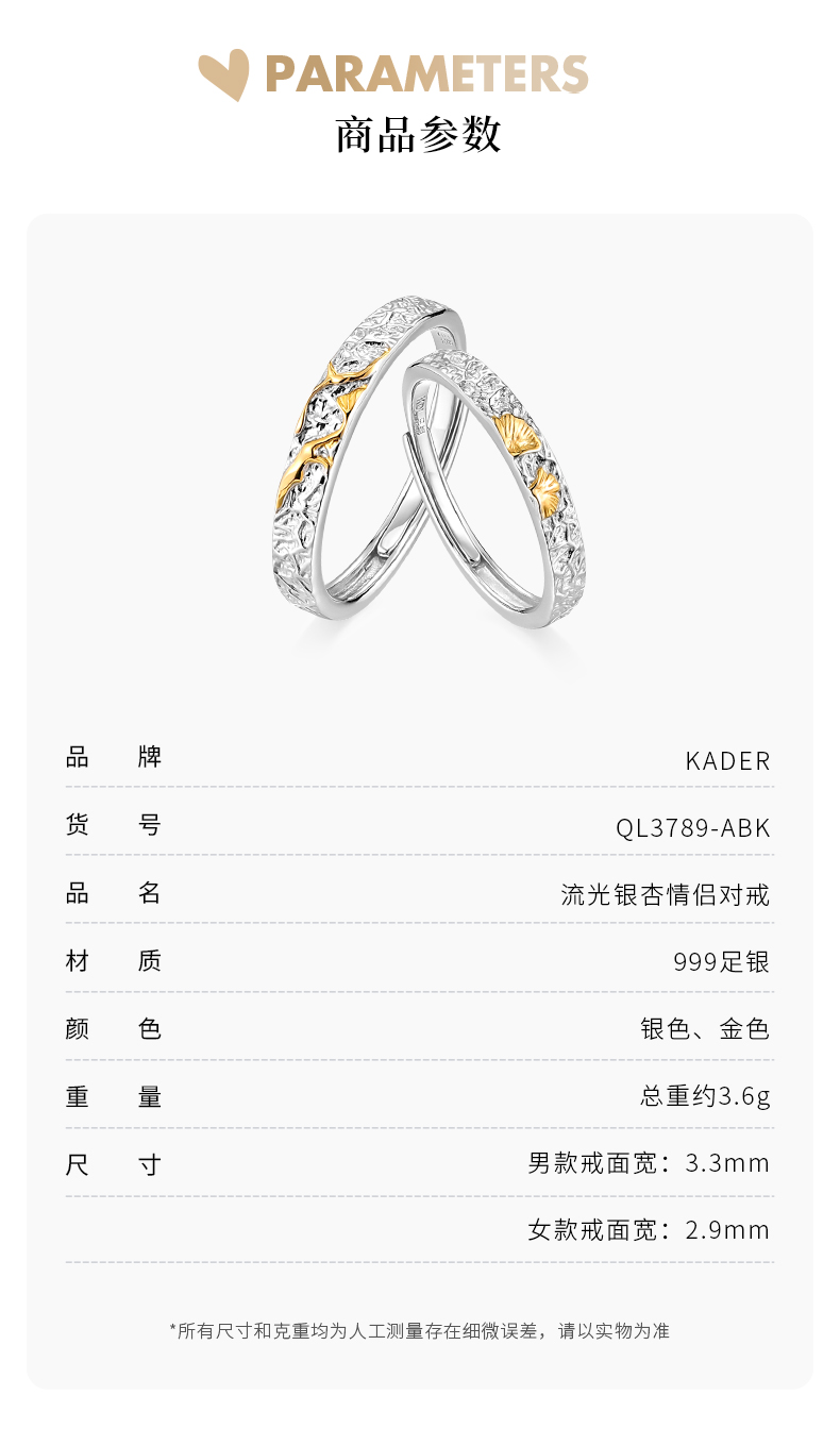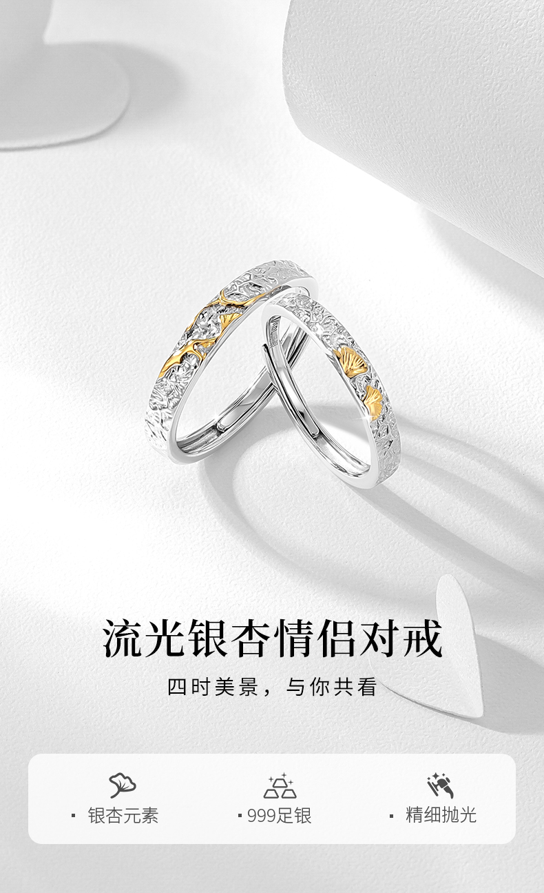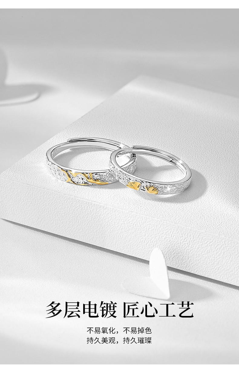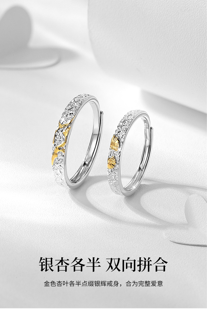 卡蒂罗/KADER【足银999】 卡蒂罗KADER 流光银杏情侣对戒 碎冰冰三生有杏原创设计简约冰川纹理感可调节素圈一对 时尚百搭通勤 999足银 戒指 男女同款情侣款