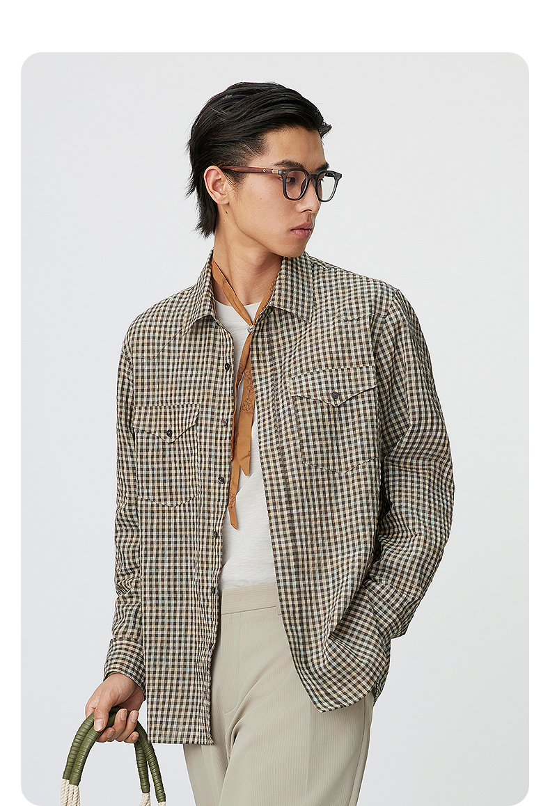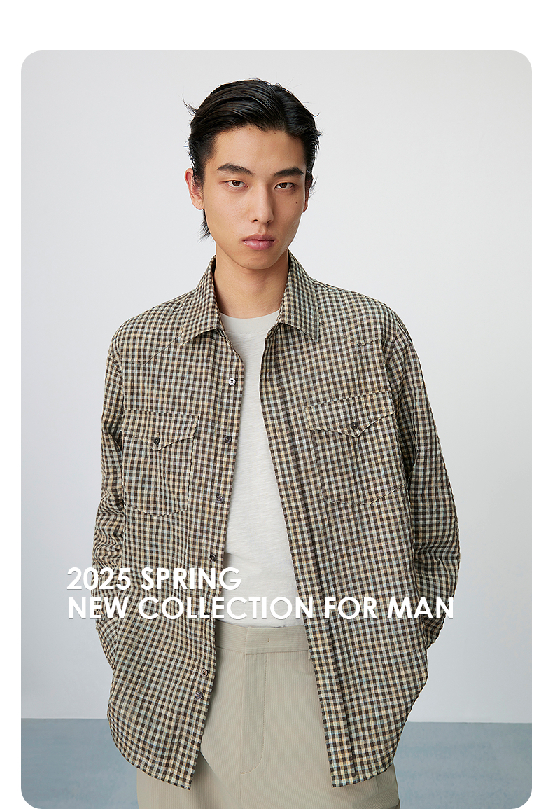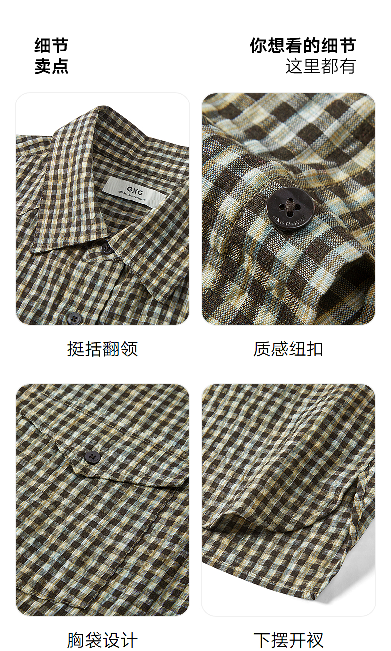 GXG男装 泡泡纱格纹时尚休闲通勤翻领长袖衬衫男生 25年春热卖