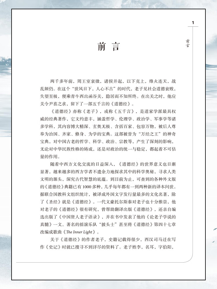 《道德经》是道家学派的经典著作,它文约意丰,涵盖哲学、政治学、军事学等诸多学科,其内容博大精深、玄奥无极、涵括百家、包容万物,被后人尊奉为治国、齐家、为学、修身的宝典。这部被誉为“万经之王”的奇书,对中国古老的哲学、科学、政治、宗教等产生了深刻的影响。无论是治学修身、处世待人,还是经商置业、从政为民;无论是高官大吏、富商大贾,还是贩夫走卒、平民百姓,总能从《道德经》中找到自己所需要的智慧。