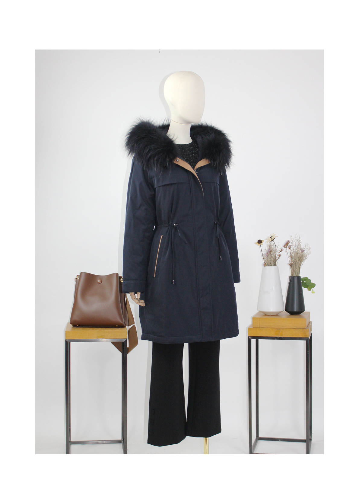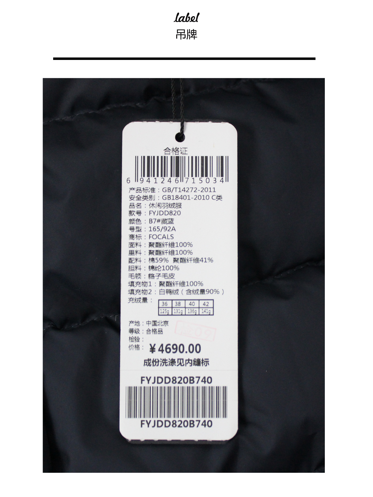 FOCALS福柯斯新款休闲拼接连帽毛领中长款派克羽绒服FYJDD820B7
