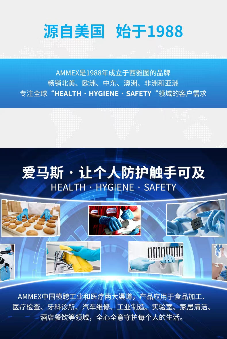 - 爱马斯,为医疗/牙科,工业汽修,食品加工/餐饮,实验室,纹身艺术等行业提供一次性防护手套