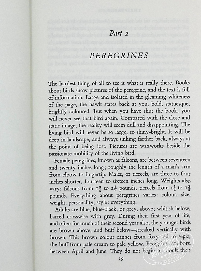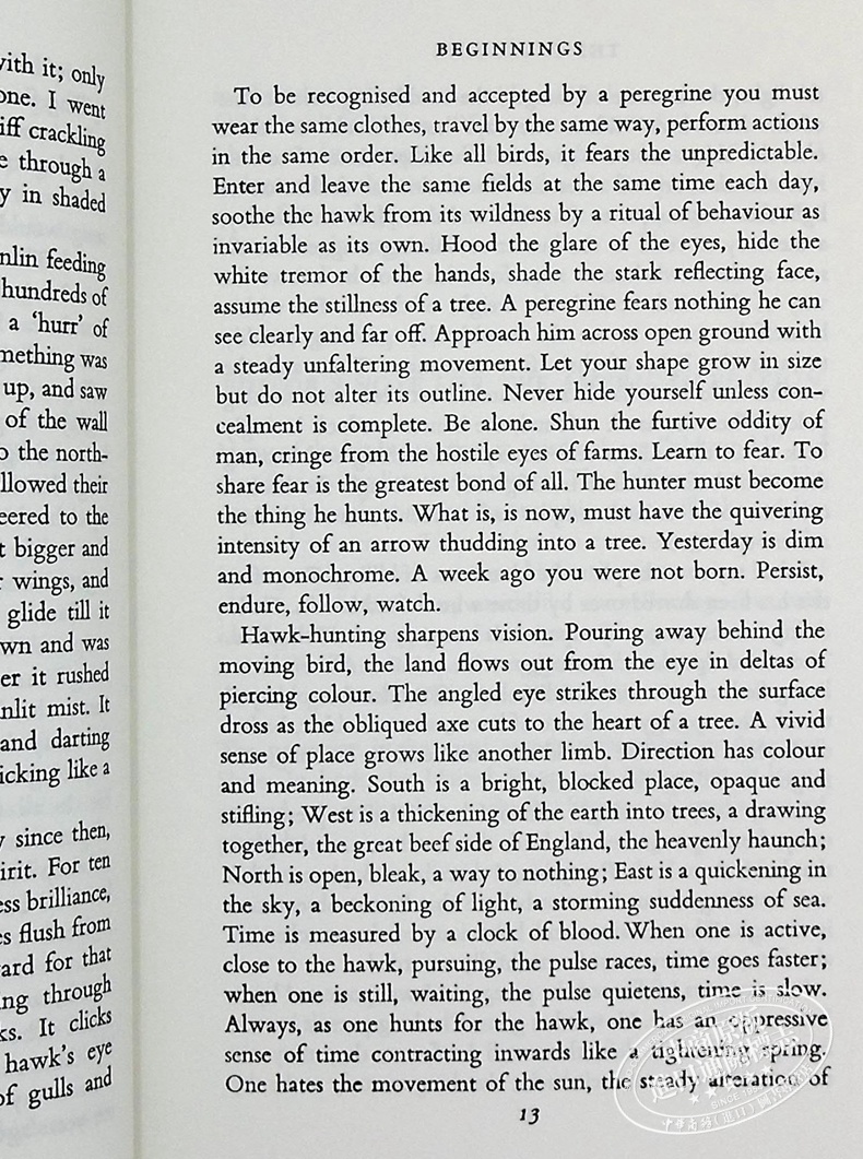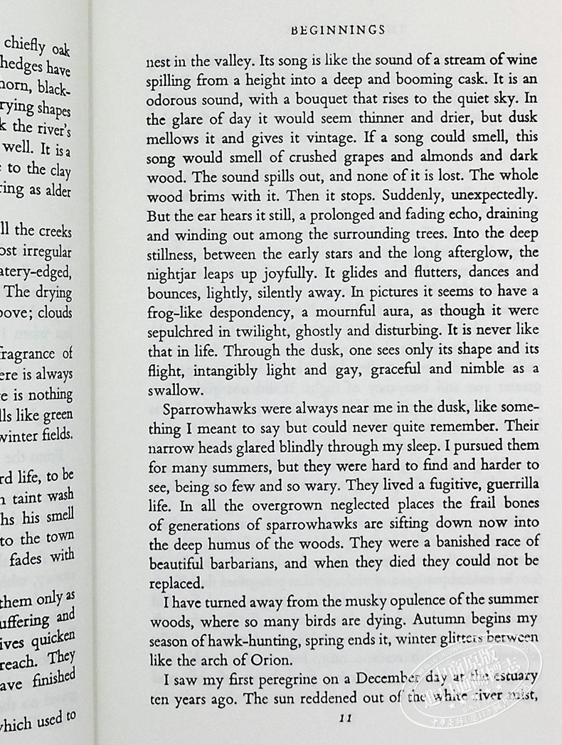 我拿起它(《游隼》)随手翻开一页。那一页绝妙描绘了一只鸮无声寻猎的画面。我被它的细节击中,震惊于他的文字唤起的听觉上的感受。似乎我正在当时当地,通过作者的耳朵体验那一刻。我翻到下一页,一章没读完我知道我已经被俘获了。