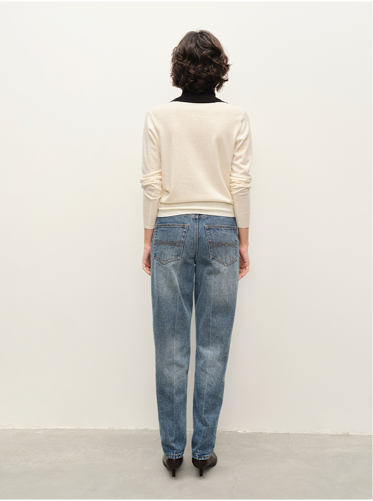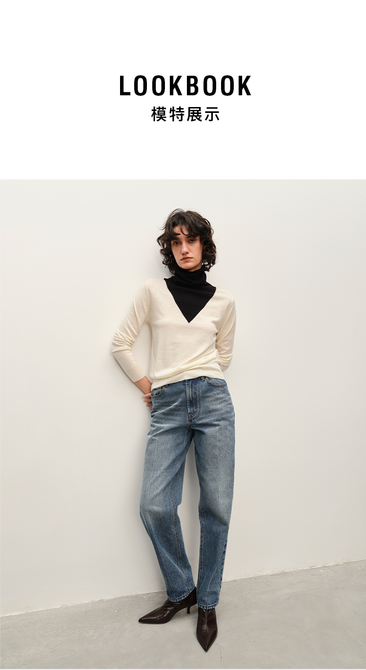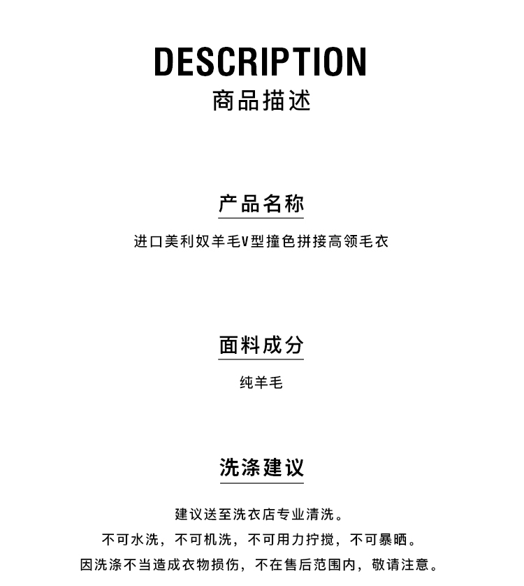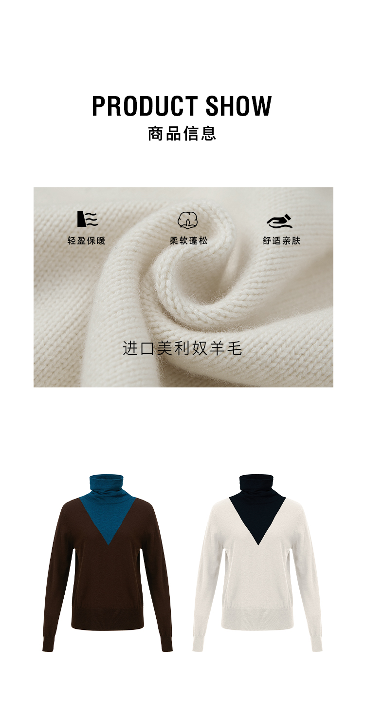 HIDEMI 进口美利奴羊毛V型撞色拼接高领毛衣 棕蓝/黑白