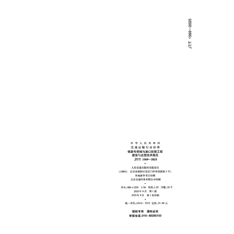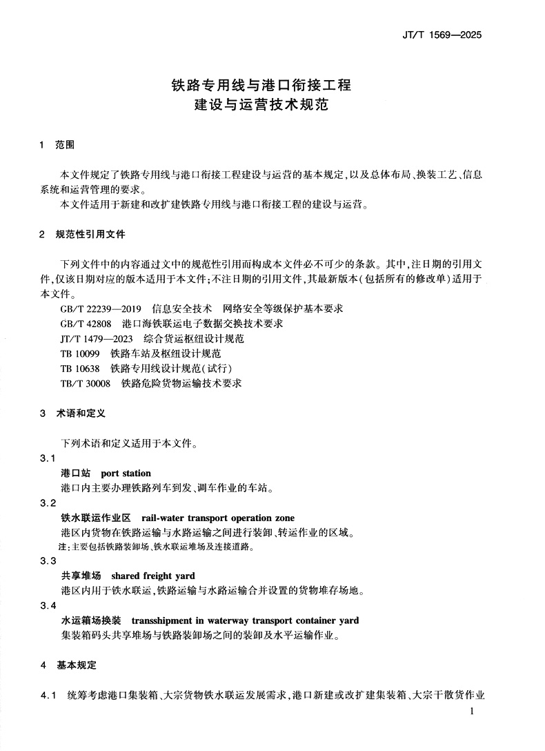 书名:铁路专用线与港口衔接工程建设与运营技术规范(JT/T 1569—2025)