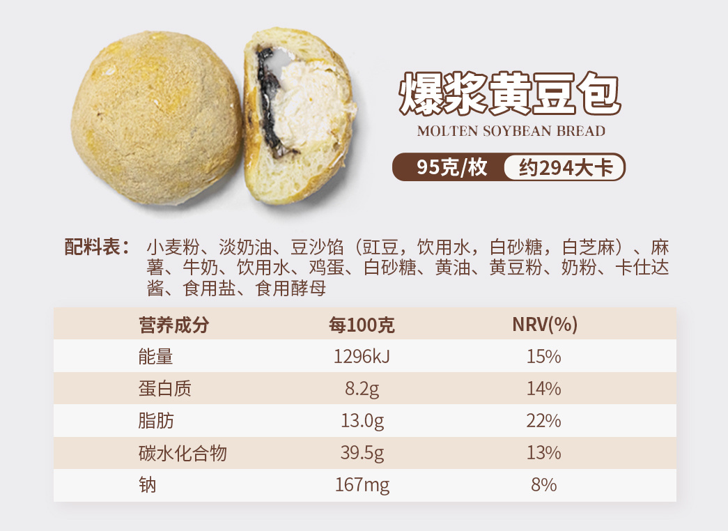 配料表:小麦粉、淡奶油、豆沙馅(豇豆,饮用水,白砂糖,白芝麻)、麻薯、牛奶、饮用水、鸡蛋、白砂糖、黄油、黄豆粉、奶粉、卡仕达酱、食用盐、食用酵母
