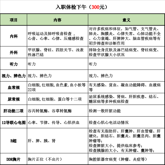 注:下午入职体检 比上午入职体检少肾功能3项和胆囊B超,且不能做加项;