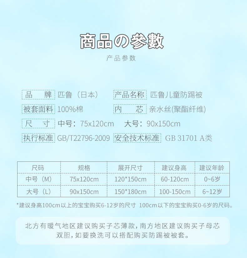 日本匹鲁儿童被子秋冬防踢被内芯拆卸可水洗秋冬被