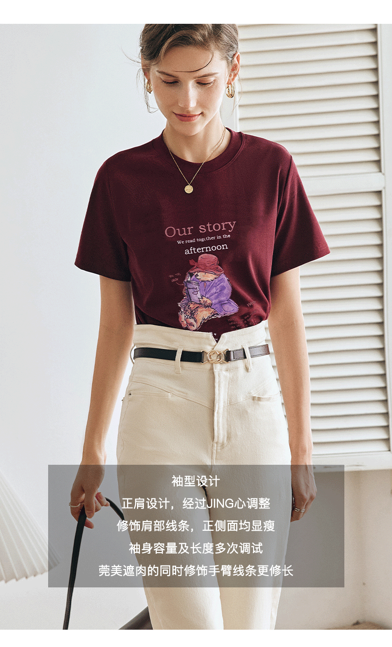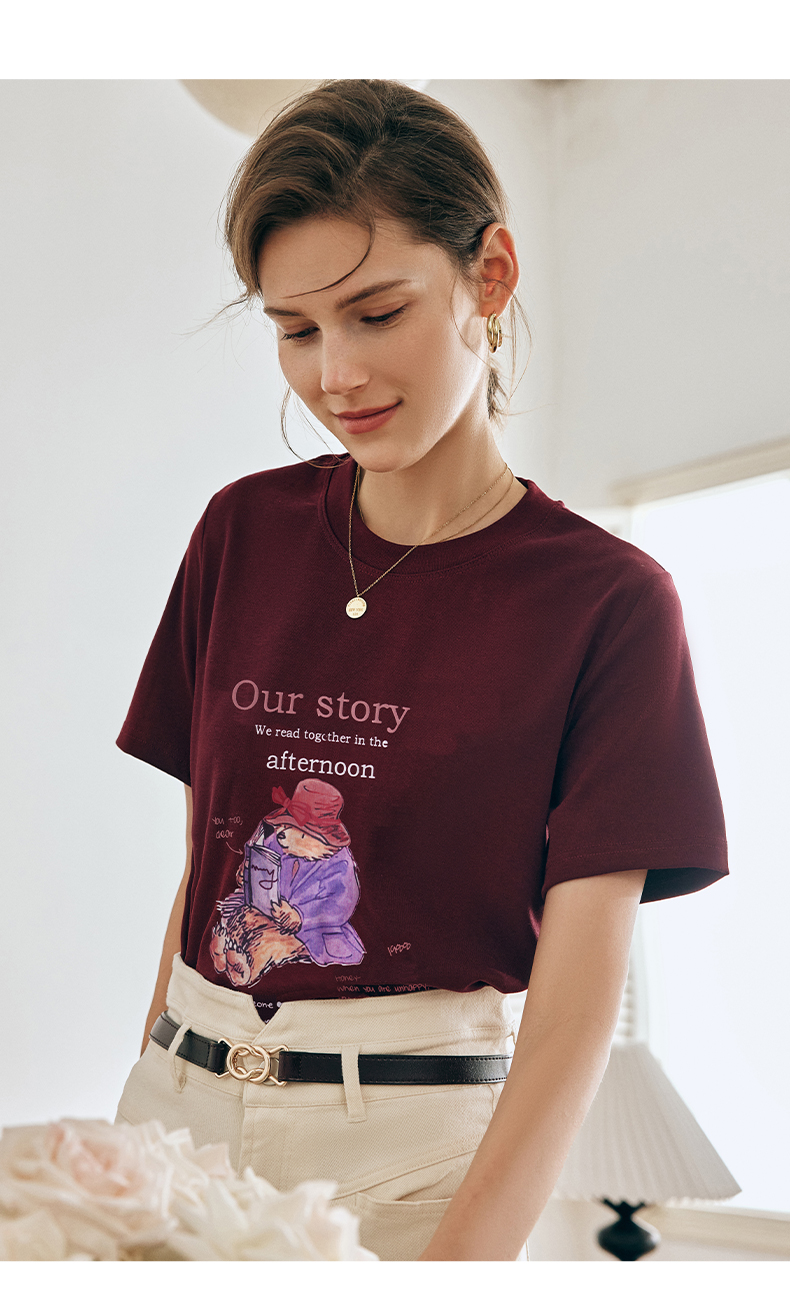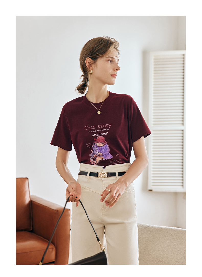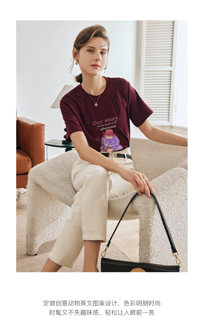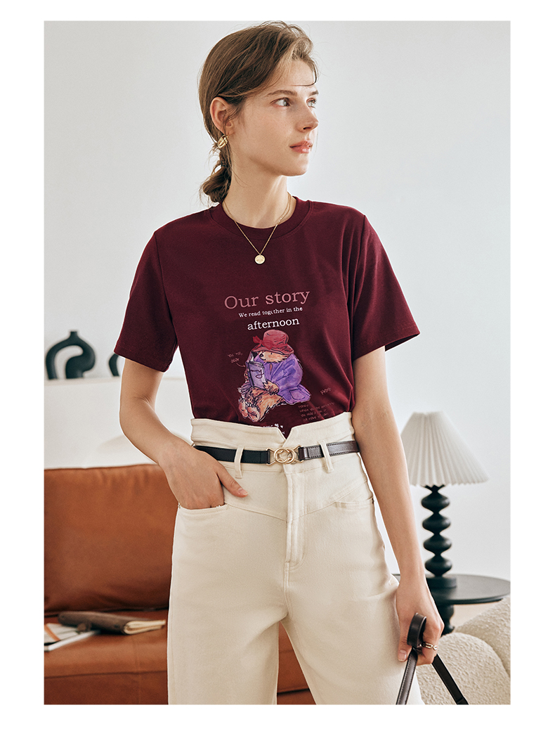 OLrain欧芮儿法式酒红色短袖T恤女夏季2023新款时尚印花正肩上衣