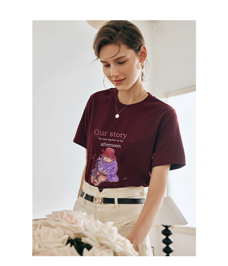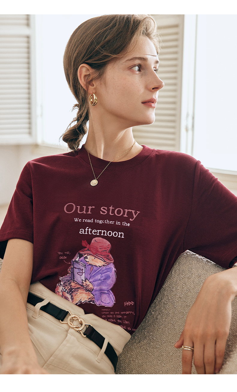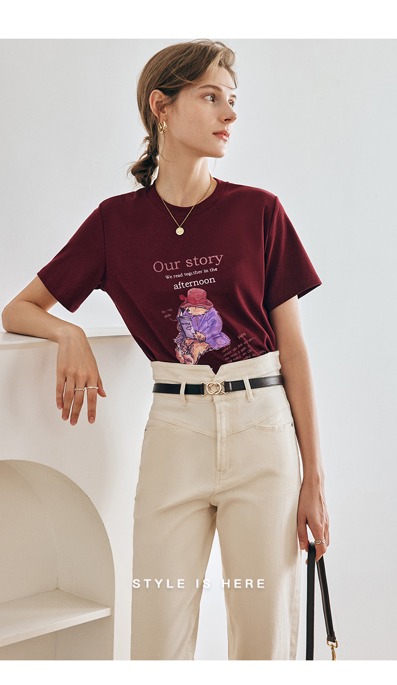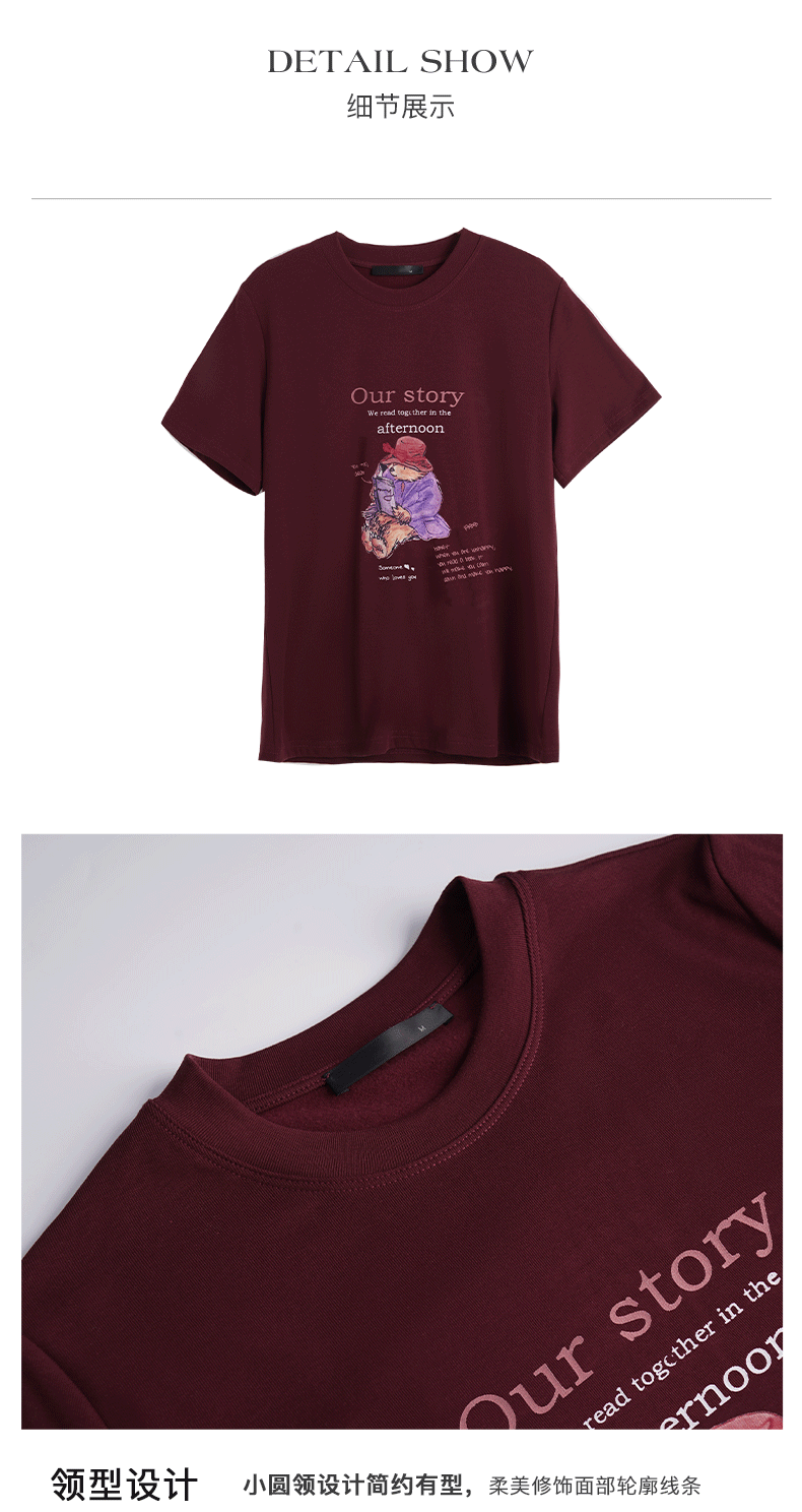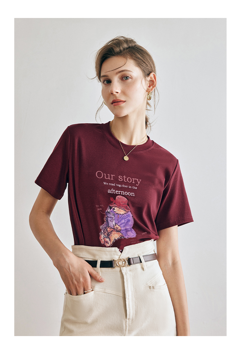 OLrain欧芮儿法式酒红色短袖T恤女夏季2023新款时尚印花正肩上衣