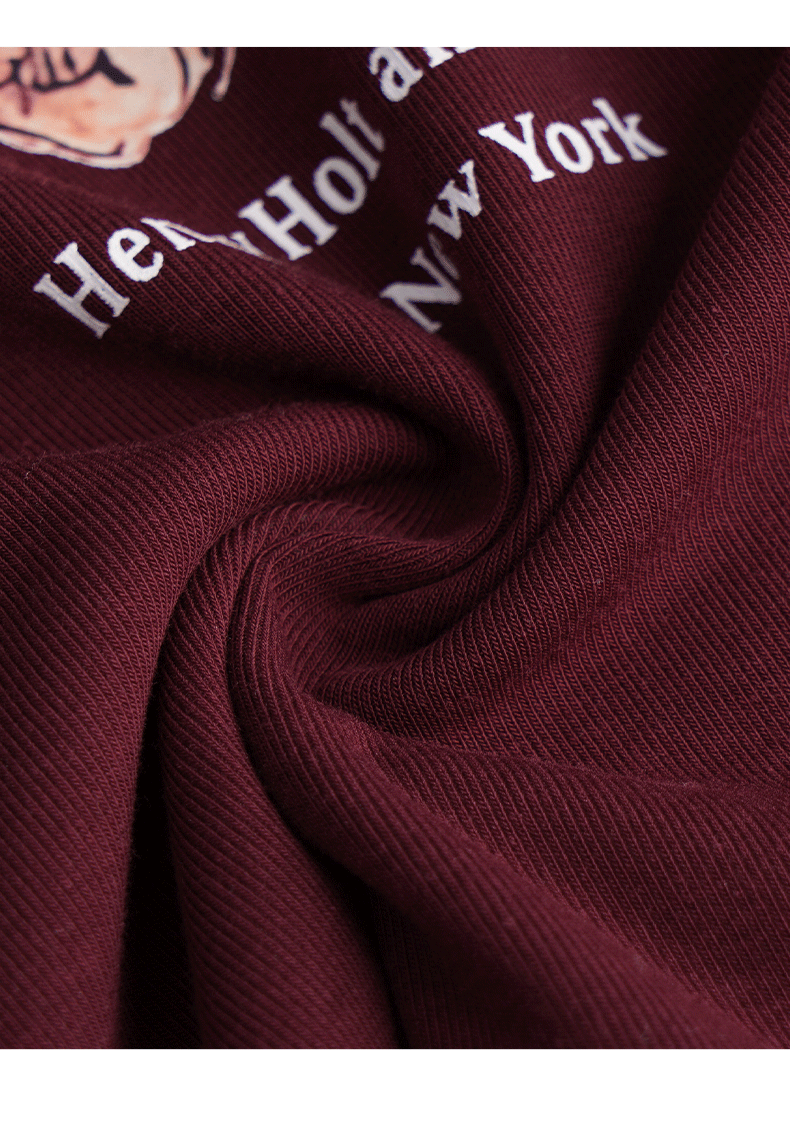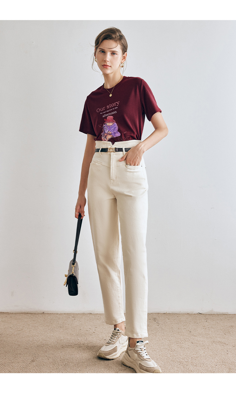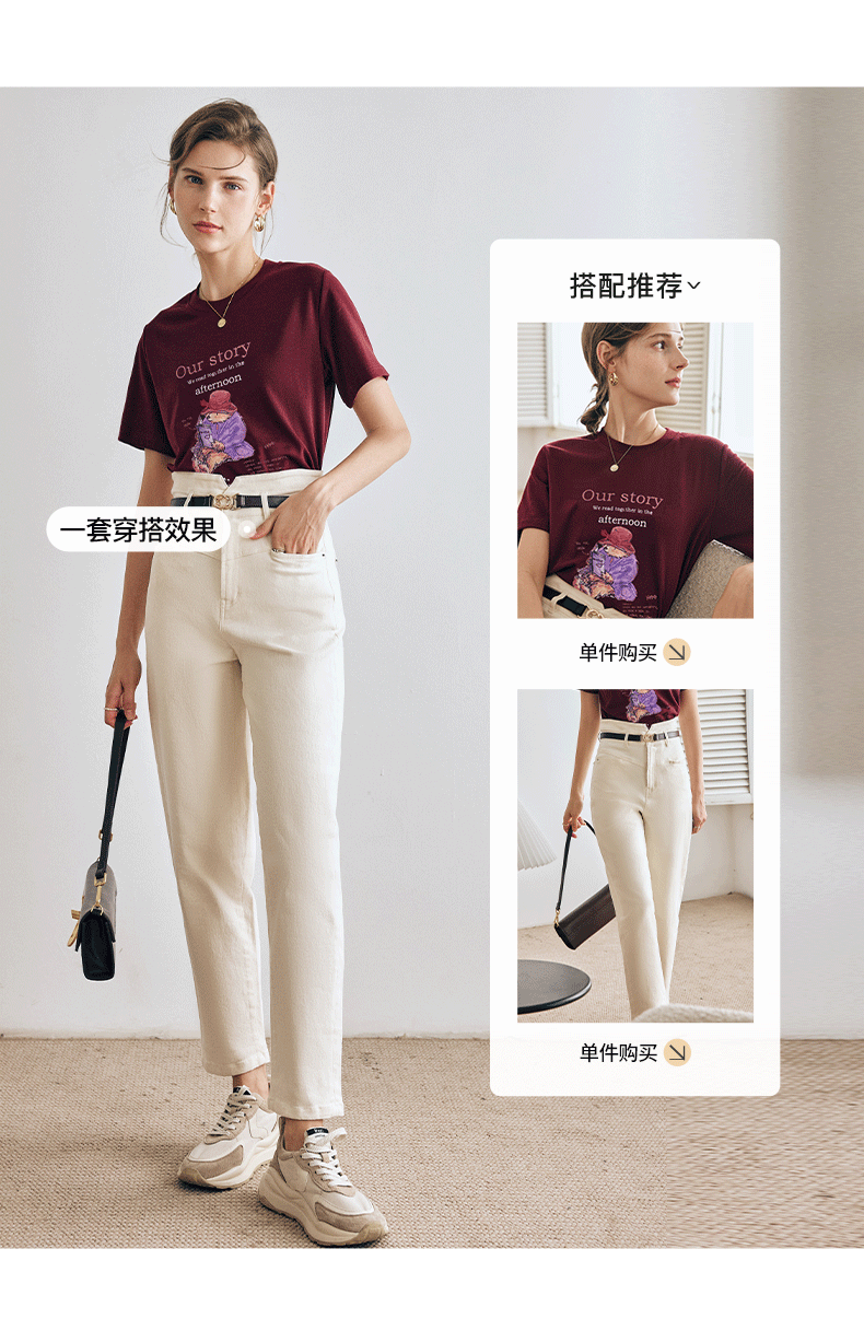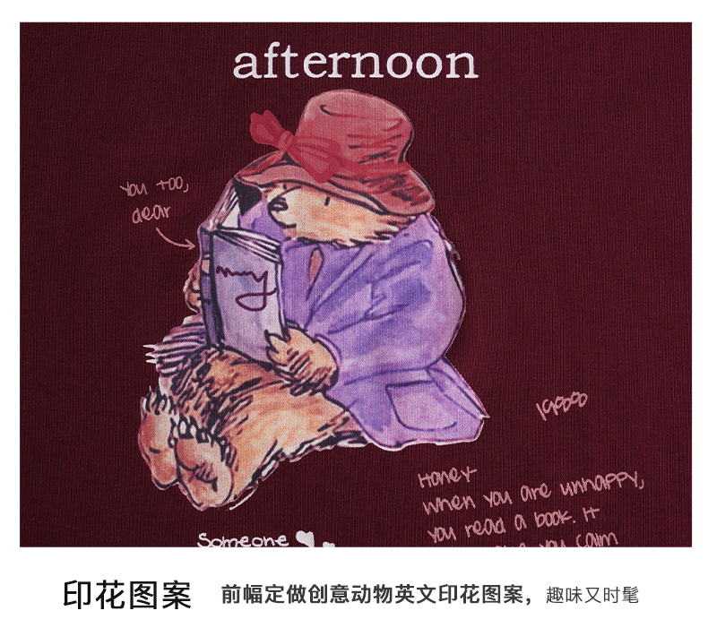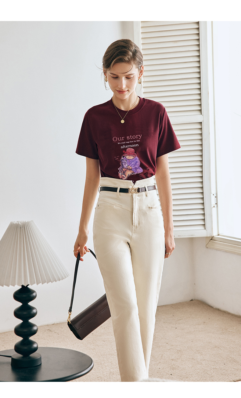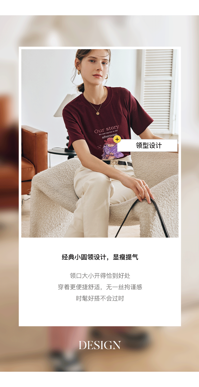 OLrain欧芮儿法式酒红色短袖T恤女夏季2023新款时尚印花正肩上衣