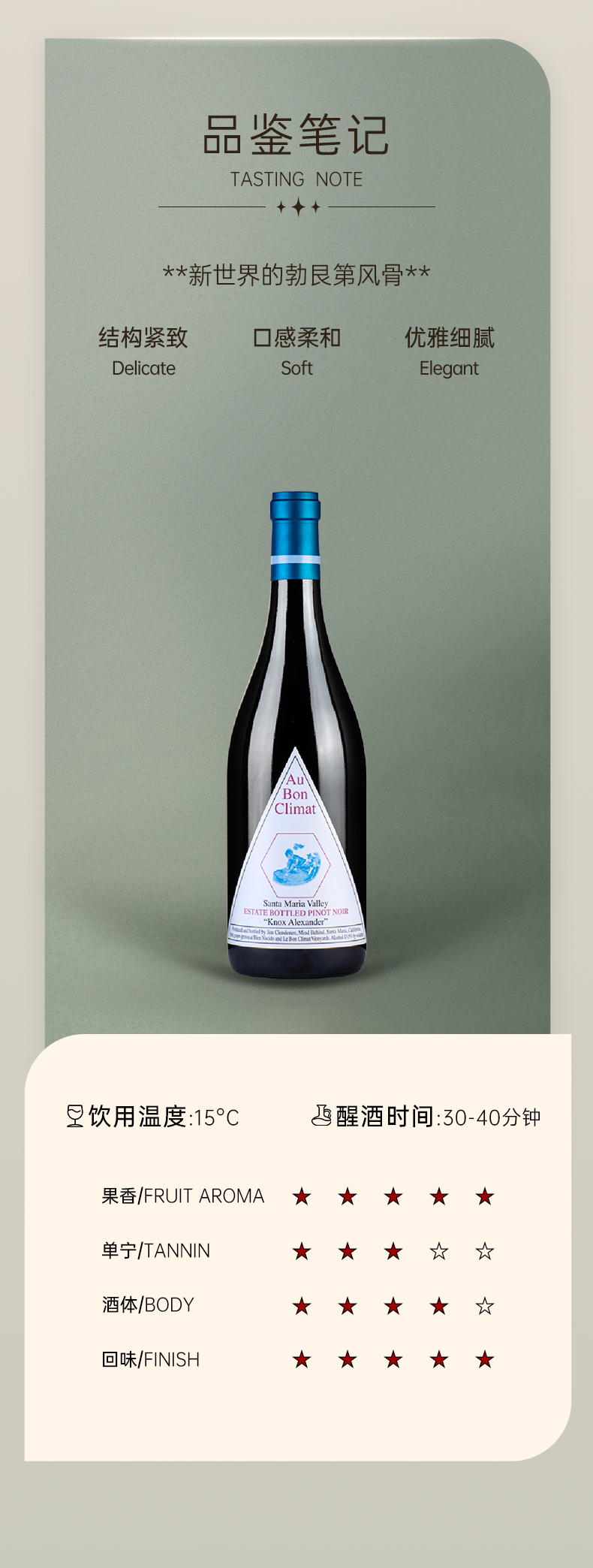 奥邦酒庄圣玛利亚传承黑皮诺红葡萄酒2020 Au Bon Climate Knox Alexander Pinot Noir Santa Maria