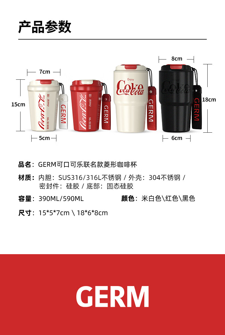 格沵(GERM)可口可乐联名保温咖啡杯便携翻盖590ml