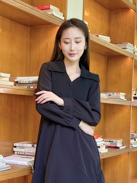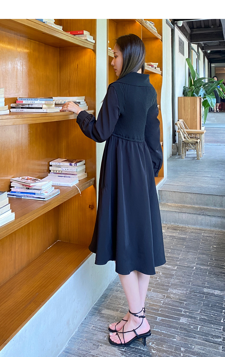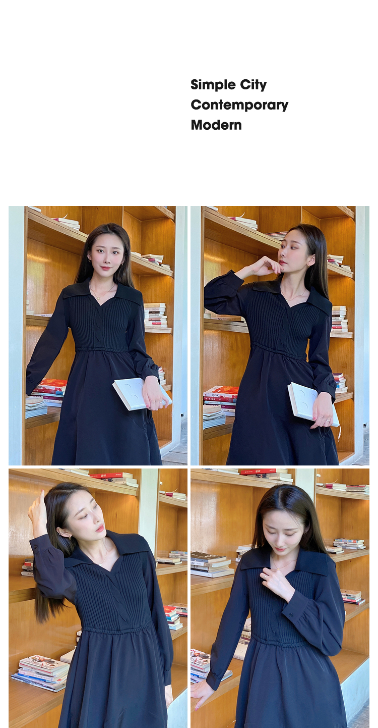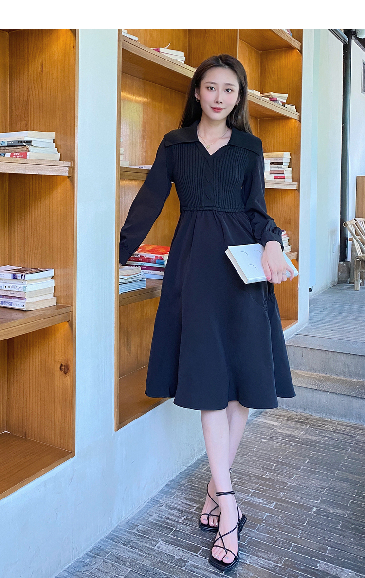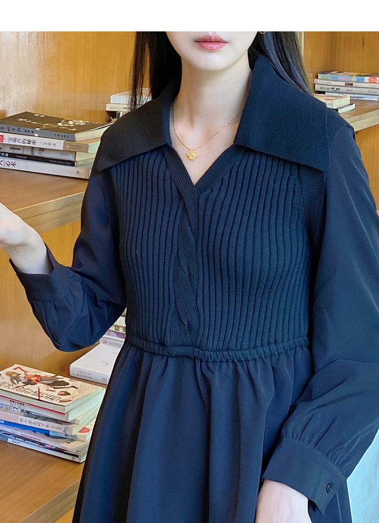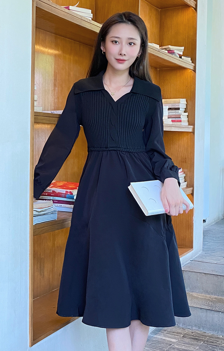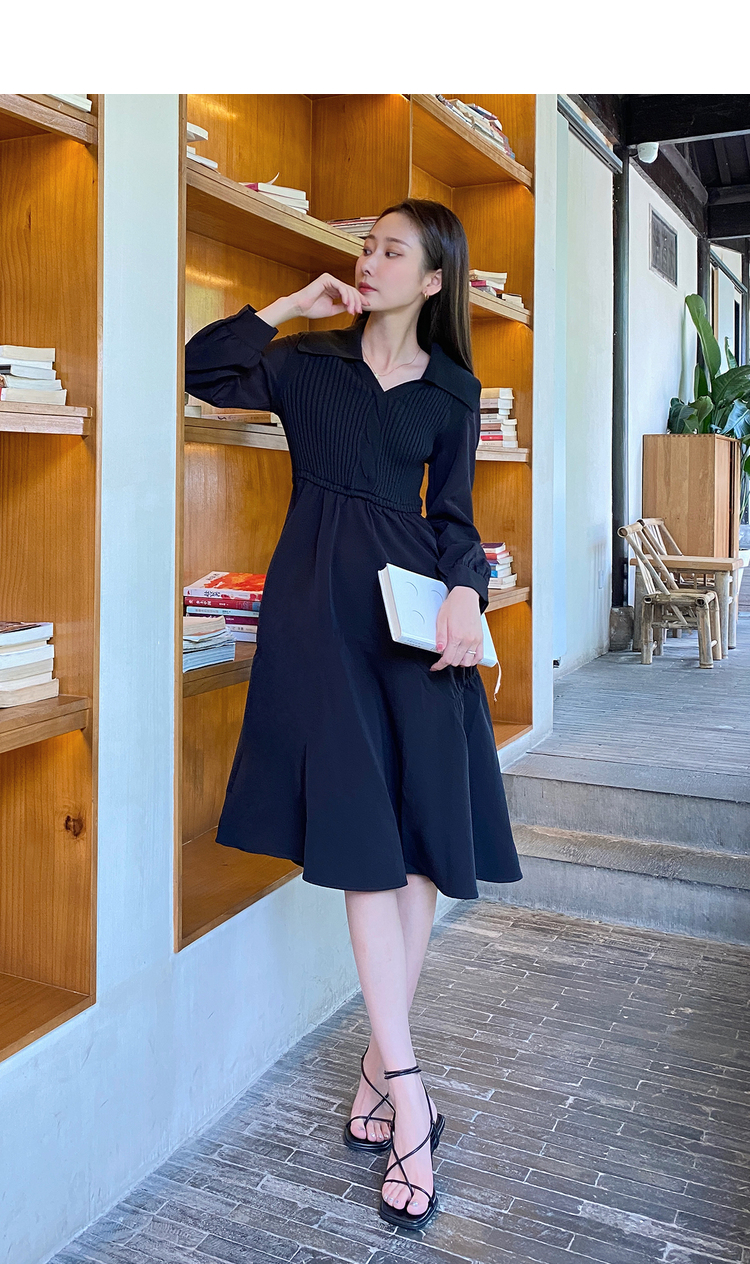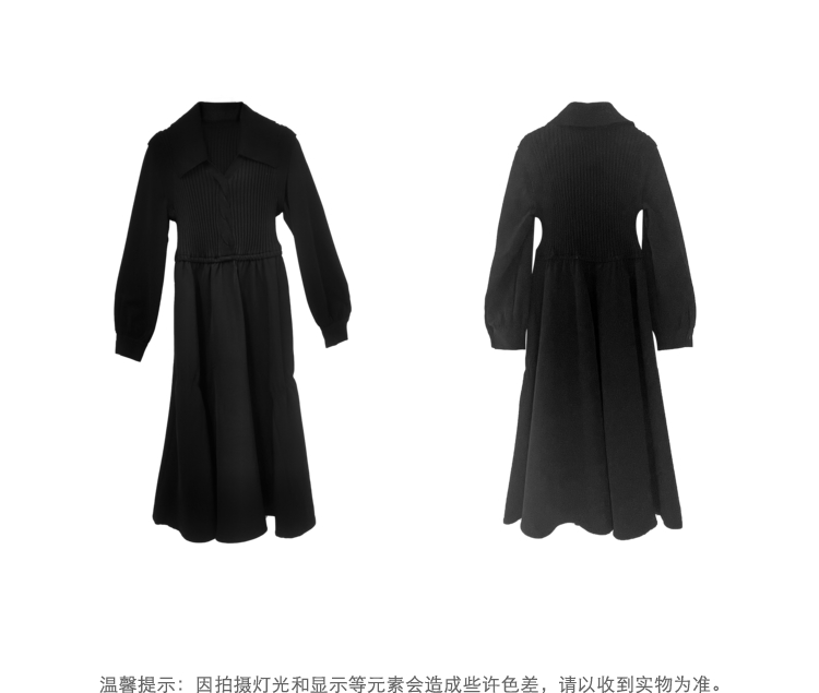 NEELLY纳俪秋季针织拼接连衣裙女气质翻领收腰中长款裙子时尚百搭N22084Y06617