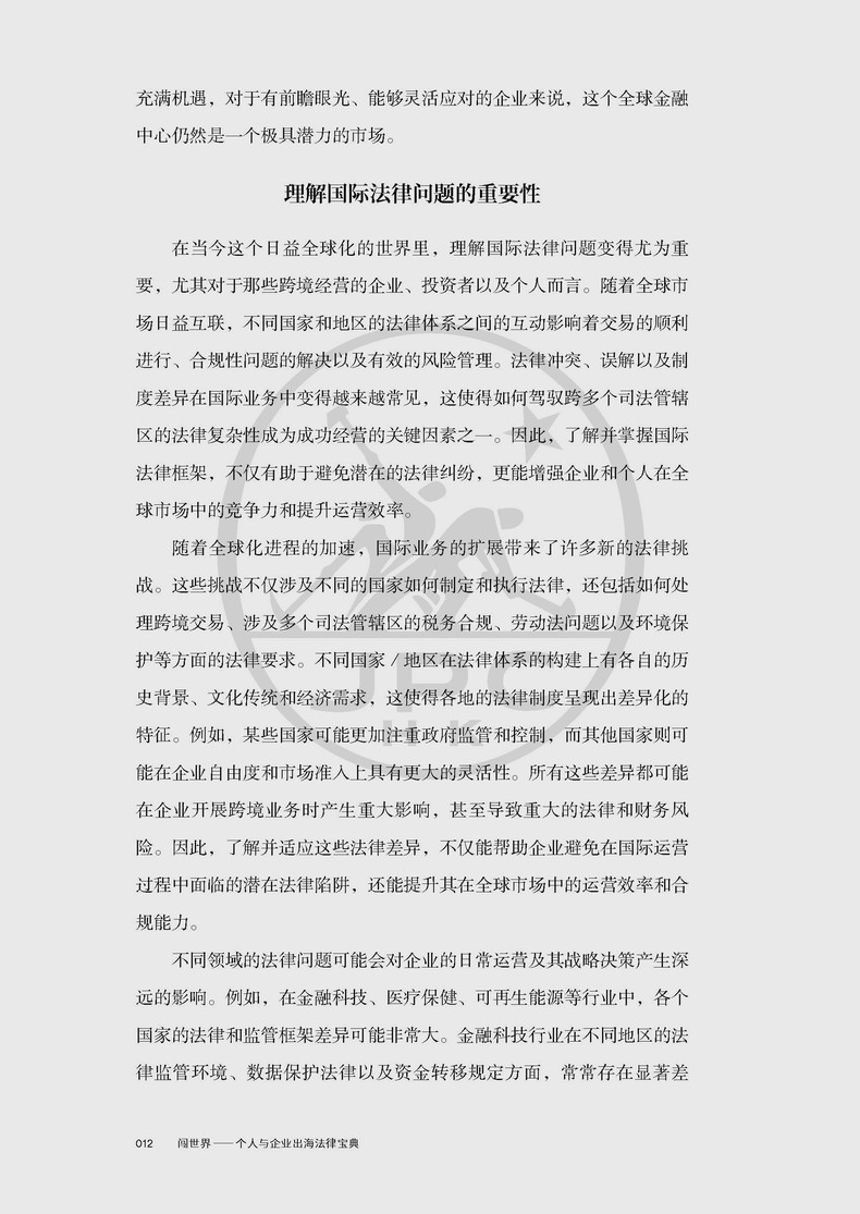 本书内容重点是对美国、英国、中国香港、印度尼西亚和阿联酋五大法域主要法律问题的介绍。无论您是跨国公司的高层管理人员、法律专业人士,还是正在寻求国际投资机会的高净值个人,本书都将为您提供有价值的参考和指引,帮助您应对国际市场中可能面临的法律挑战并抢占先机。