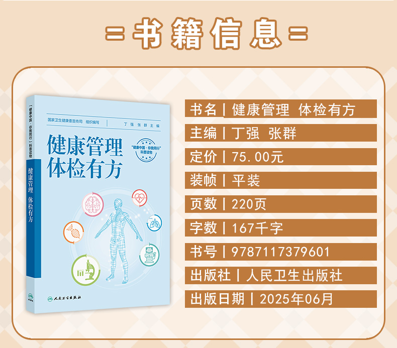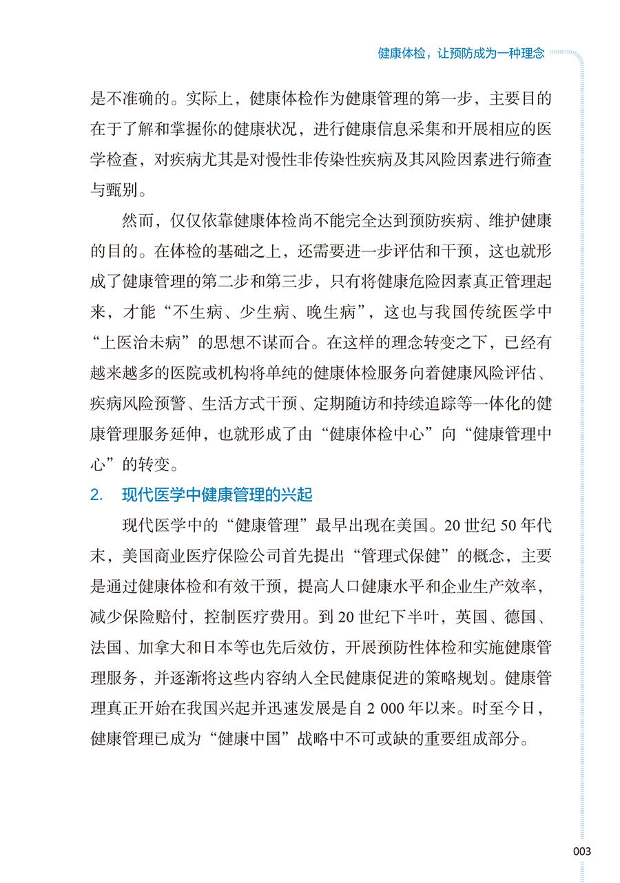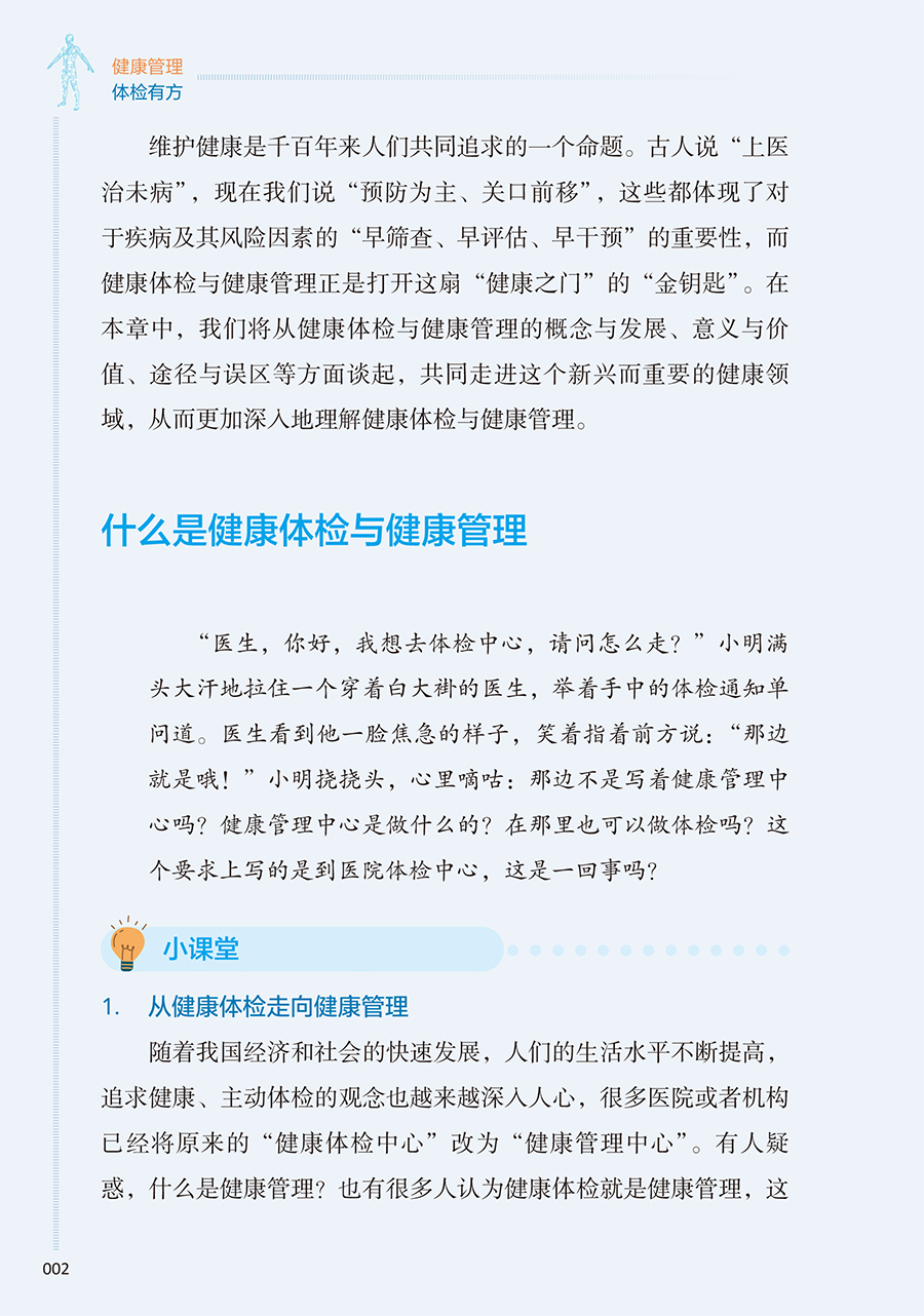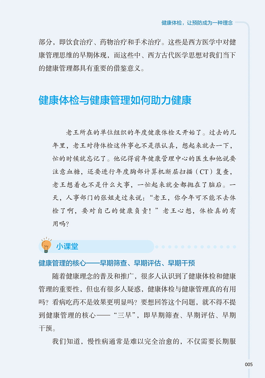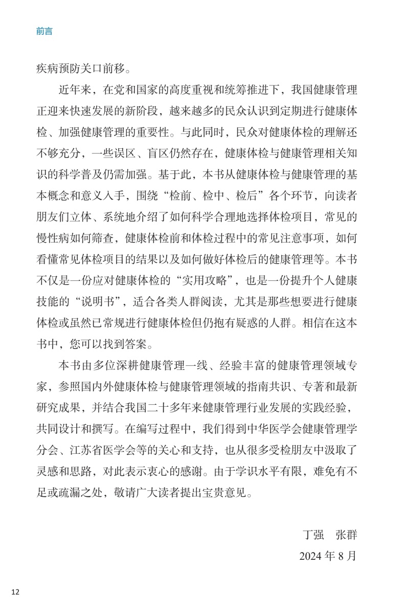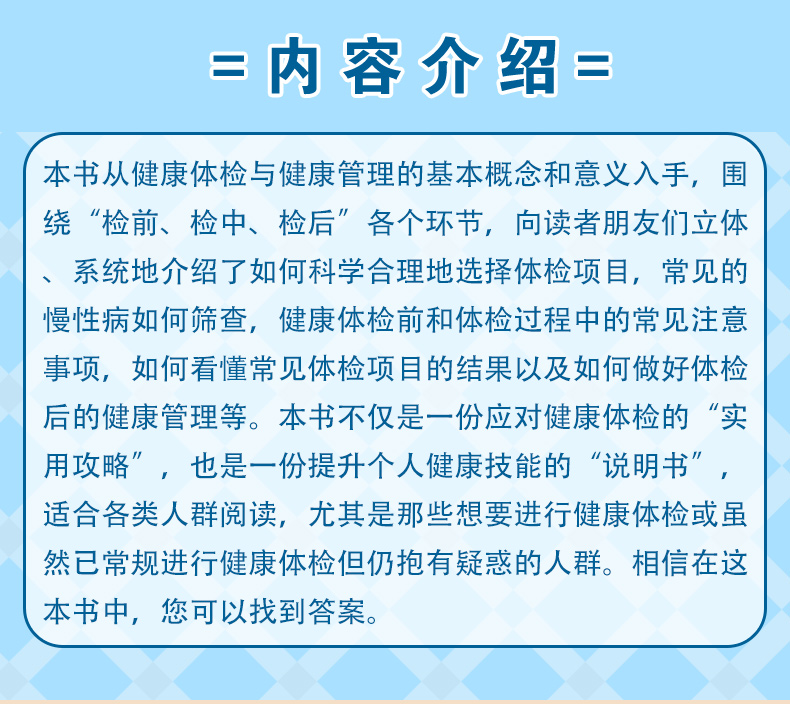 本册核心科普知识围绕“检前、检中、检后”的各个环节,共分五章:**章预防疾病从健康体检与管理开始,介绍其基本理念和重要意义;**章如何让健康体检不走过场,从“检前”介绍科学合理的体检项目的组成以及针对各类疾病如何选择筛查项目;第三章做好这些准备让健康体检更高效,介绍“检中”的注意事项;第四、五章如何看懂体检报告、如何做好健康管理,从“检后”角度,对常见报告内容进行解读,并对整体的健康管理提出建议。