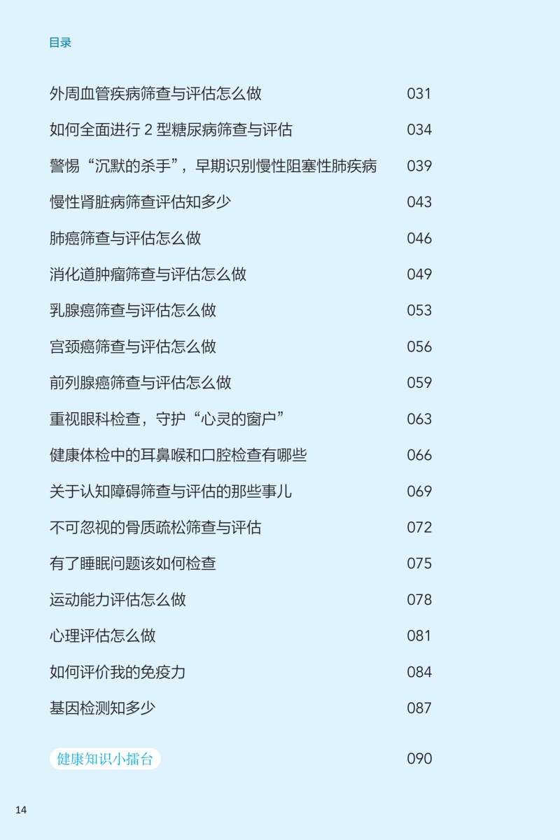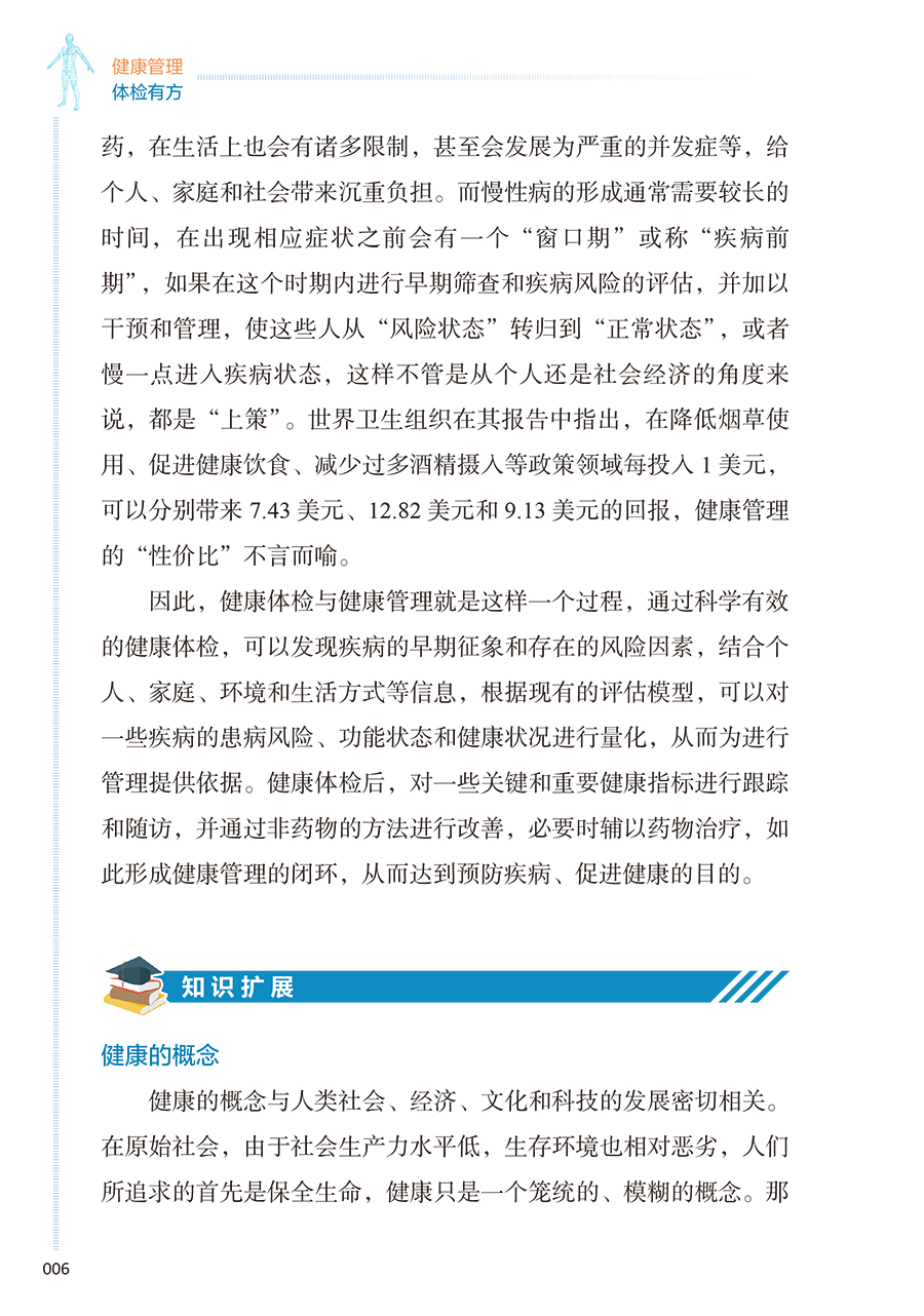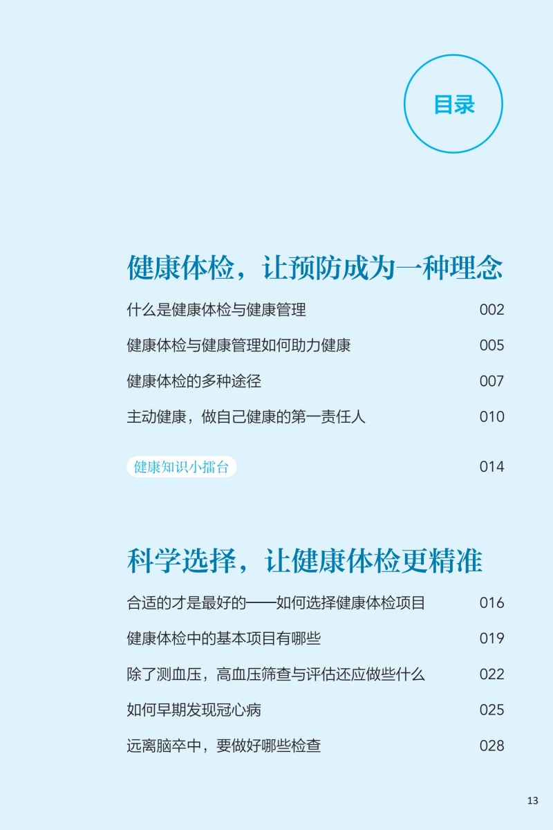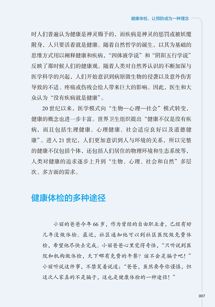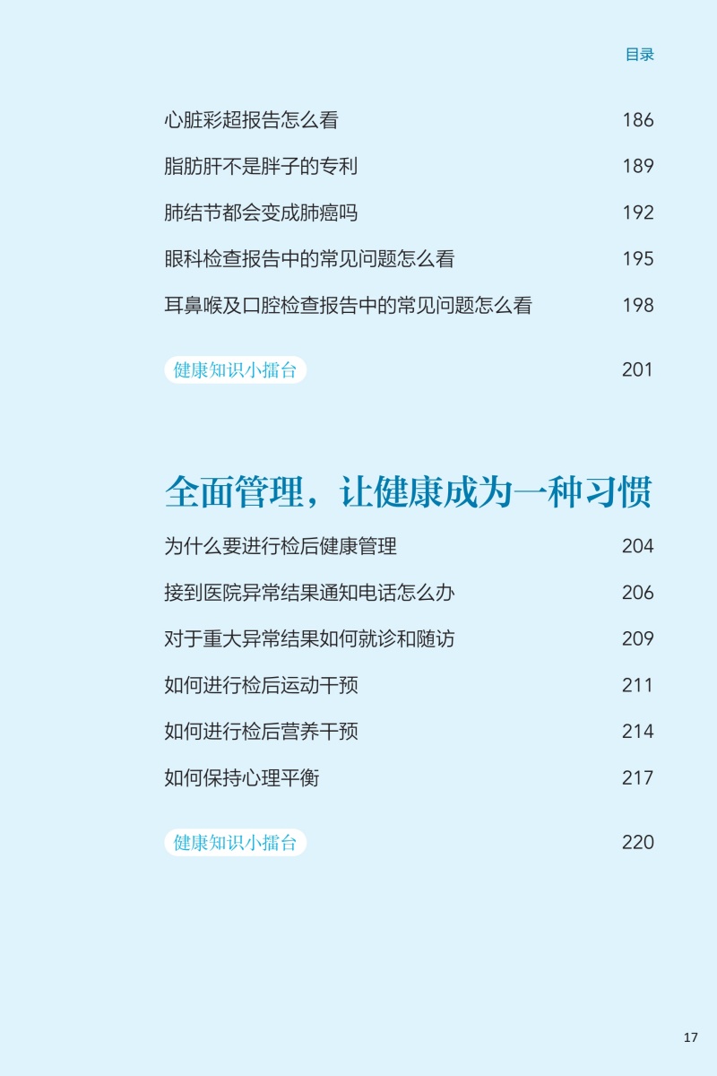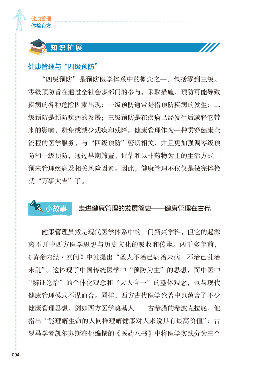 本册核心科普知识围绕“检前、检中、检后”的各个环节,共分五章:**章预防疾病从健康体检与管理开始,介绍其基本理念和重要意义;**章如何让健康体检不走过场,从“检前”介绍科学合理的体检项目的组成以及针对各类疾病如何选择筛查项目;第三章做好这些准备让健康体检更高效,介绍“检中”的注意事项;第四、五章如何看懂体检报告、如何做好健康管理,从“检后”角度,对常见报告内容进行解读,并对整体的健康管理提出建议。