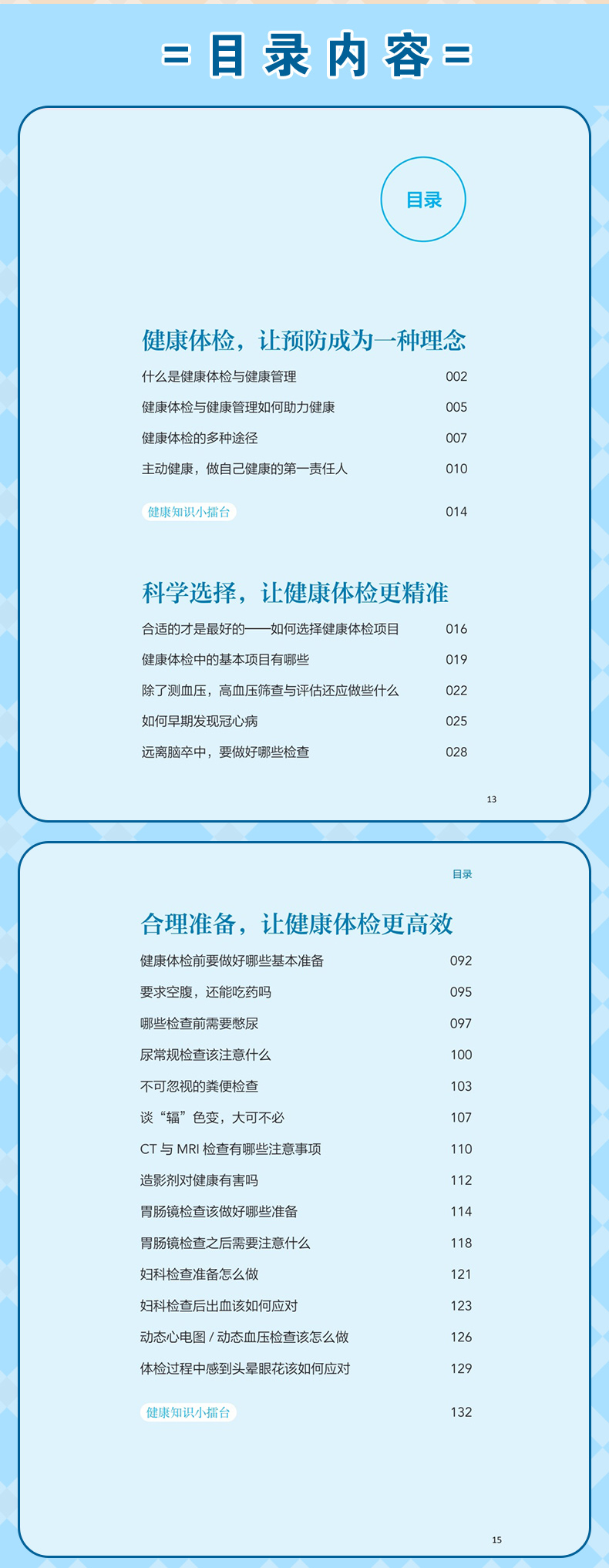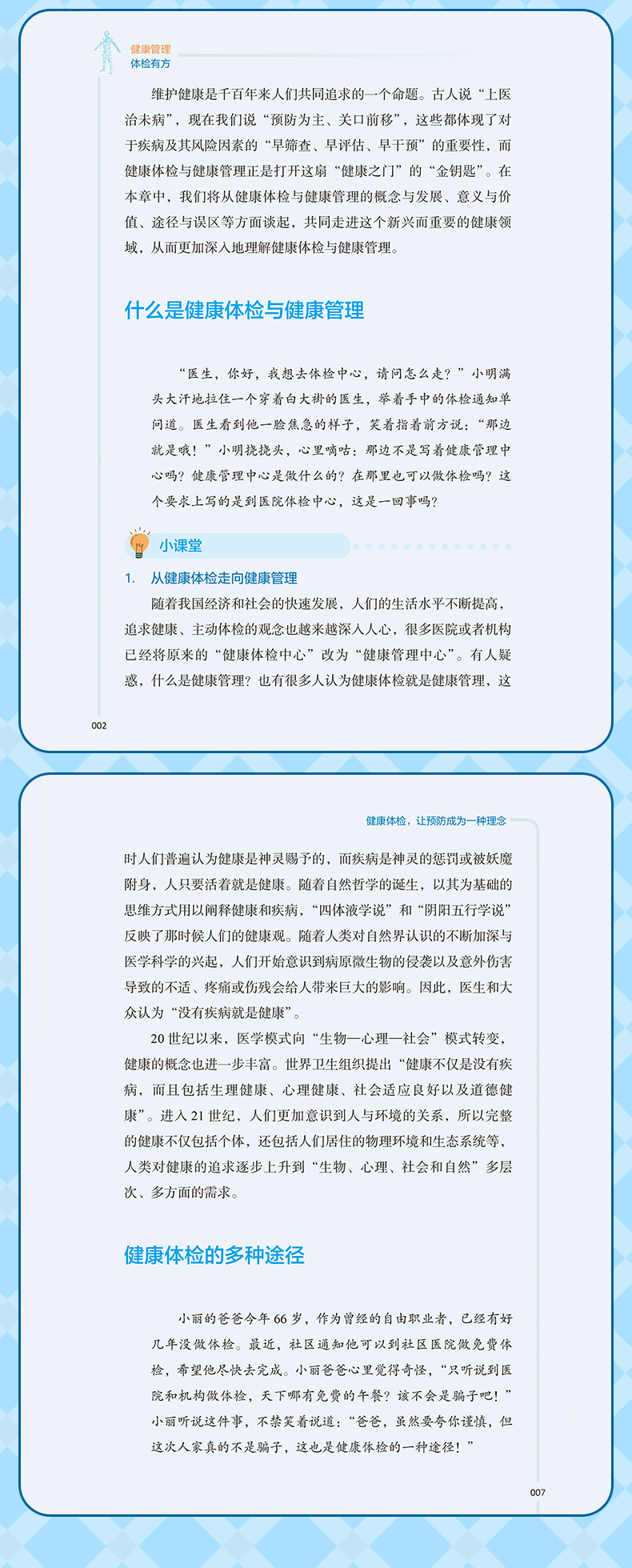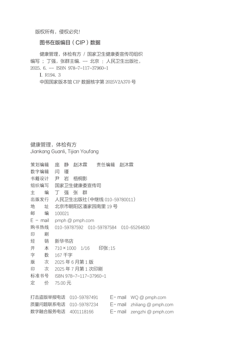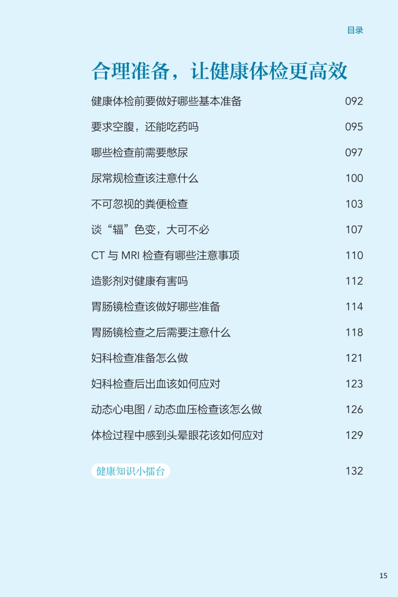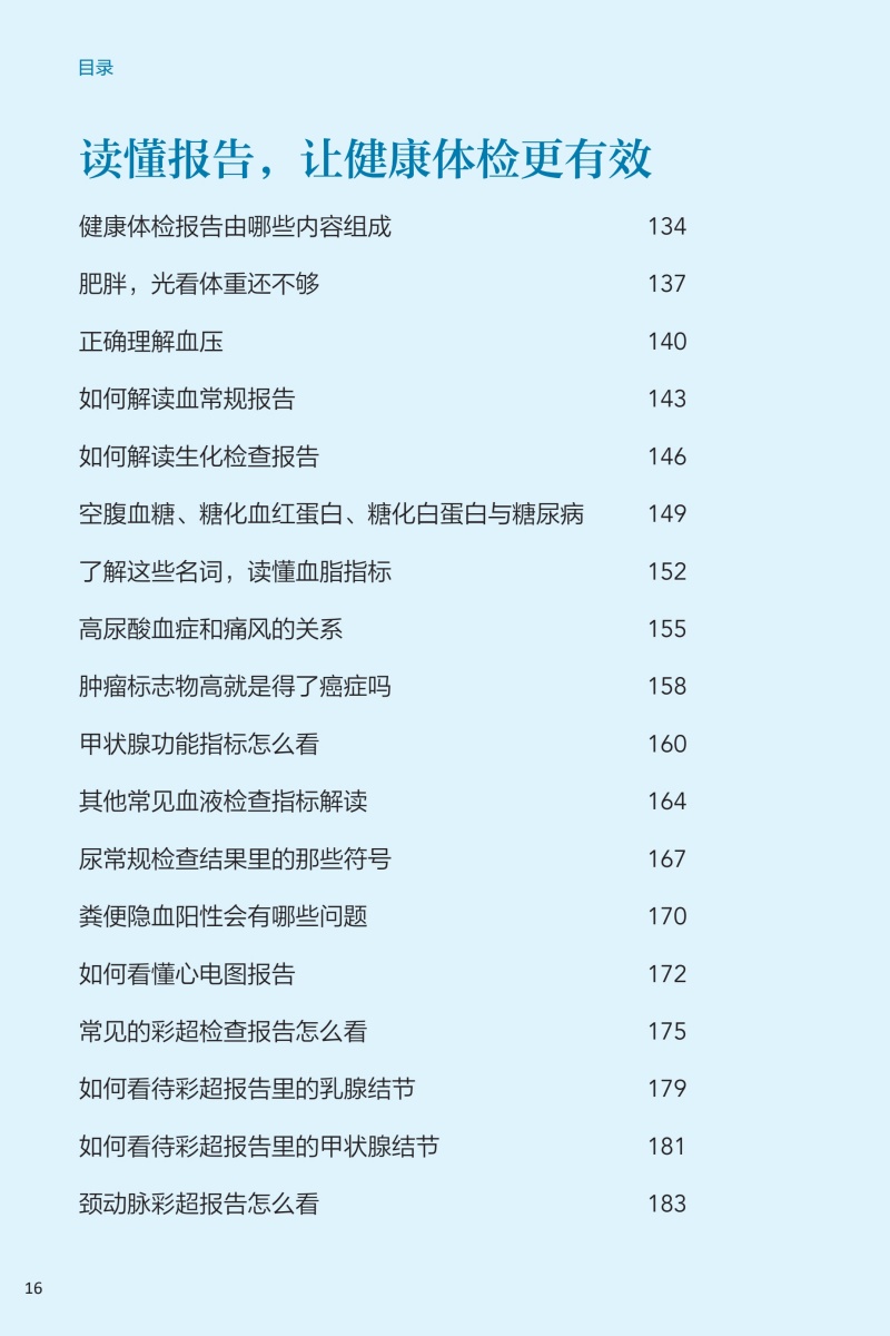 本册核心科普知识围绕“检前、检中、检后”的各个环节,共分五章:**章预防疾病从健康体检与管理开始,介绍其基本理念和重要意义;**章如何让健康体检不走过场,从“检前”介绍科学合理的体检项目的组成以及针对各类疾病如何选择筛查项目;第三章做好这些准备让健康体检更高效,介绍“检中”的注意事项;第四、五章如何看懂体检报告、如何做好健康管理,从“检后”角度,对常见报告内容进行解读,并对整体的健康管理提出建议。