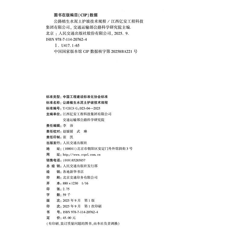书名:公路植生水泥土护坡技术规程(T/CECS G:D23-04—2025)