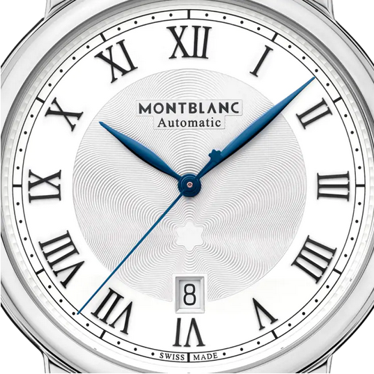 镜面 材质 | 蓝宝石水晶玻璃 | 表盘 | 精钢抛光表壳 白色表盘饰有放射状万宝龙六角白星玑镂雕刻图案,玑镂刻花(filet sauté guilloché),黑色罗马数字时标,蓝色柳叶形时针、分针,底端饰有万宝龙六角白星标识的蓝色巴顿式秒针。 日期显示 透底 |