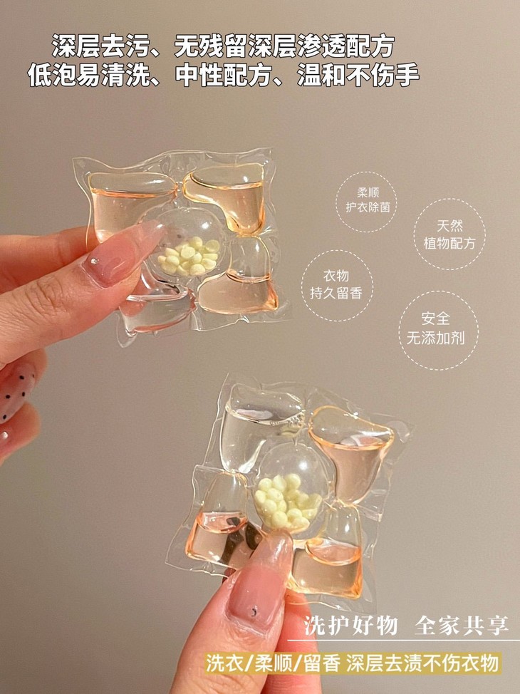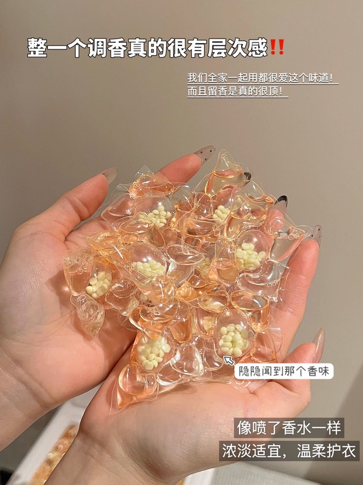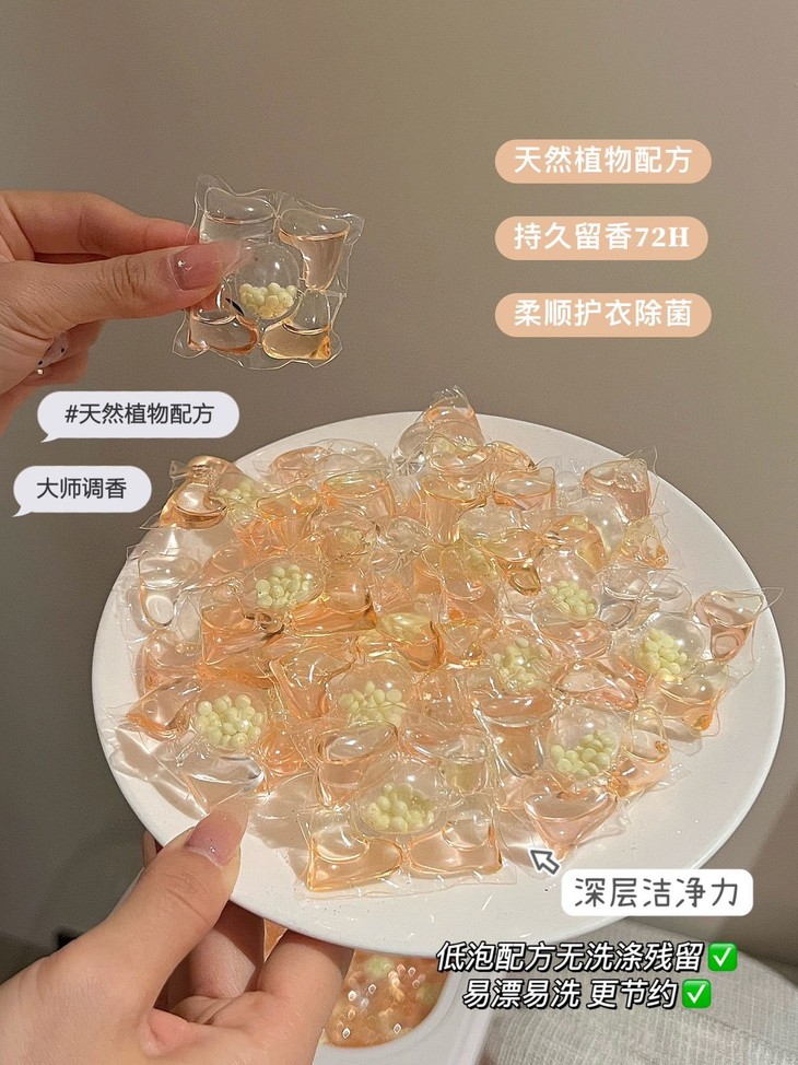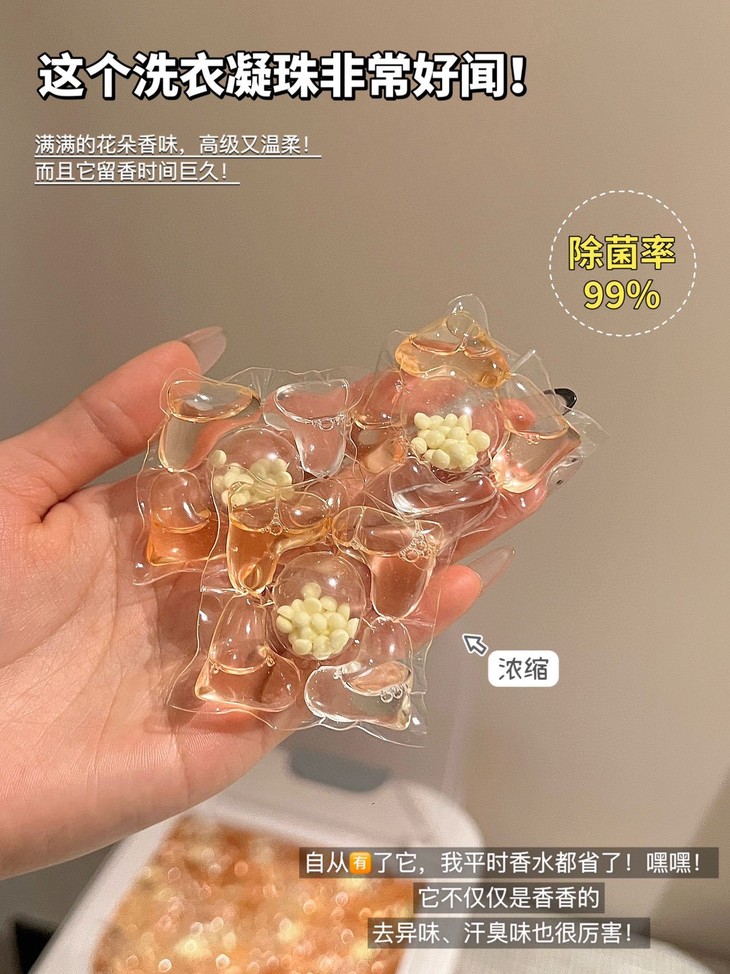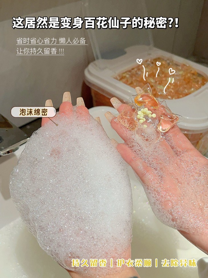 一颗就能搞定清洁、柔顺、除🦠、护色、去油渍、去味等 简直不要太方便 而且还是3d立体环绕珠中珠的设计 除🦠除螨都轻松给拿捏住!! 它的膜衣遇水即溶!! 不用担心会黏在衣服上 使用起来嘎嘎方便!! 而且它的香味也巨巨巨巨好闻 留香时间还可持久!! 这是什么自带伪体香!!!