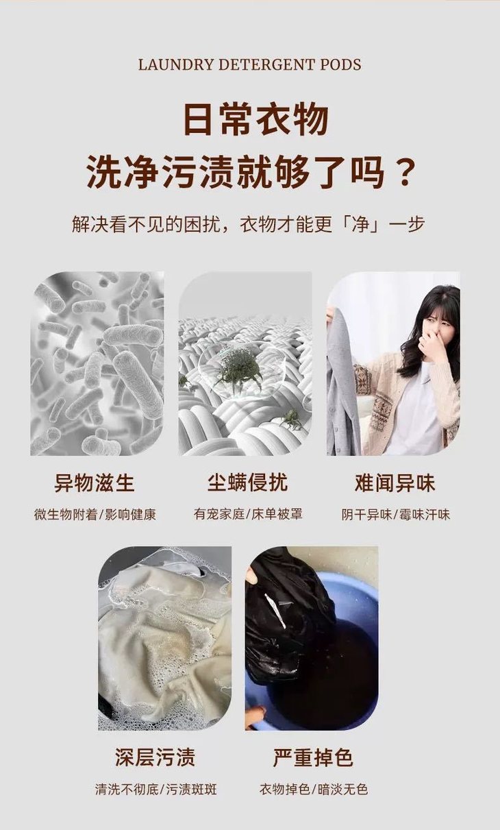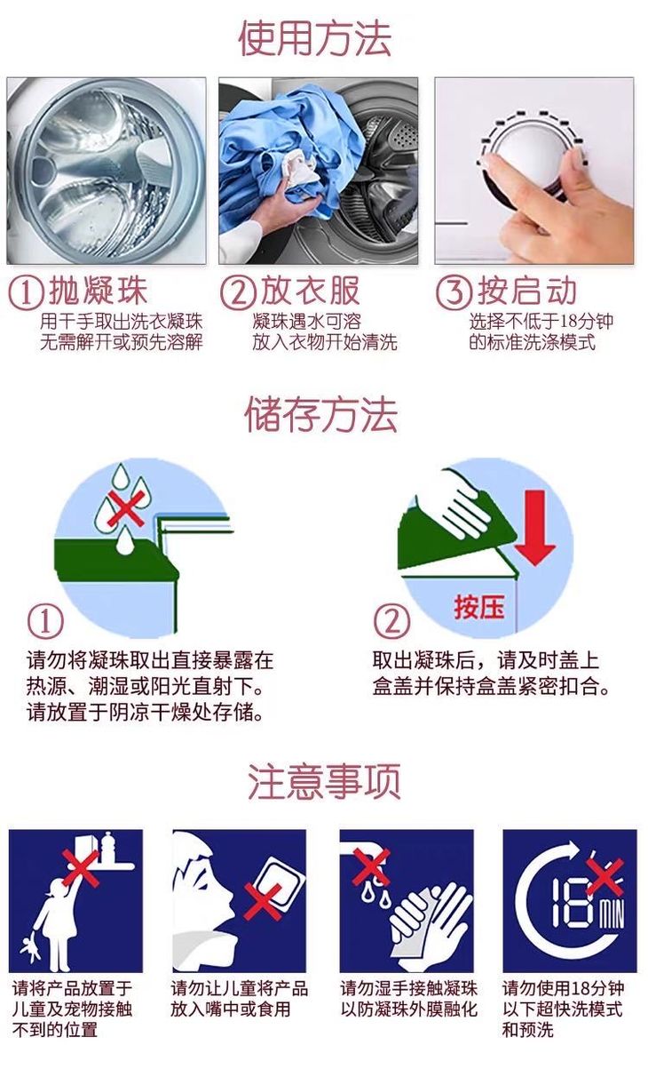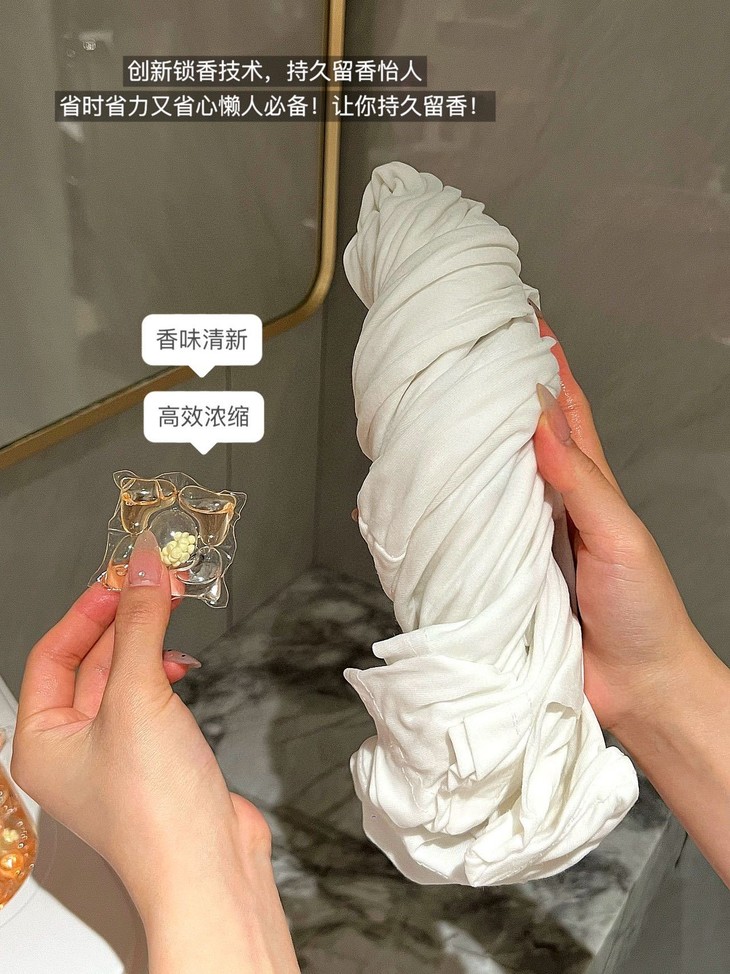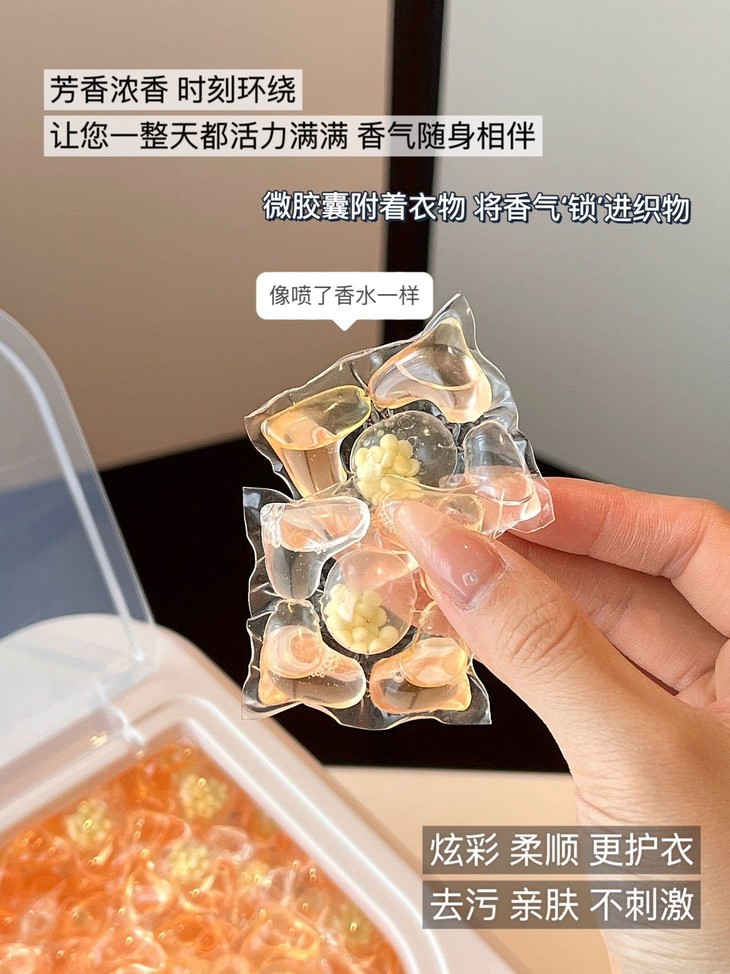 一颗就能搞定清洁、柔顺、除🦠、护色、去油渍、去味等 简直不要太方便 而且还是3d立体环绕珠中珠的设计 除🦠除螨都轻松给拿捏住!! 它的膜衣遇水即溶!! 不用担心会黏在衣服上 使用起来嘎嘎方便!! 而且它的香味也巨巨巨巨好闻 留香时间还可持久!! 这是什么自带伪体香!!!