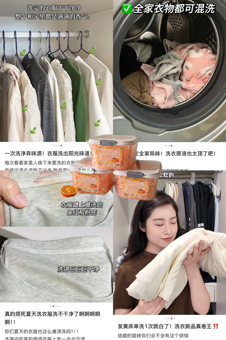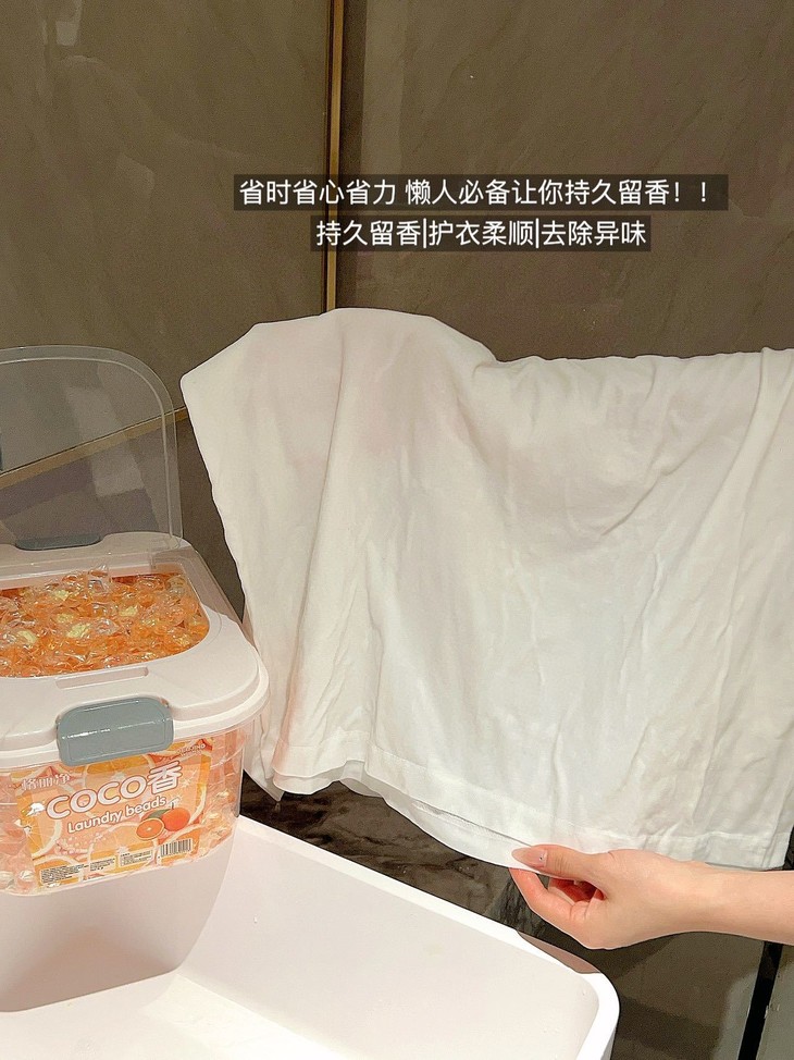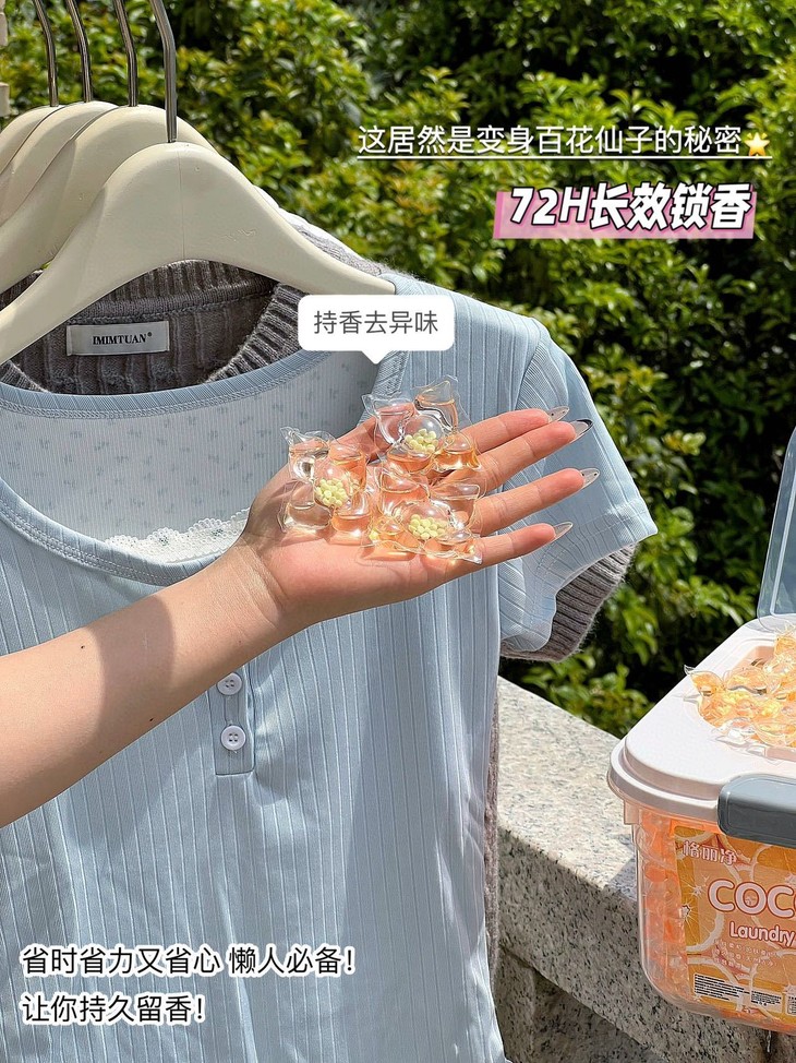 打开盖子就是一种温柔韵欲的COCO香! 仿佛是漫步在花田间的温柔少女 浑身散发着迷人的香味 它集洗衣液+留香珠+柔顺剂+除菌液于一身 一颗轻松搞定一大桶衣物 现在洗完之后的衣服柔软清香 衣柜里面全都是香喷喷 跟腌入味儿了一样! 感觉好像每天都在穿新衣服!