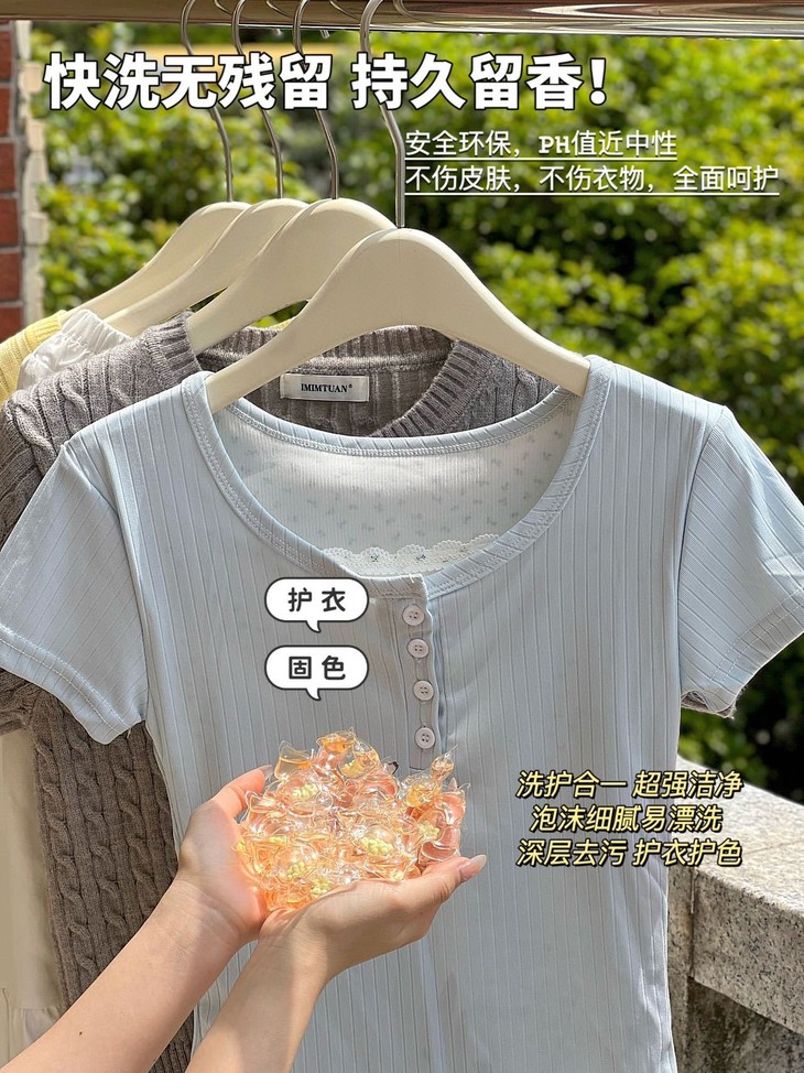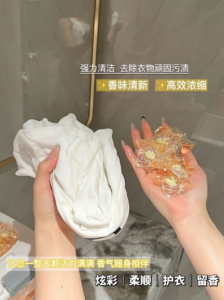 衣服软软的,颜色也亮亮的,好像每次洗完都有新衣服穿的感觉!重点是,旅行出游带着超方便,小巧不占地方,行李箱里的秘密武器🛡! 小贴士:记得看准用量哦,小小一颗能量大大,多了可能会有点“香过头”哈哈! 快来试试,让我们一起做香香的精致girl吧!你,值得拥有这份来自格丽净的小确幸!