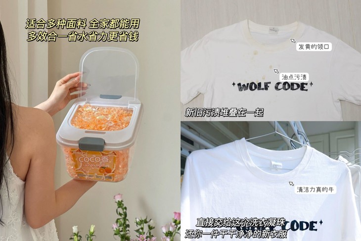 使用对比 一颗就能代替洗衣液+留香珠+柔顺剂+除菌液 对懒人简直不要太友好 而且遇水即溶 洗完的衣服放在衣柜里,衣柜都是香香的!