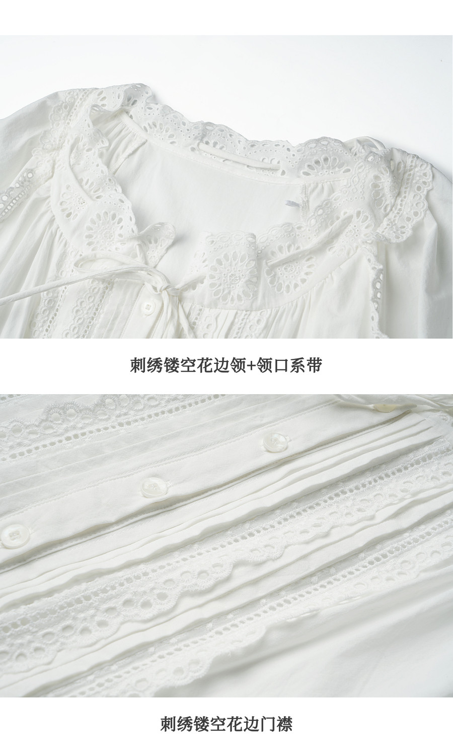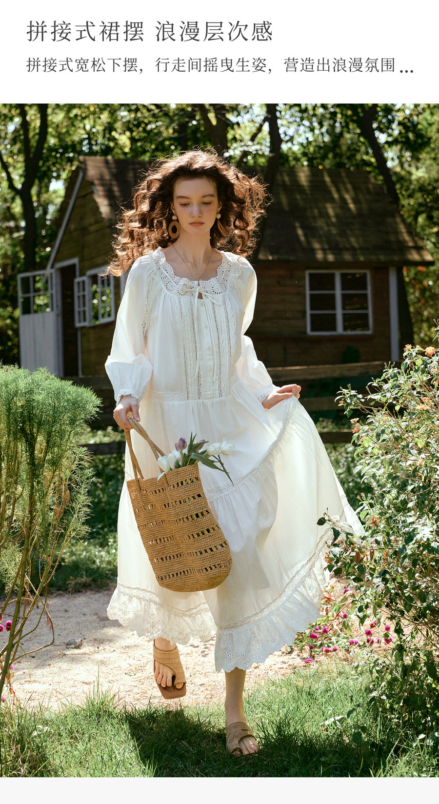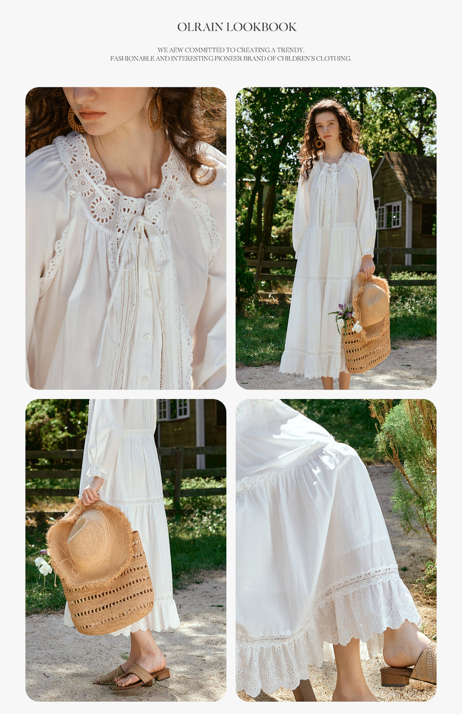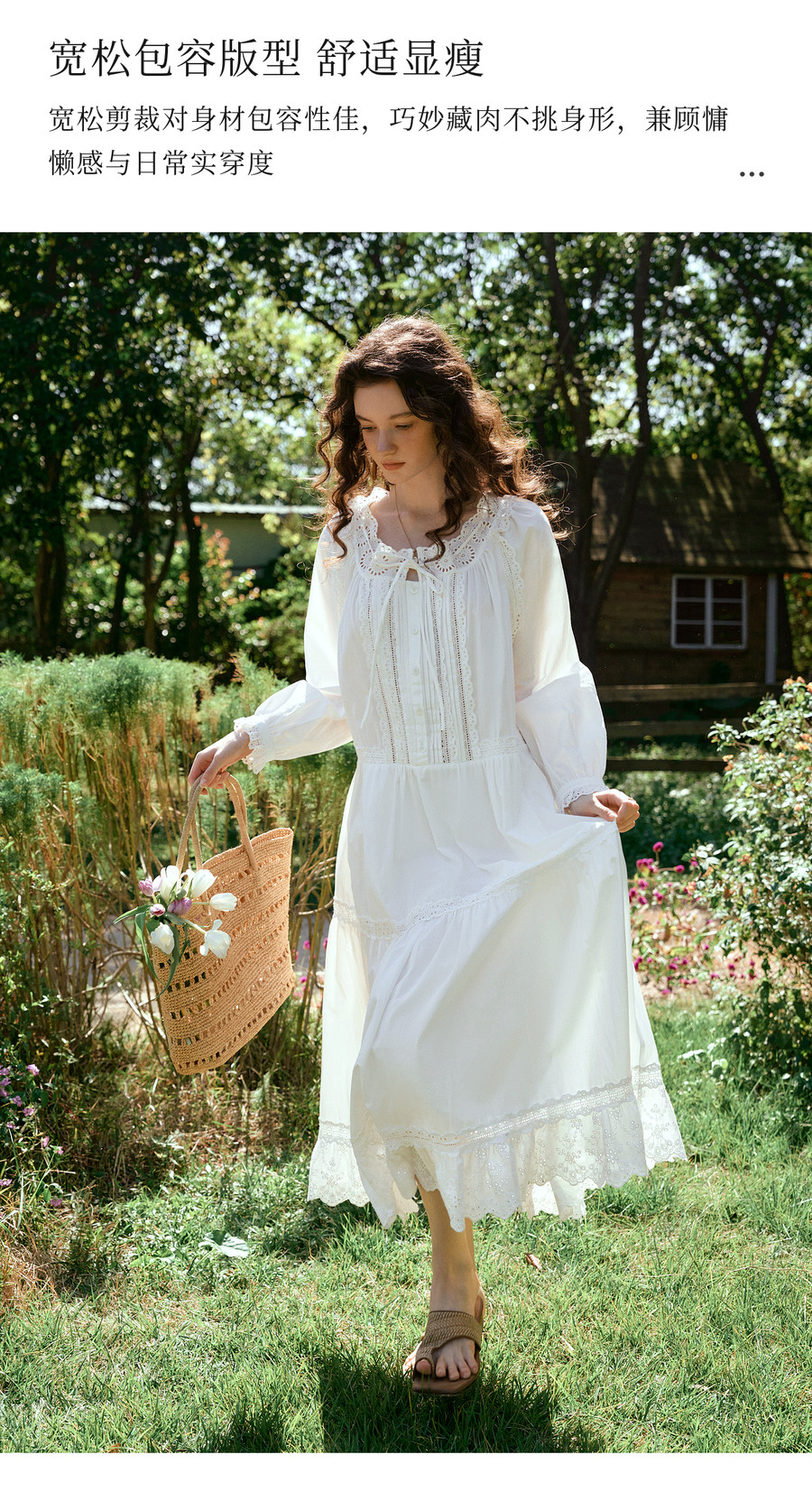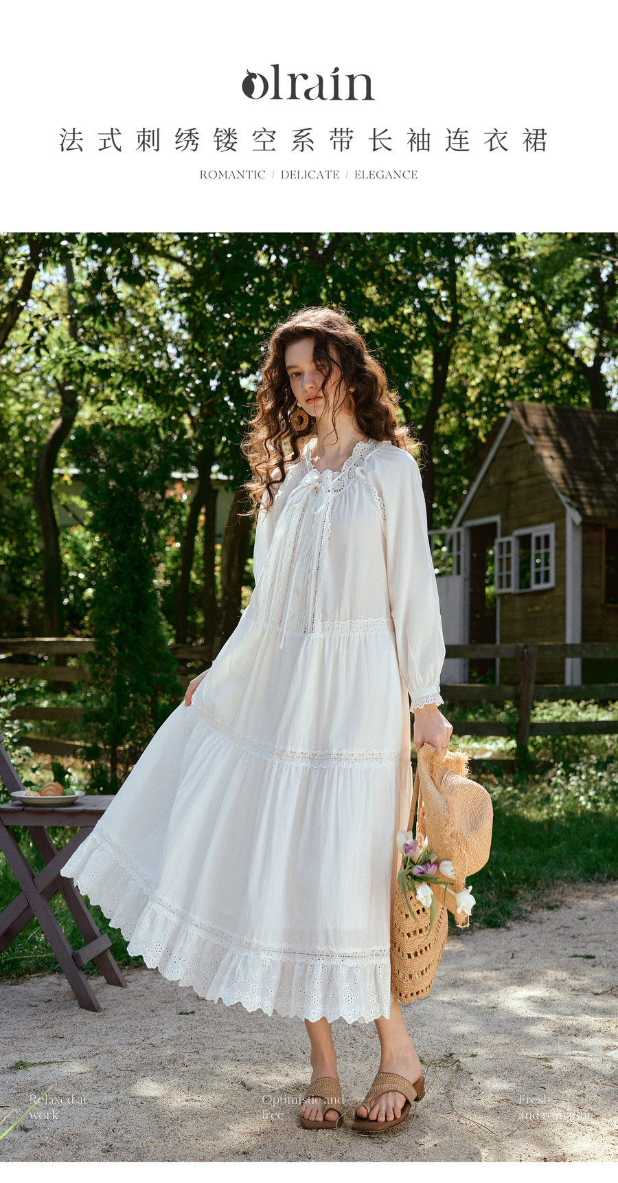 法式刺绣镂空花边领系带长袖连衣裙女春季休闲宽松显瘦白色长裙