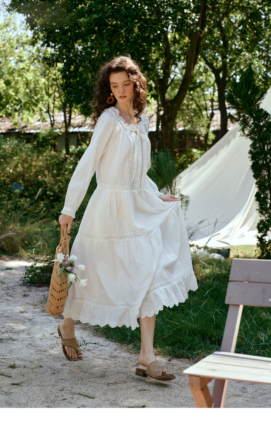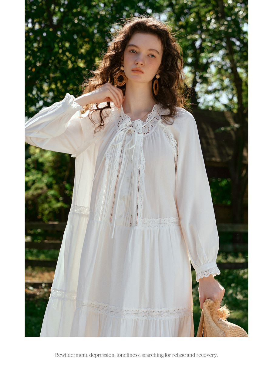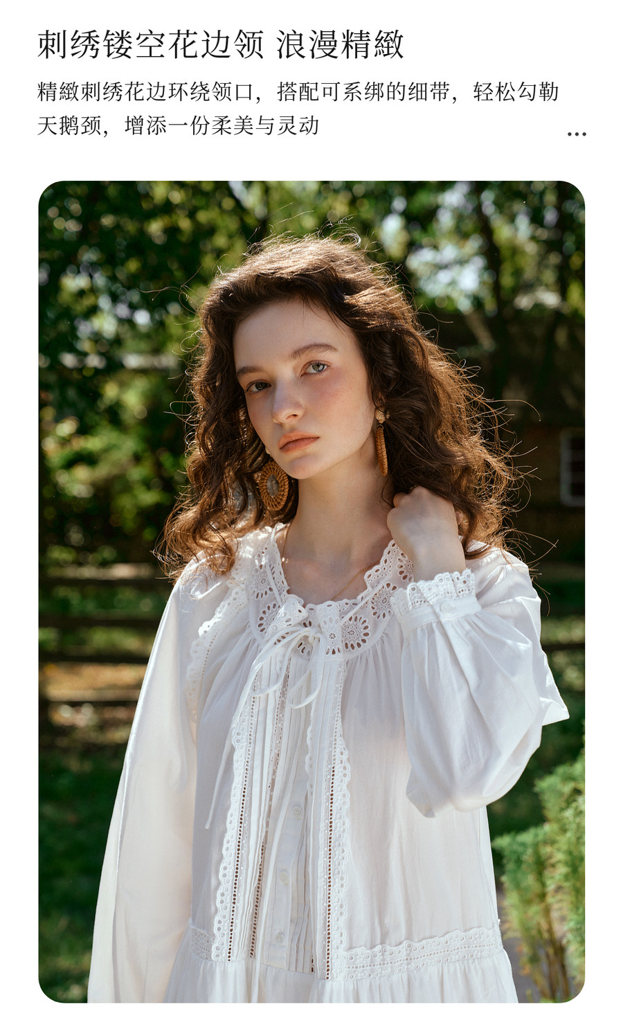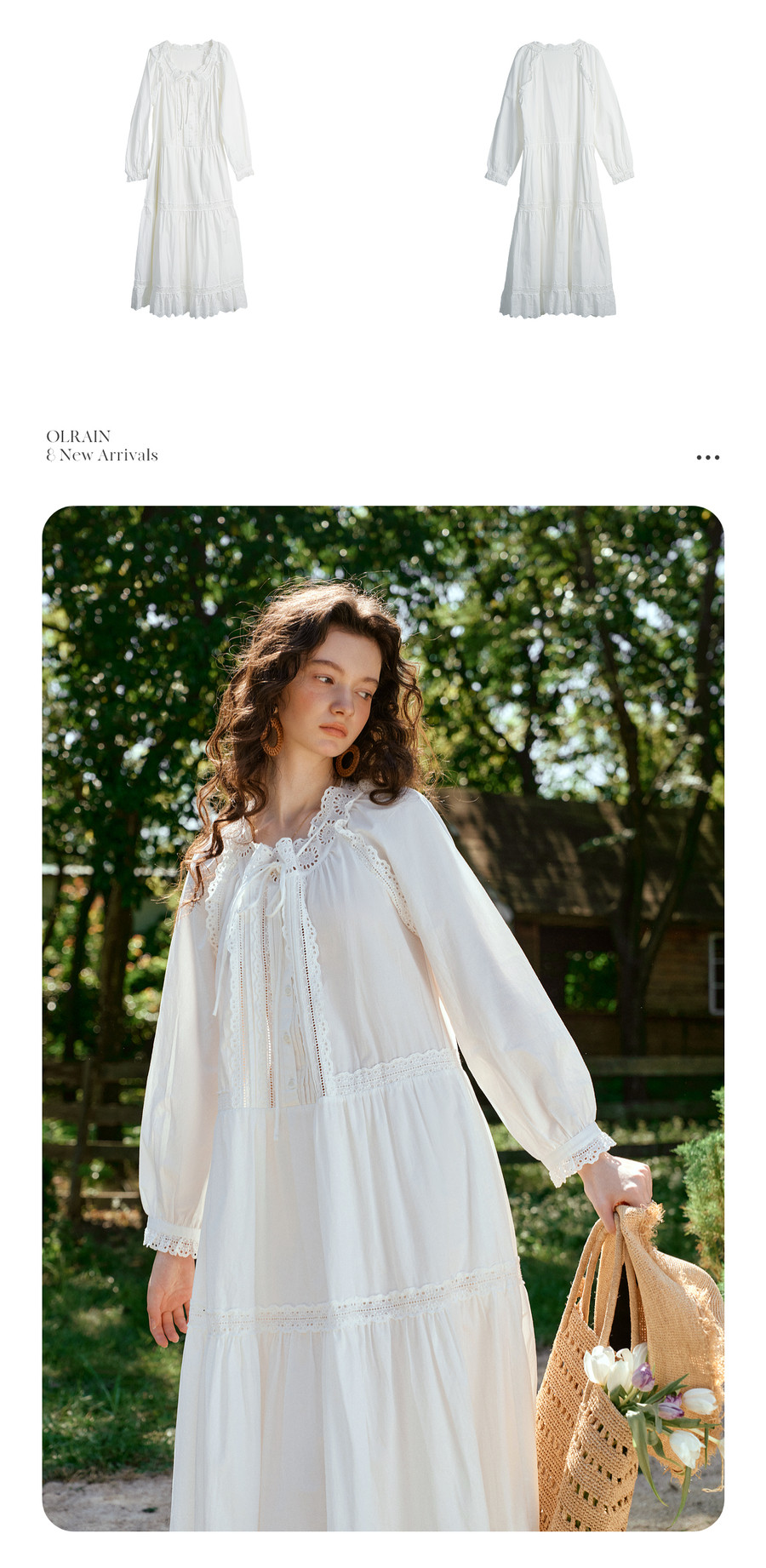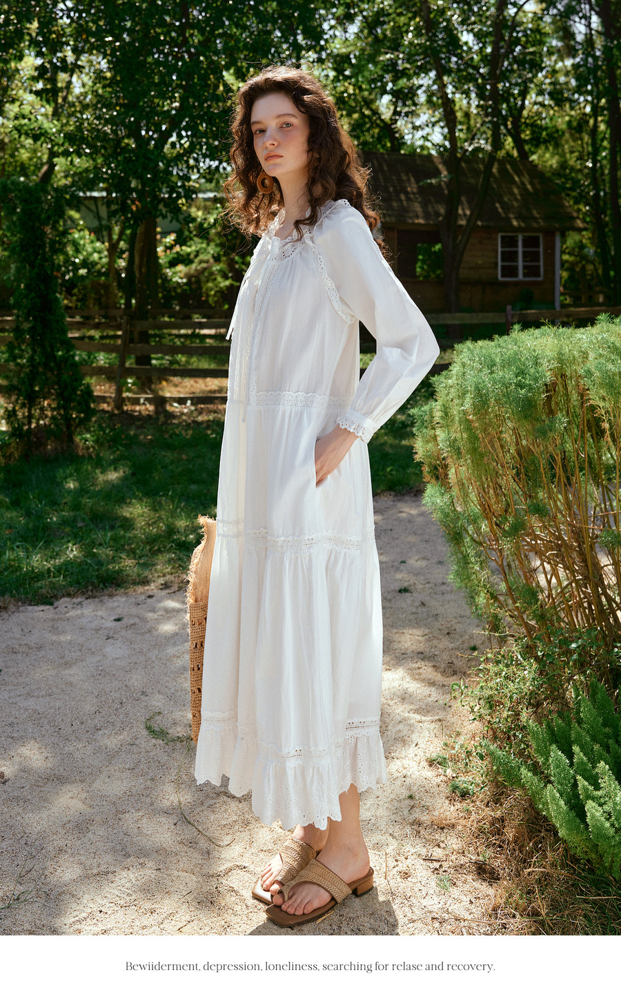 法式刺绣镂空花边领系带长袖连衣裙女春季休闲宽松显瘦白色长裙