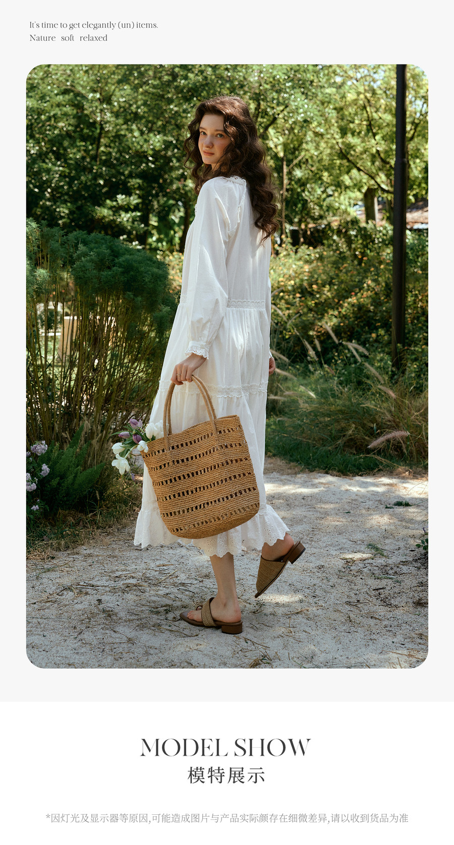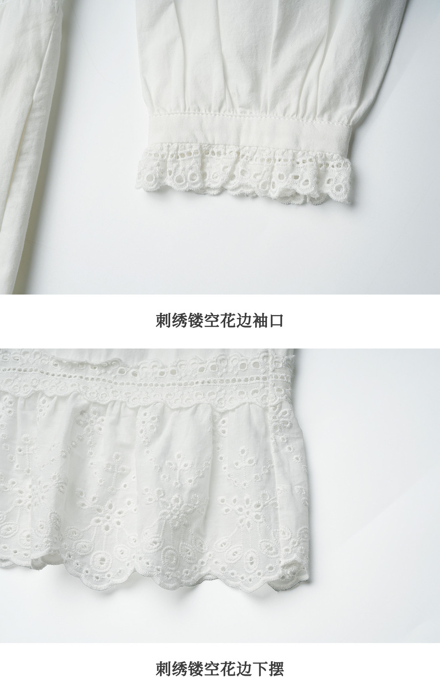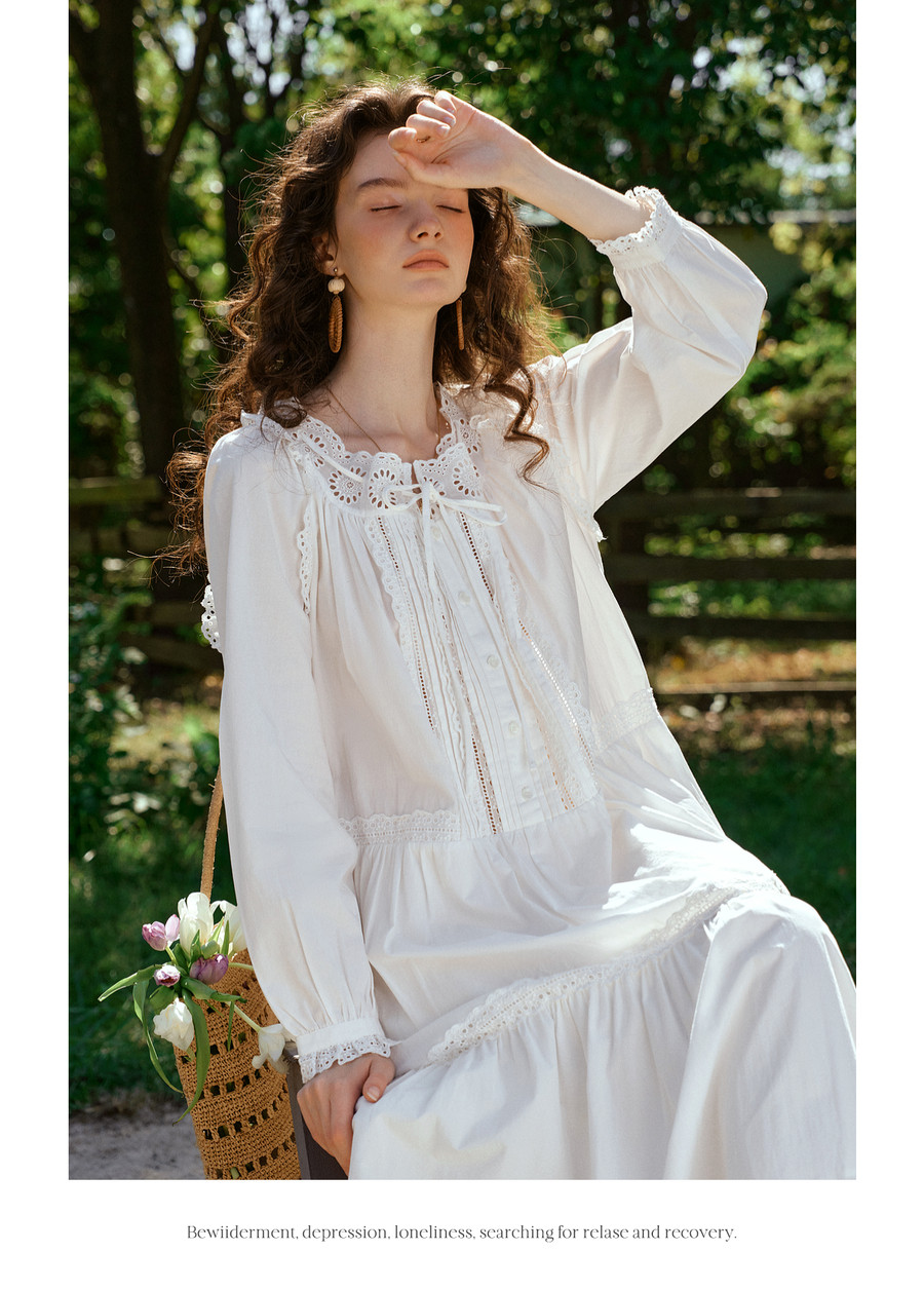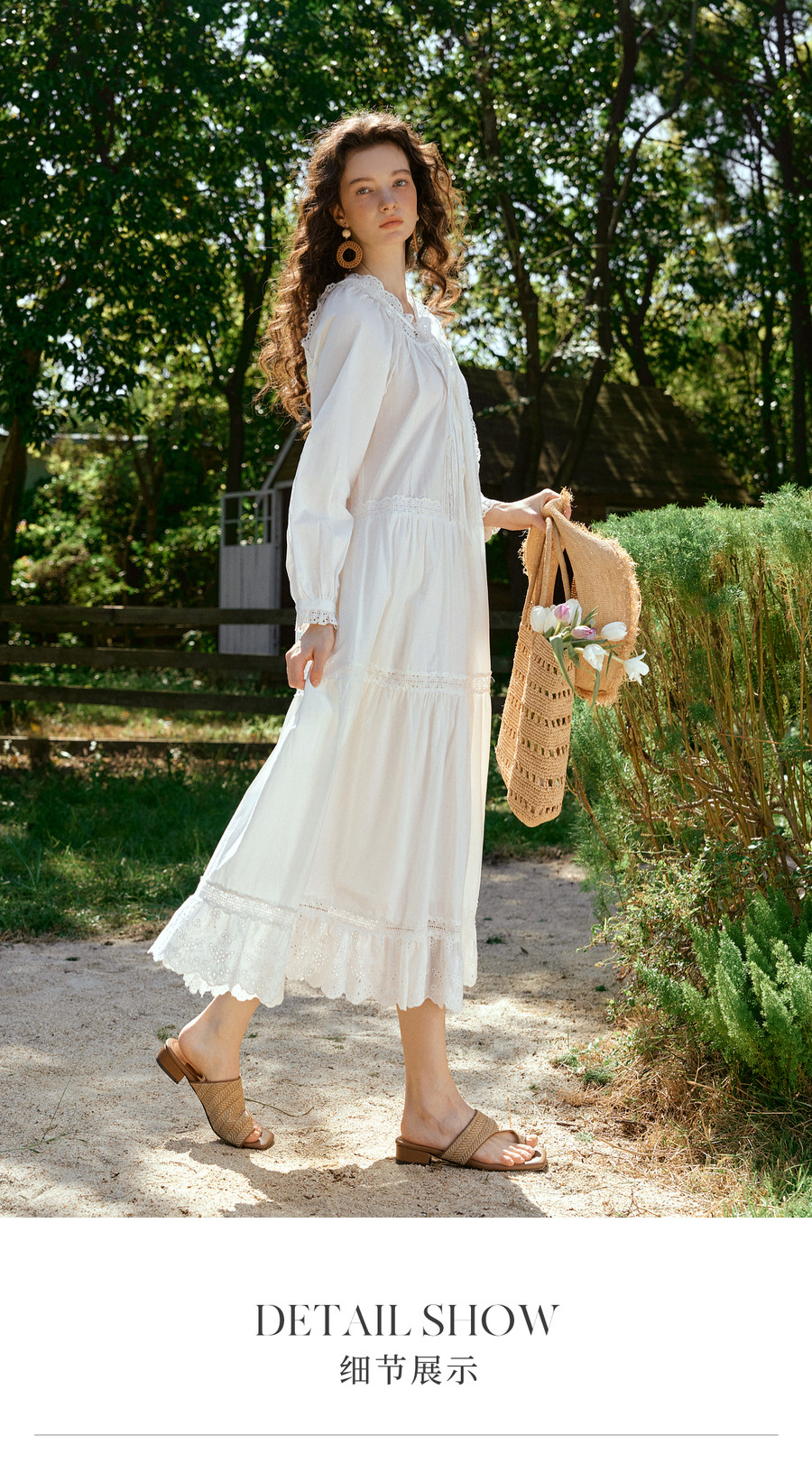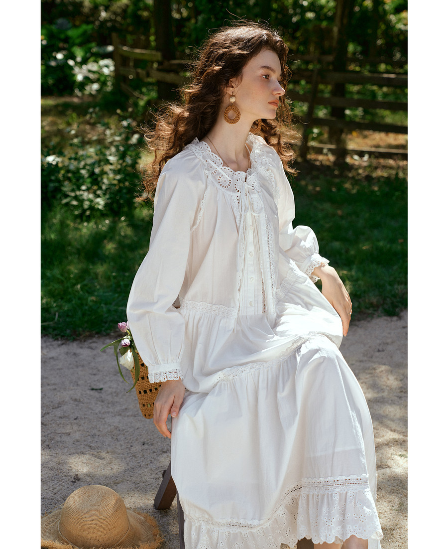 法式刺绣镂空花边领系带长袖连衣裙女春季休闲宽松显瘦白色长裙