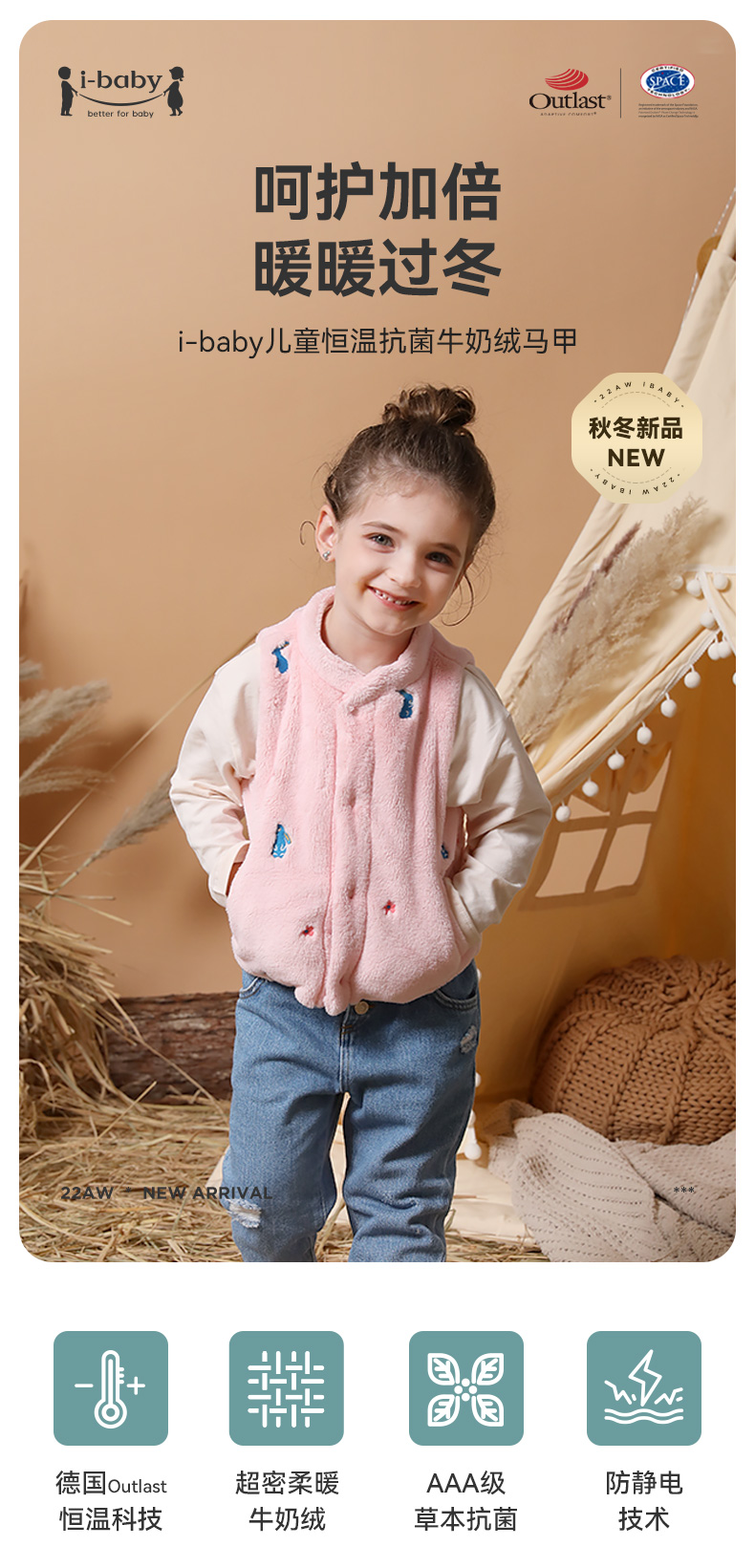 【秒杀】ibaby×outlast太空科技恒温抗静电牛奶绒立领马甲