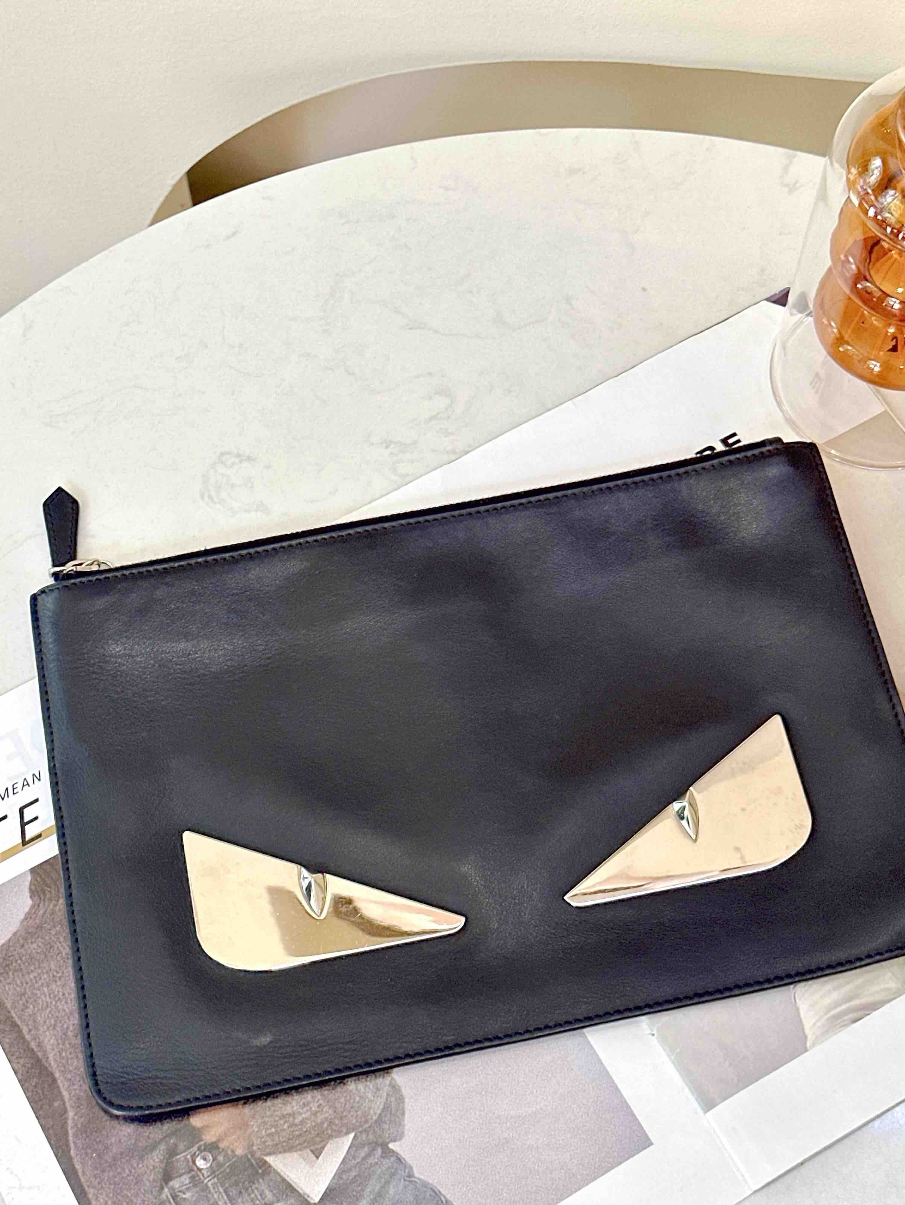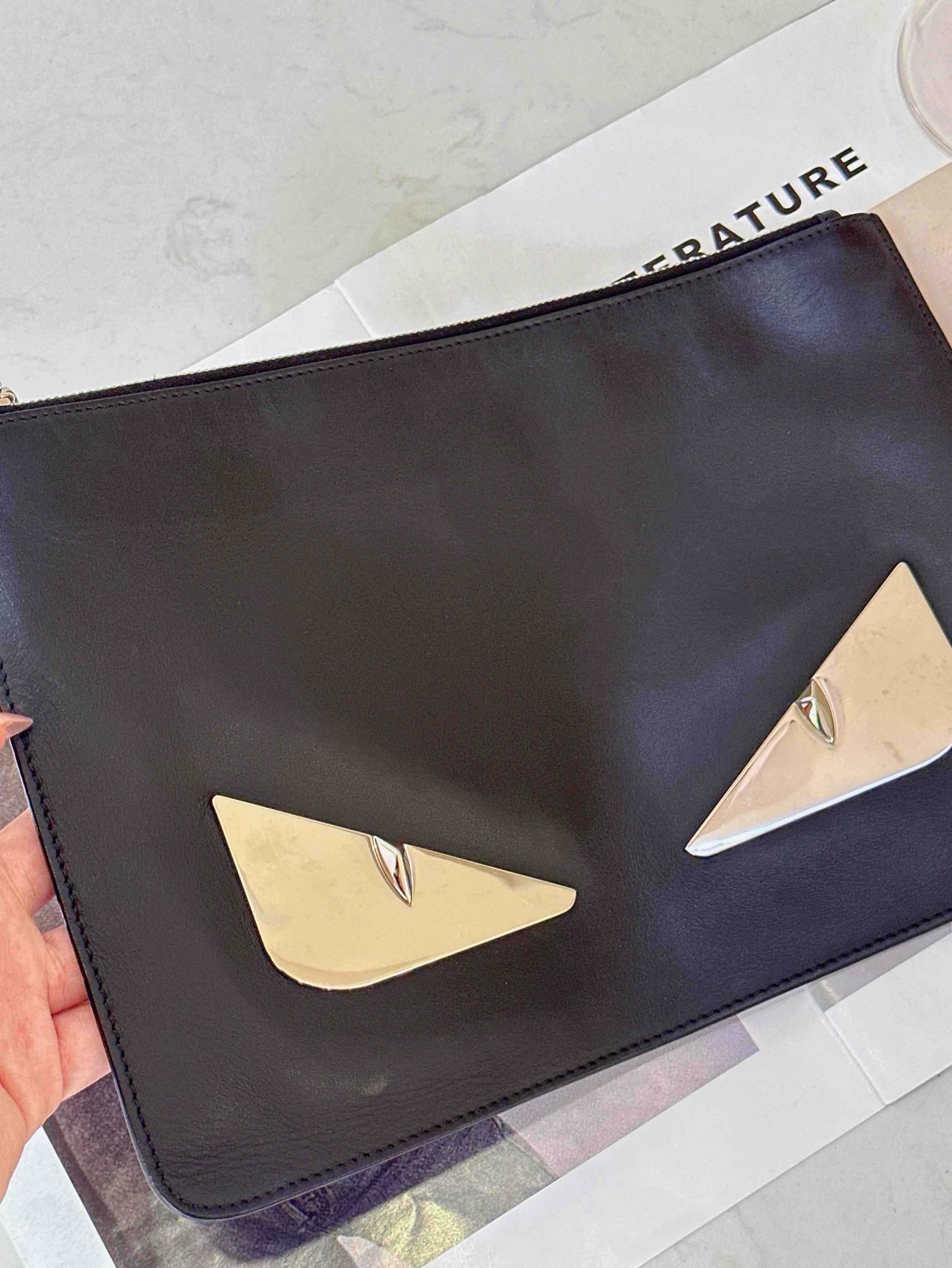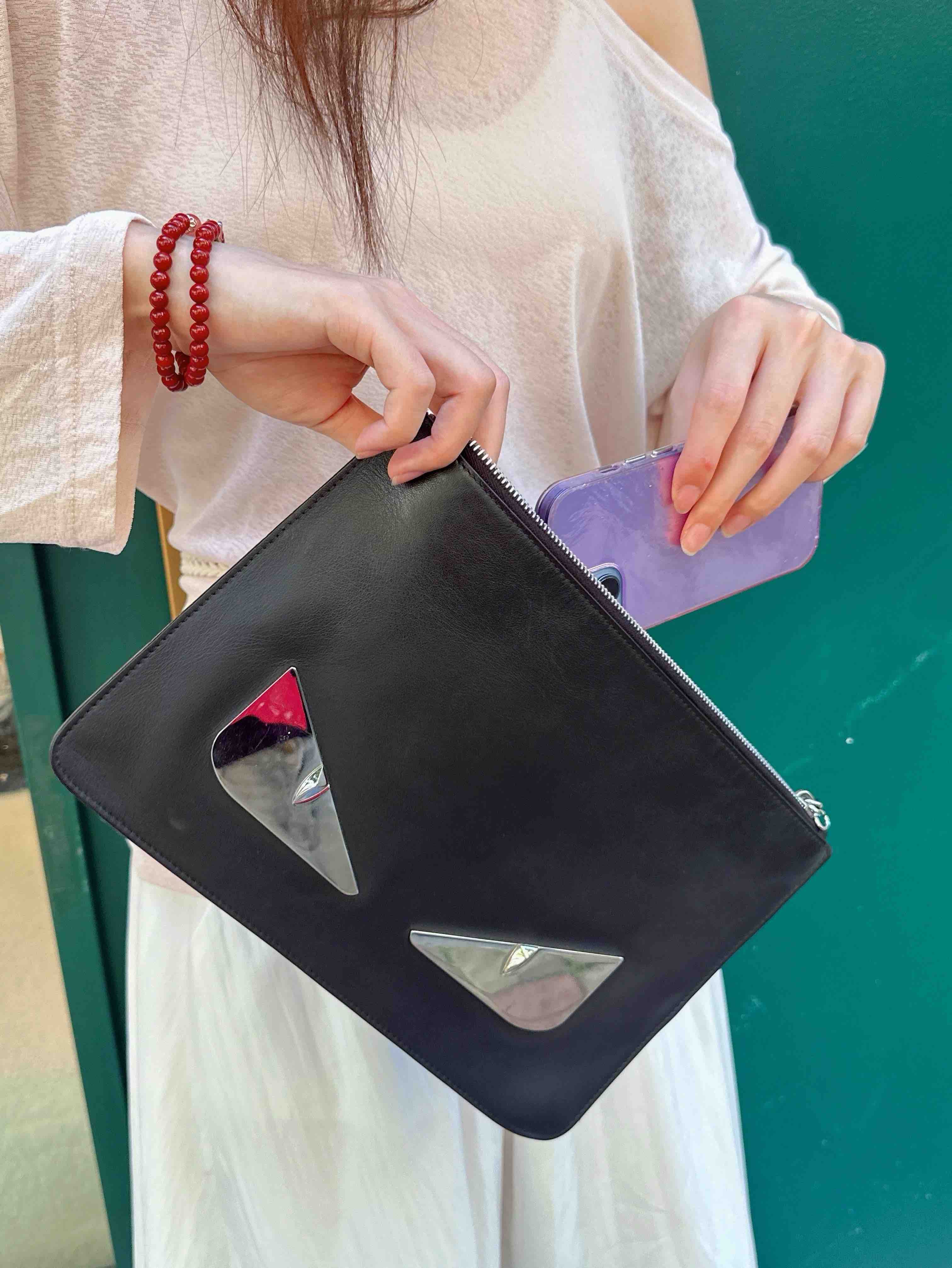 【商品詳情】正品二手 fendi 黑色 牛皮 金属 怪兽 手拿包🫐 93新 30*20。包面有正常使用压痕和折痕 五金处正常使用摩擦感。趣味手包