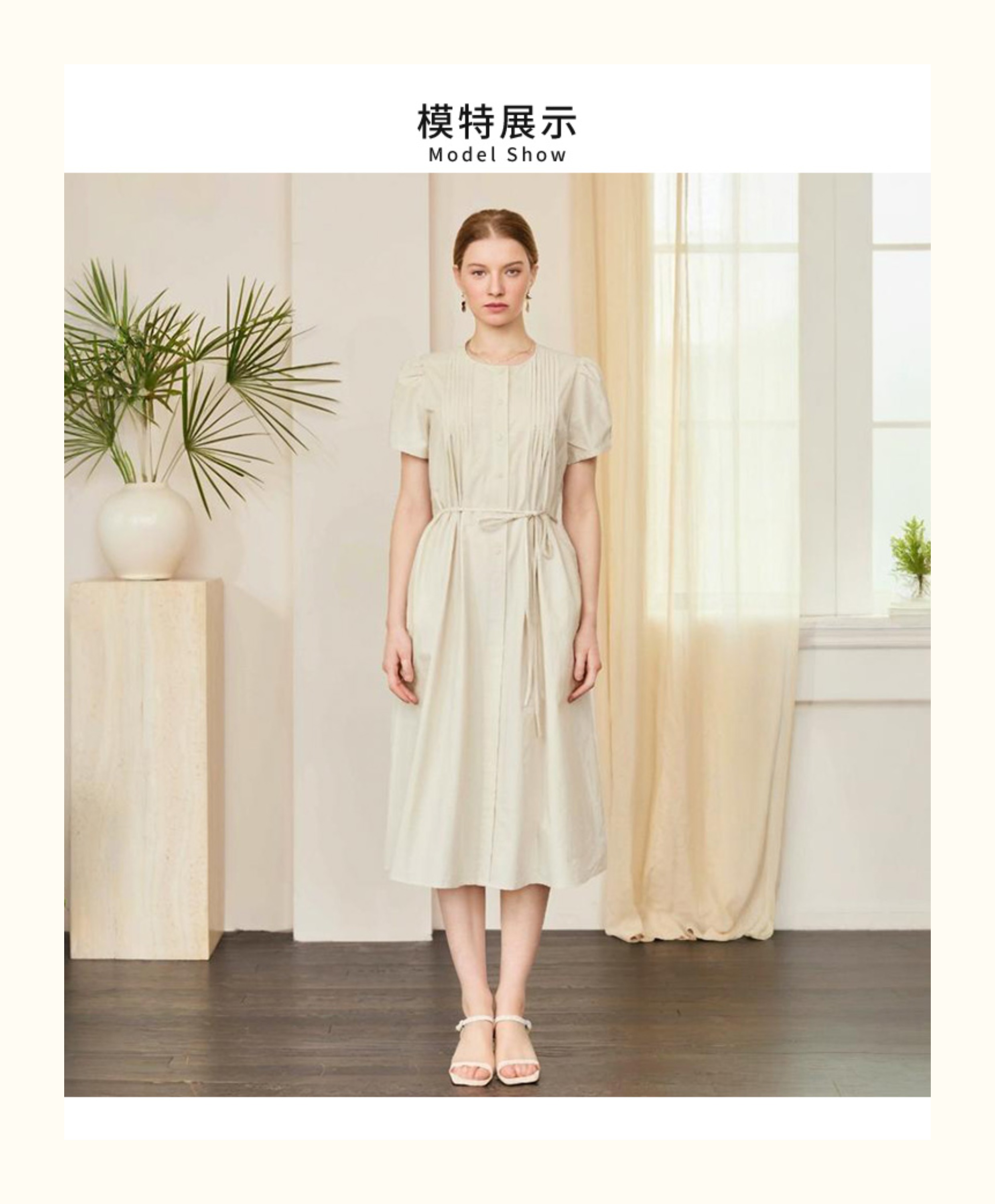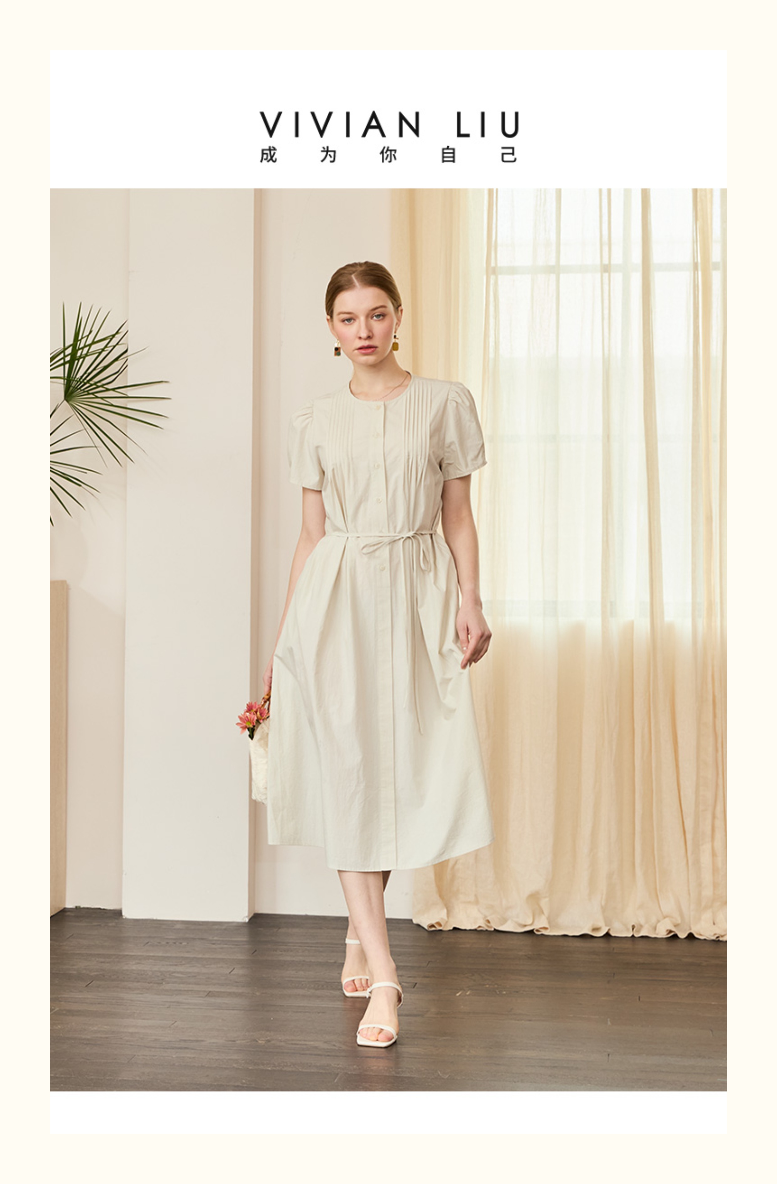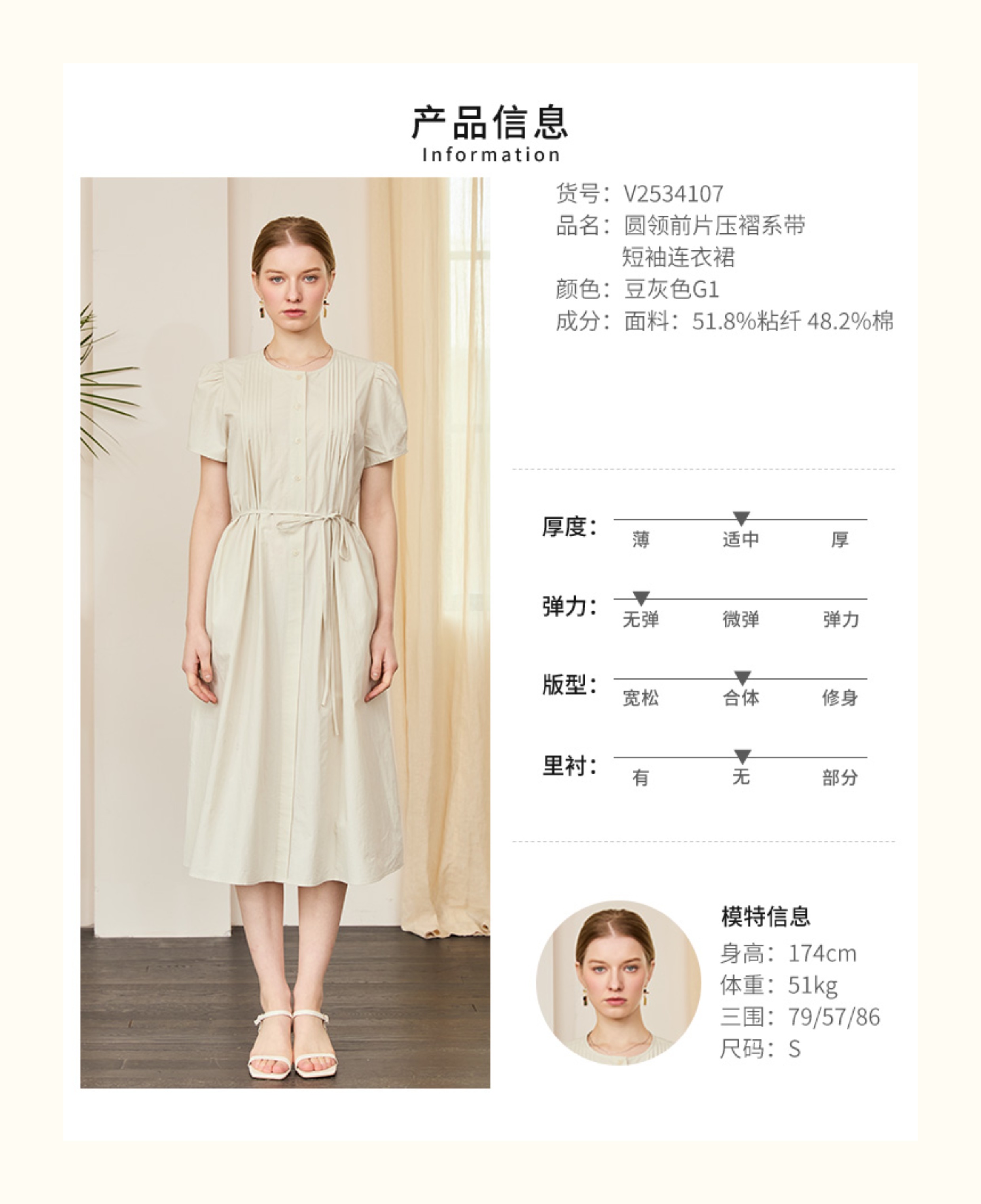 VIVIAN LIU V2534107 夏季女装圆领压褶系带系扣泡泡袖短袖连衣裙